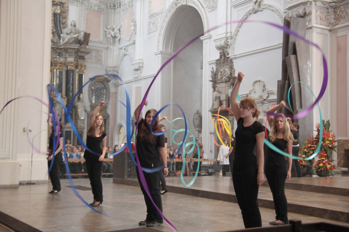 Mit besinnlichen Texten und einem Bändertanz verdeutlichten die Schülerinnen, dass der bunte Regenbogen Zeichen für Gottes Segen ist, für die lebendige Beziehung zu den Menschen und für den Segen, den die Menschen einander schenken können. Für die musikalische Gestaltung des Gottesdienstes sorgten die Band des Mädchenbildungswerks unter Leitung von Erhard Schumm, die Band der Fachakademie Sankt Hildegard unter Leitung von Christina Tauber-Gnango sowie Domorganist Professor Stefan Schmidt. Den Bändertanz führte der Grundkurs Sport der Kollegstufe 12 des Mädchenbildungswerks unter Leitung von Waltraud Senger auf. Das Regenbogenmobile fertigte die Kunstgruppe der Fachakademie Sankt Hildegard unter der Leitung von Ingeborg Müller.