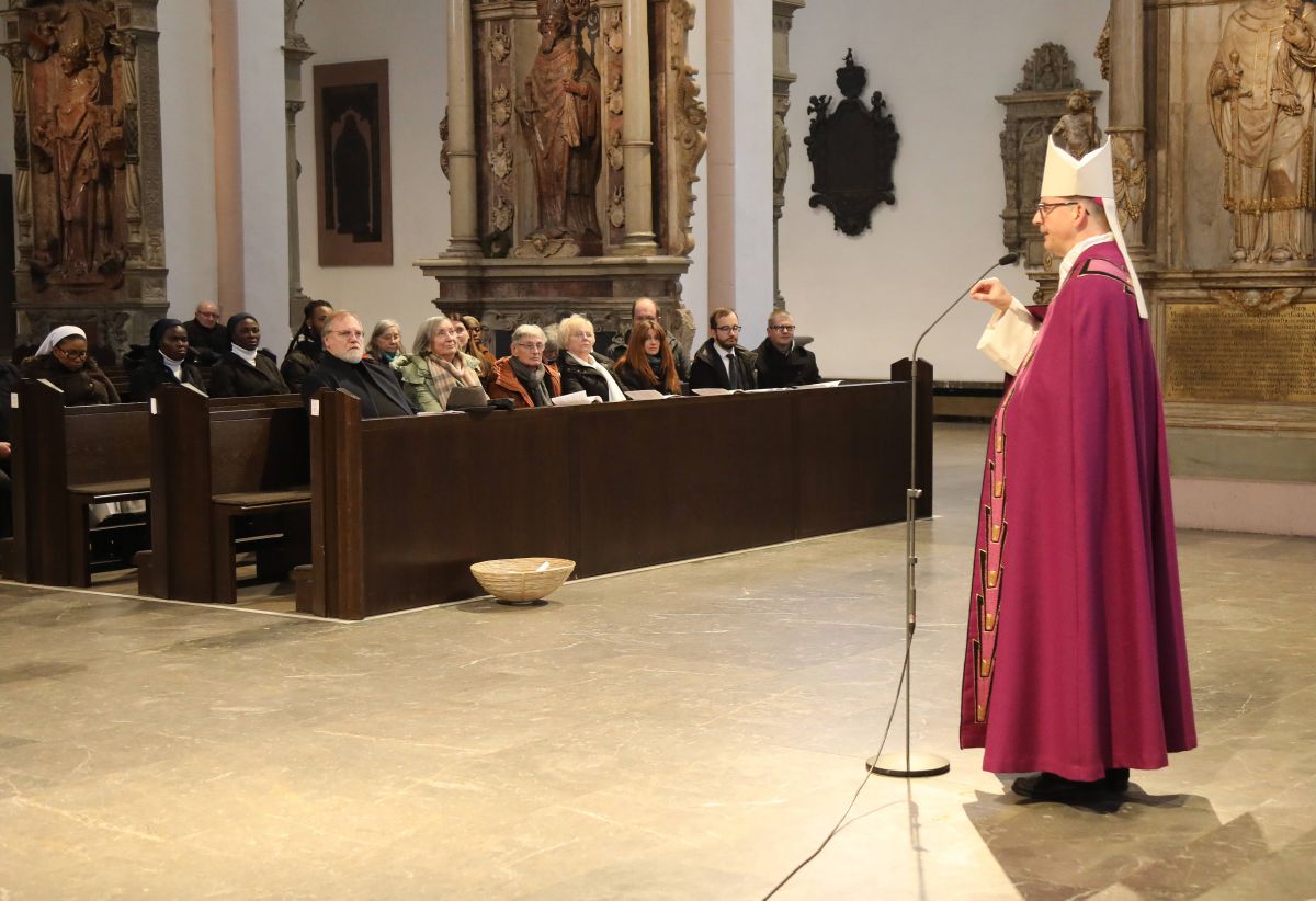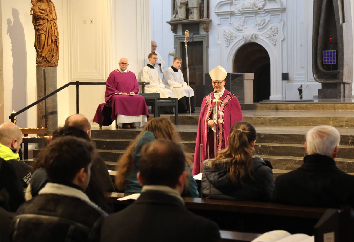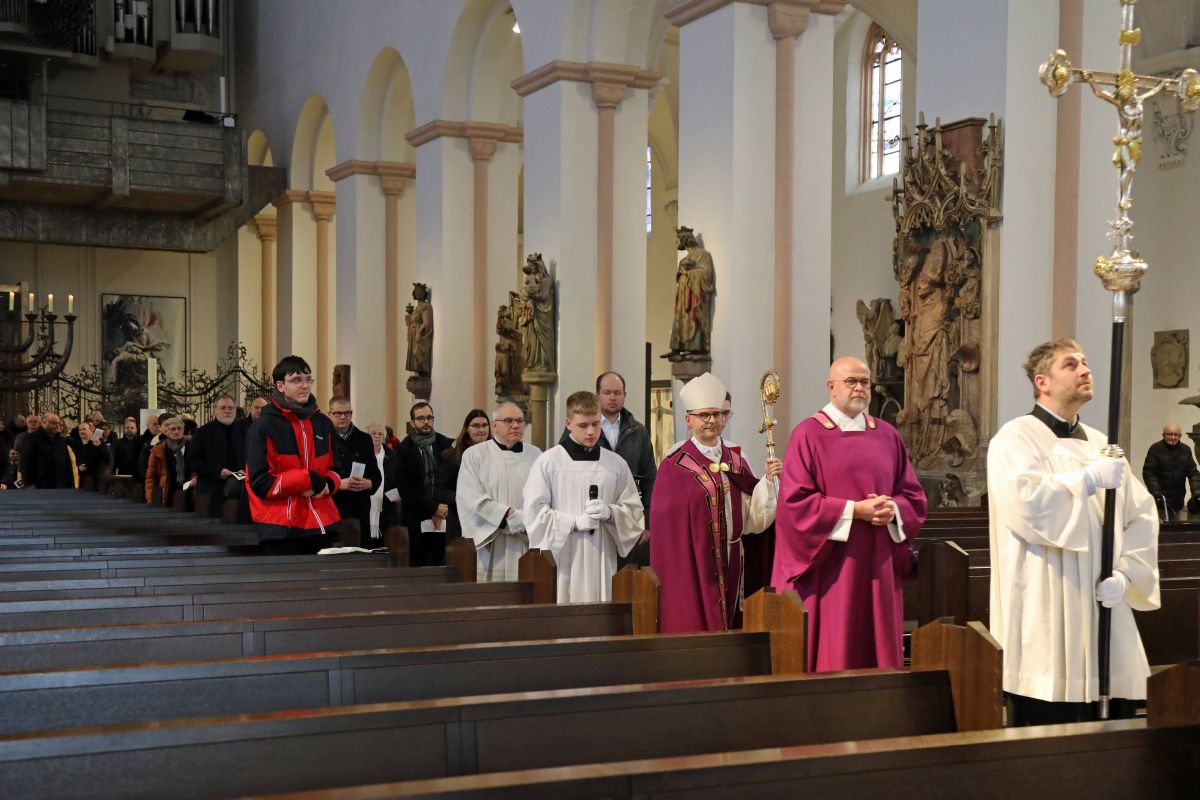 Bischof Jung begrüßte die Taufbewerberinnen und -bewerber sowie ihre Begleiter am Siebenarmigen Leuchter im Mittelgang. Vertreter der Heimatpfarreien der Taufbewerber legten vor dem Bischof Zeugnis ab, dass die Katechumenen den Kontakt zur Gemeinde suchen und sich in Glaubensfragen unterweisen lassen. Sie überreichten dem Bischof jeweils Empfehlungsschreiben für ihre Bewerber. Diese kommen aus Bad Kissingen, Bad Brückenau, Hösbach, Margetshöchheim, Schweinfurt und Würzburg. „Als Christ wird man nicht geboren, zum Christsein muss man sich entscheiden“, sagte Bischof Jung. Diese Entscheidung sei ein großer Moment: „Sie erinnert uns an unseren eigenen Weg und an die Frage: Warum hast du dich für Christus entschieden? Ich freue mich, dass Sie heute da sind. Danke, dass Sie diesen Weg gehen.“ In einer Prozession zogen die Katechumenen dann mit ihren Begleitern hinter dem Bischof in den Kiliansdom.