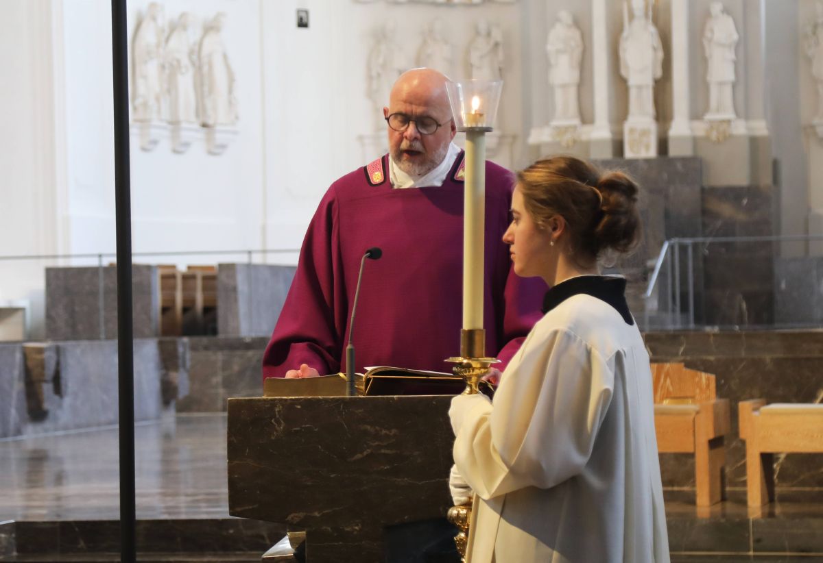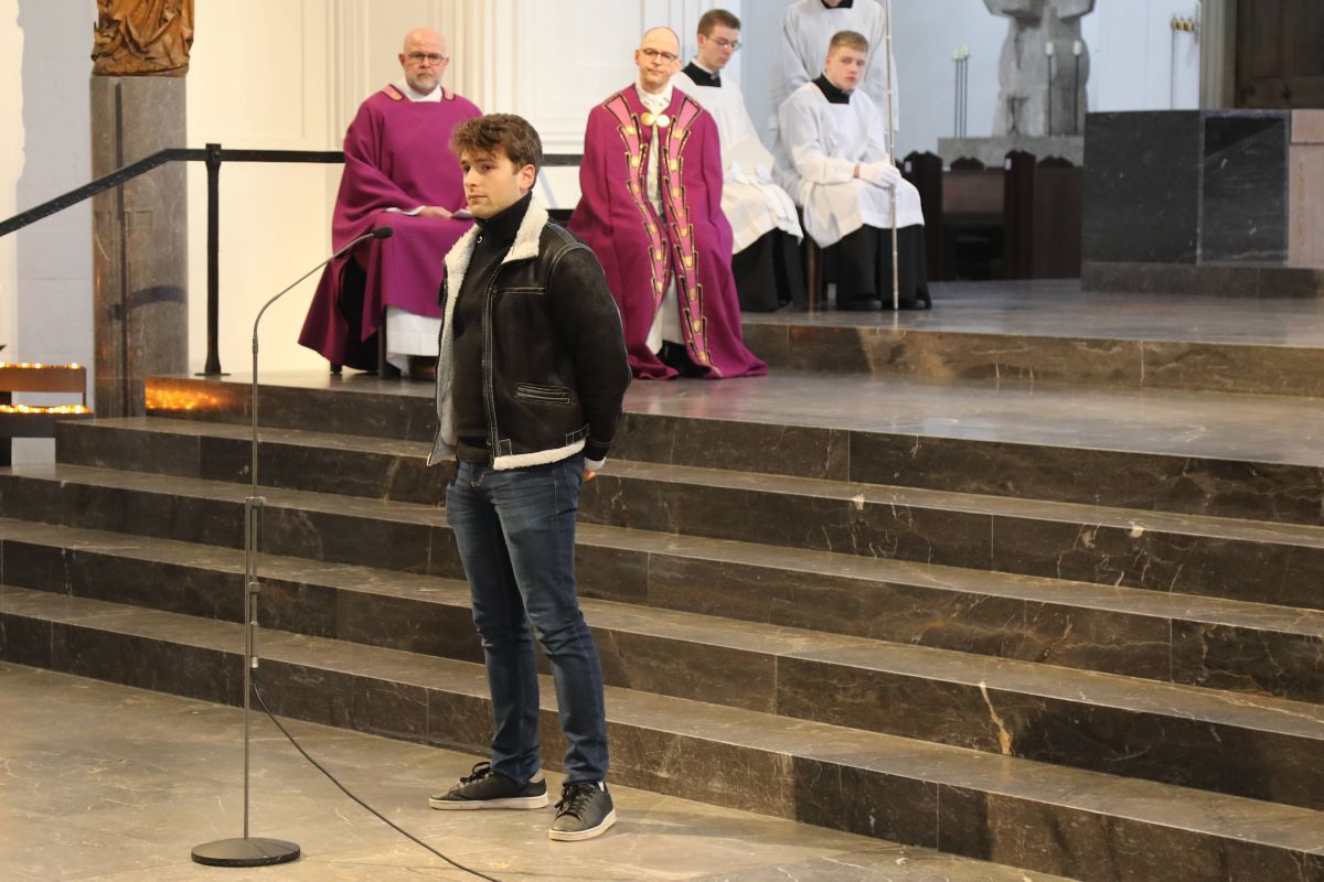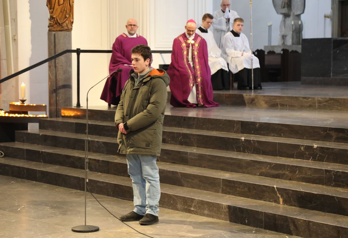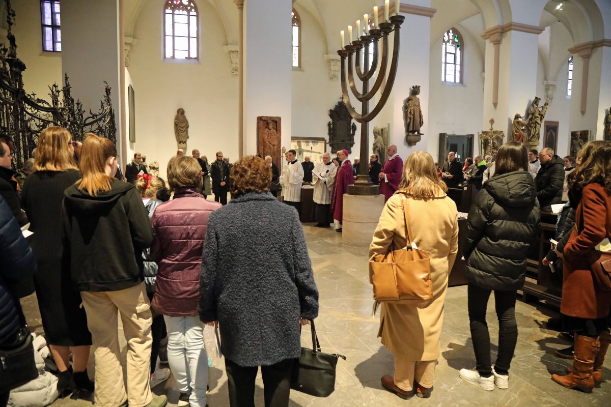 Bischof Jung begrüßte die Taufbewerberinnen und -bewerber sowie ihre Begleiter am Siebenarmigen Leuchter im Mittelgang. Vertreter der Heimatpfarreien der Taufbewerber legten vor dem Bischof Zeugnis ab, dass die Katechumenen den Kontakt zur Gemeinde suchen und sich in Glaubensfragen unterweisen lassen. Sie überreichten dem Bischof jeweils Empfehlungsschreiben für ihre Bewerber. Diese kommen aus Bad Kissingen, Bad Brückenau, Hösbach, Margetshöchheim, Schweinfurt und Würzburg. „Als Christ wird man nicht geboren, zum Christsein muss man sich entscheiden“, sagte Bischof Jung. Diese Entscheidung sei ein großer Moment: „Sie erinnert uns an unseren eigenen Weg und an die Frage: Warum hast du dich für Christus entschieden? Ich freue mich, dass Sie heute da sind. Danke, dass Sie diesen Weg gehen.“ In einer Prozession zogen die Katechumenen dann mit ihren Begleitern hinter dem Bischof in den Kiliansdom.
