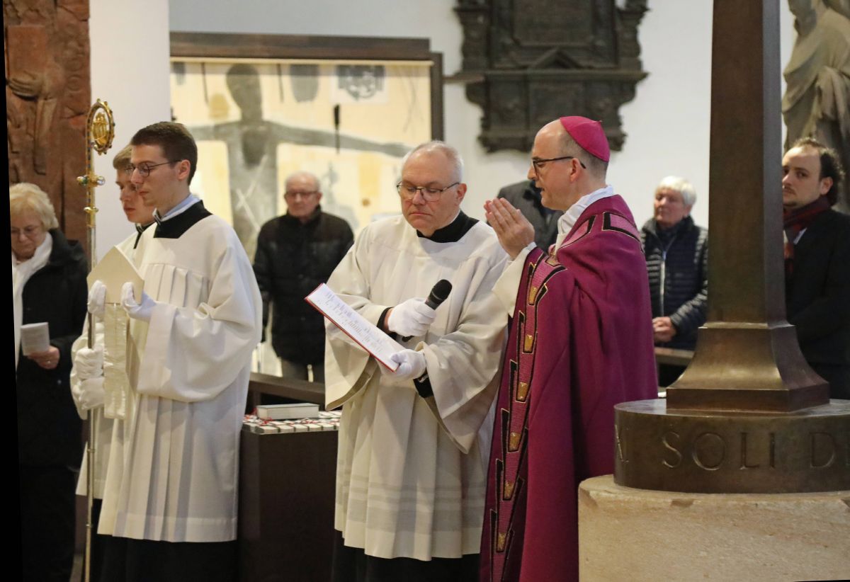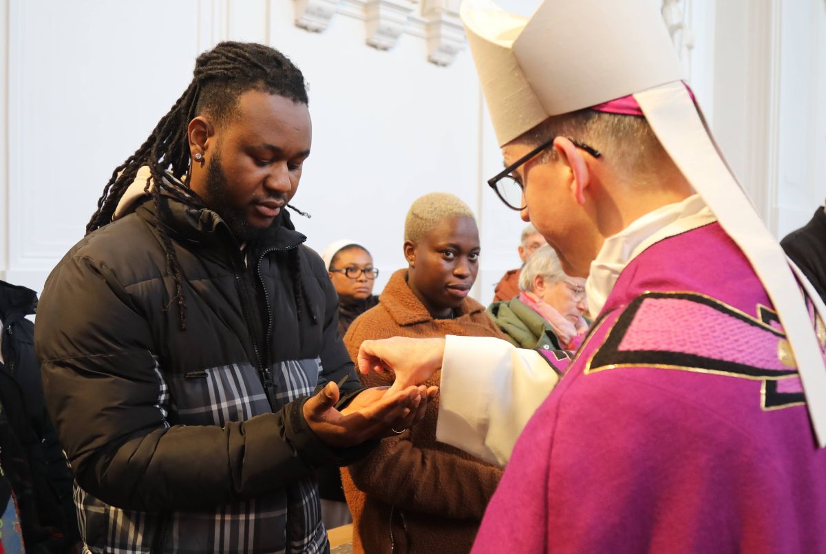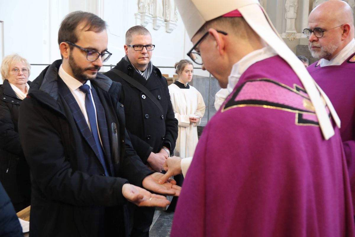 Würzburg (POW) Insgesamt neun Männer und Frauen aus sieben Pfarreien und Pfarreiengemeinschaften der Diözese Würzburg möchten in die katholische Kirche aufgenommen werden. Bischof Dr. Franz Jung erteilte ihnen am Sonntag, 26. Februar, im Würzburger Kiliansdom die Zulassung zu Taufe, Firmung und Eucharistie. Der Bischof salbte ihnen dazu die Hände mit Katechumenenöl und segnete sie. Nach mindestens einem Jahr der Vorbereitung werden sie an Ostern oder in der Osterzeit in ihren Heimatgemeinden in die Gemeinschaft der Kirche aufgenommen.