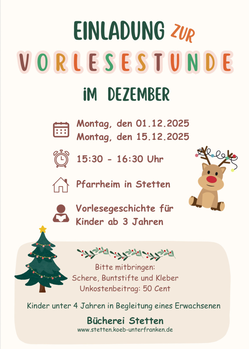 Am 15.12.2025 findet im Pfarrheim in Stetten unsere gewohnte Vorlesestunde statt.