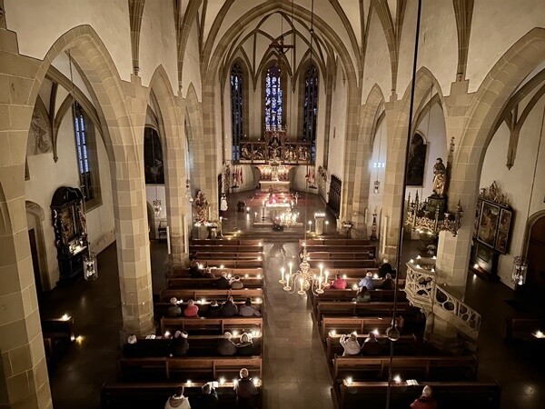 Ebenso an den fünf Ecken der Kanzel und auch auf der Emporebrüstung. Hinzu kommen Kerzen am Hochaltar und am Volksaltar. „Schließlich müssen Priester und Lektoren ja beim Gottesdienst etwas sehen.“ Adventliche Lieder standen denn auch am Samstagmorgen auf dem Liedzettel und Pfarrer Stephan Frank hatte das Thema "Türen auf" gewählt. Auch in der Stadtpfarrkirche sind solche Rorategottesdienste nach wie vor eine Besonderheit, die im Advent besondere Stimmung hervorruft.