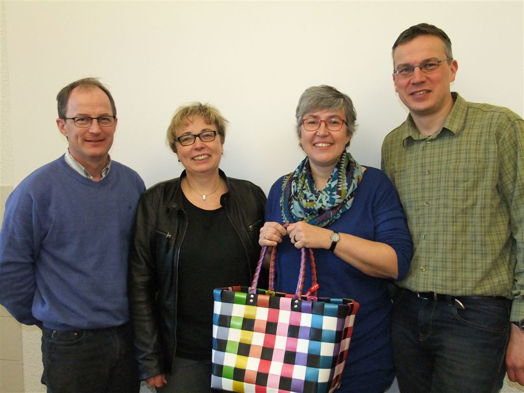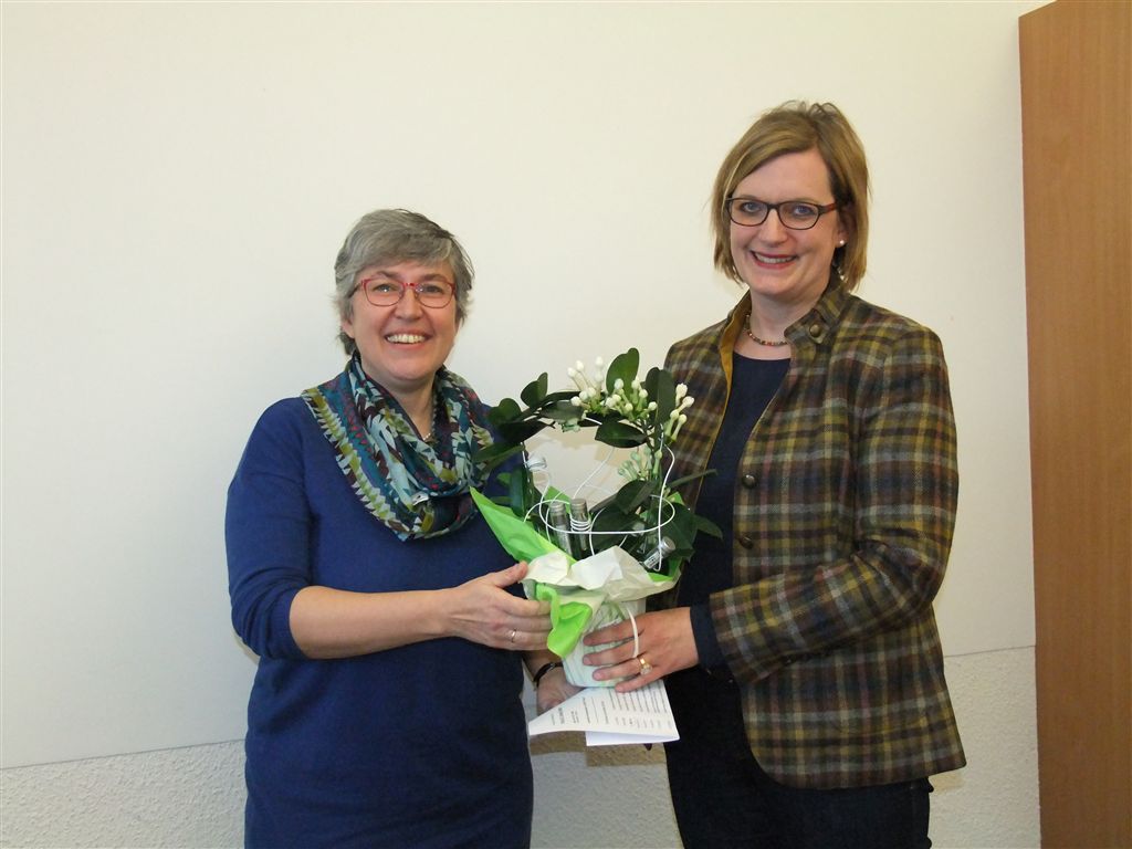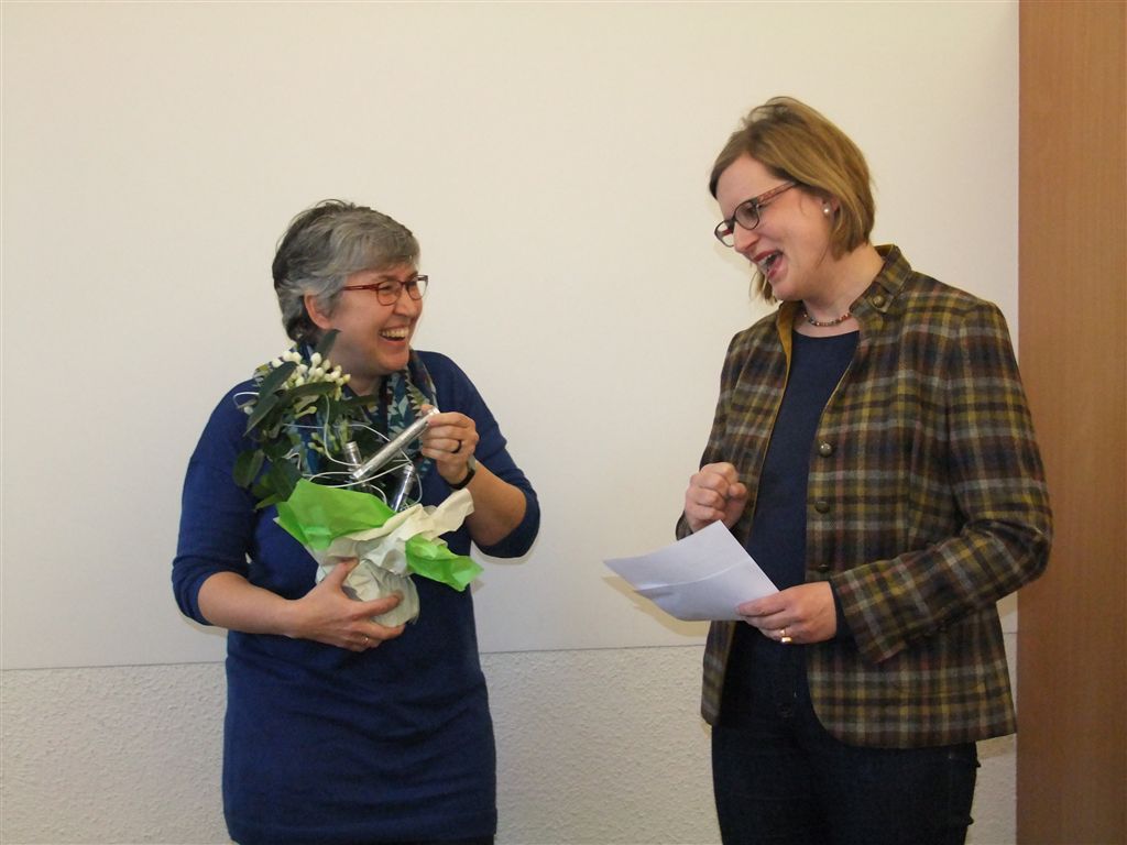 Seitens des Dienstgebers bedankten sich Personalleiter Ordinariatsrat Thomas Lorey und die Arbeitsrechtsreferentin Anja Schuler bei der scheidenden Schriftführerin. Sie überreichten Silber Blumen mit drei darin versteckten Kugelschreibern. Neben dem Kuli mit normaler Miene einen mit kurzer Miene, als Erinnerung an die oft langen Protokolle und einer ohne Miene für all das, was außerhalb des Protokolls gesprochen wurde.