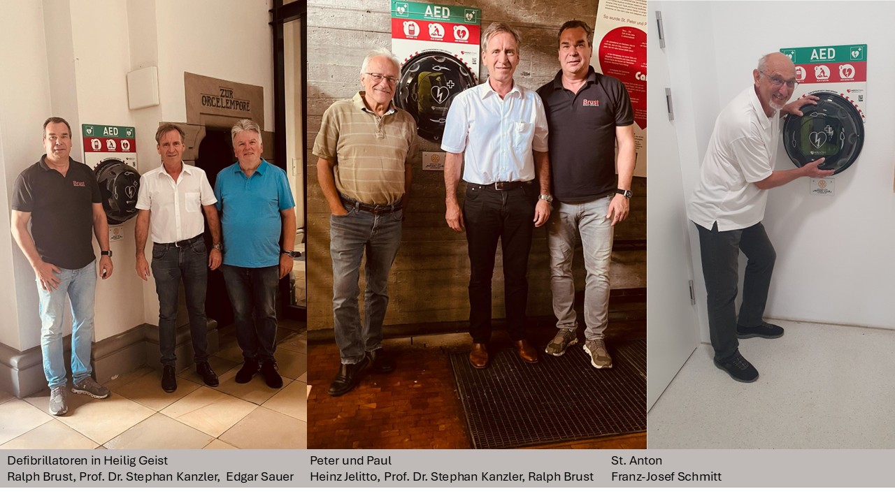 Da ist schnelles Handeln erforderlich und die nötigen technischen Hilfsmittel, damit schlimmer Schaden vermieden werden kann. In vorbildlicher Zusammenarbeit mit dem Rotary Club Schweinfurt und Prof. Dr. Stephan Kanzler (Pastpräsident des Rotary Club Schweinfurt) wurden nun dazu drei Defibrillatoren in den katholischen Schweinfurter Kirchen installiert. Gespendet vom Rotary Club Schweinfurt (inkl. 4jähriger Wartung) ist das ein wichtiger Anschubimpuls für die Kirchen Heilig Geist, Peter und Paul und St. Anton. Montiert und technisch betreut werden sie dort von Edgar Sauer, Heinz Jelitto und Franz-Josef Schmitt. Prof. Dr. Stephan Kanzler wird die Einweisung in den richtigen Umgang mit den Geräten übernehmen. Ein herzliches Dankeschön an Spender, Realisierer und Kümmerer, dass hiermit diese vielleicht lebensrettende Vorsorgemaßnahme auch in den Kirchenräumen zur „Herzenssache“ geworden ist.