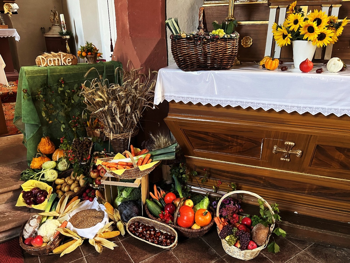 Segensgebet: „Gepriesen bist du, Herr unser Gott, Schöpfer der Welt. Du hast dem Weltall eine Ordnung gegeben, die wir erkennen und bewundern. Du hast den Menschen dazu bestimmt, sich die Erde untertan zu machen, sie zu bebauen und ihren Reichtum recht zu nutzen. Wir freuen uns heute über die Ernte dieses Jahres und bitten dich: Segne + diese Früchte und Gaben, die wir dankbar aus deiner Hand empfangen haben. Lass auch die Armen und Hungernden den Reichtum deiner Güte erfahren und teilhaben an der Fülle deiner Gaben. Darum bitten wir durch Jesus Christus, deinen Sohn, unsern Herrn und Gott, der in der Einheit des Heiligen Geistes mit dir lebt und herrscht in Ewigkeit. Amen.“