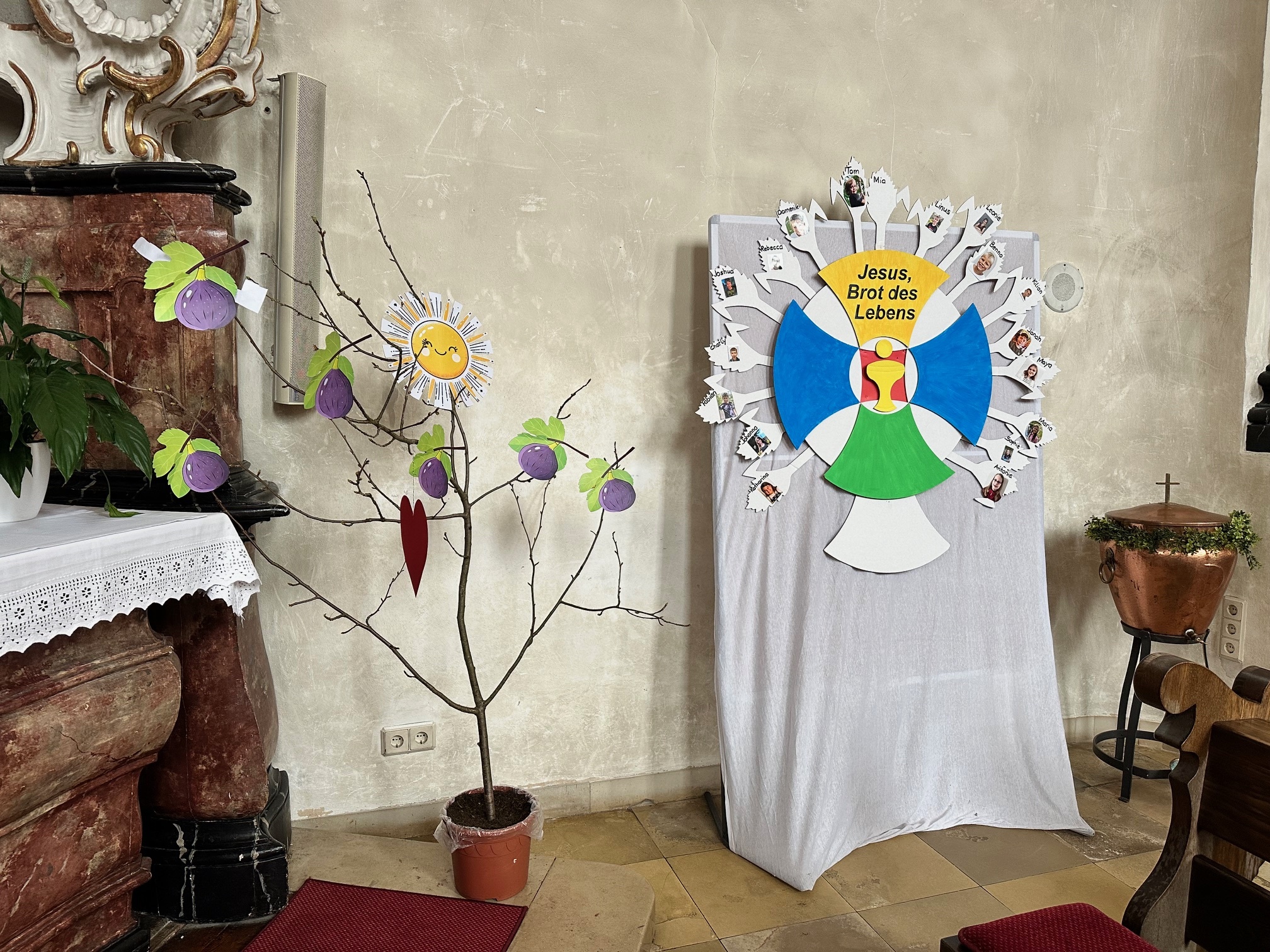 Der Baum steht nun neben der Tafel der Kommunionkinder in der Kirche und bleibt damit ein Zeichen für das, was wir gemeinsam im Gottesdienst erfahren haben: Gott gibt uns immer wieder eine neue Chance, zu wachsen und uns weiterzuentwickeln – so wie der Feigenbaum im Evangelium.
