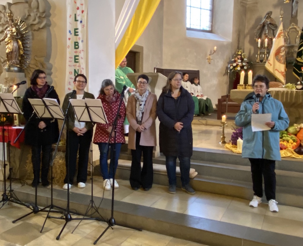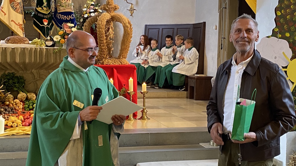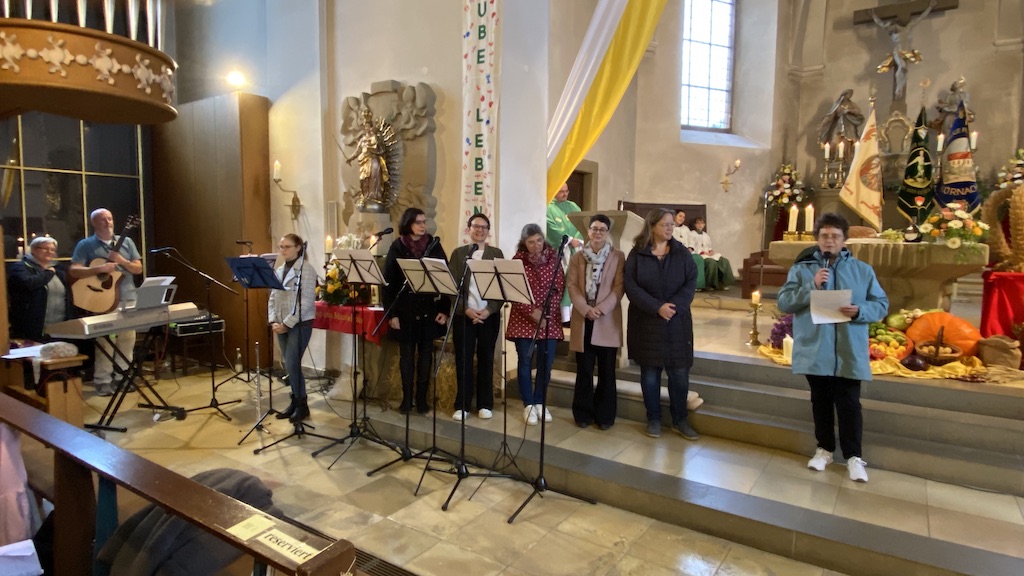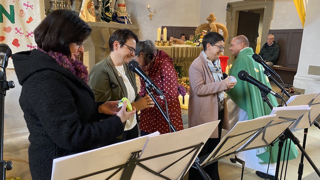 Zum Abschluss des Gottesdienstes verabschiedete sich das Familiengottesdienst-Team, das über viele Jahre hinweg die Vorbereitung organisiert hatte. Es bat darum, dass sich vielleicht junge Familien mit ihren Kindern künftig in die Gestaltung einbringen. Als Anerkennung für ihr langjähriges ehrenamtliches Engagement überreichte Pfarrer Joachim Bayer dem Team ein kleines Präsent.