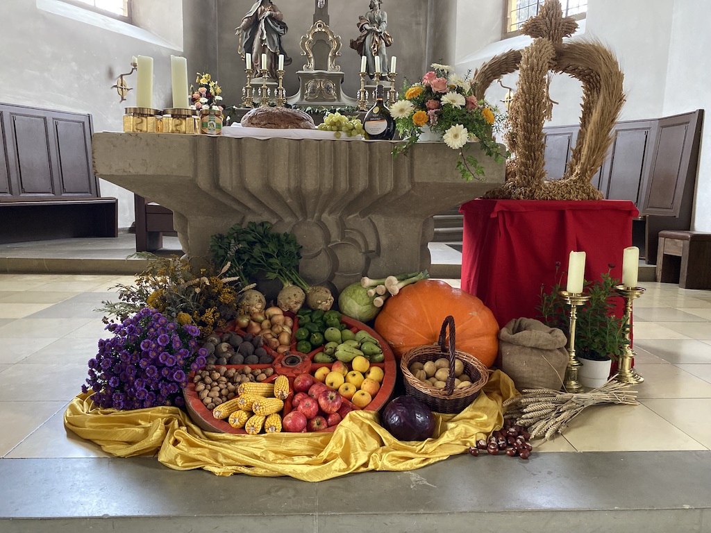 Anschließend haben die Vorschulkinder noch zum Herbstmarkt des Kindergartens eingeladen. Der wetterbedingt ins Pfarrzentrum verlegt werden musste, da wurden frisches Obst und Gemüse, Federweißer, Zwiebelkuchen und fränkische Schmankerl angeboten