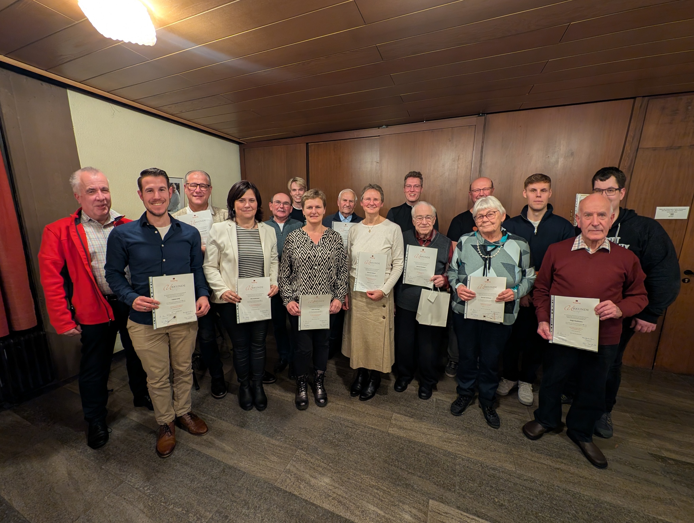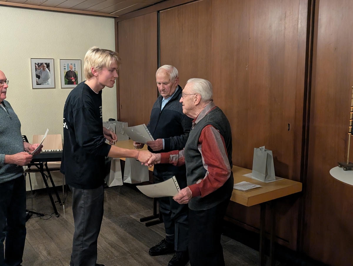 Zu Beginn der Feier im Roncallihaus gedachte Kassier Franz-Josef Heusinger dem im vergangenen Jahr verstorbenen Ehrenpräses Msgr. Dr. Benno von Bundschuh, der 2023 noch für 25 Jahre Mitgliedschaft geehrt werden konnte. Nach einer adventlichen Besinnung mit gemeinsam gesungenen Adventsliedern konnte Paul Zimmer drei neue Mitglieder in der Kolpingsfamilie Stadtlauringen willkommen heißen: Ruthard Braun, Simon Heid und Leon Schindler.