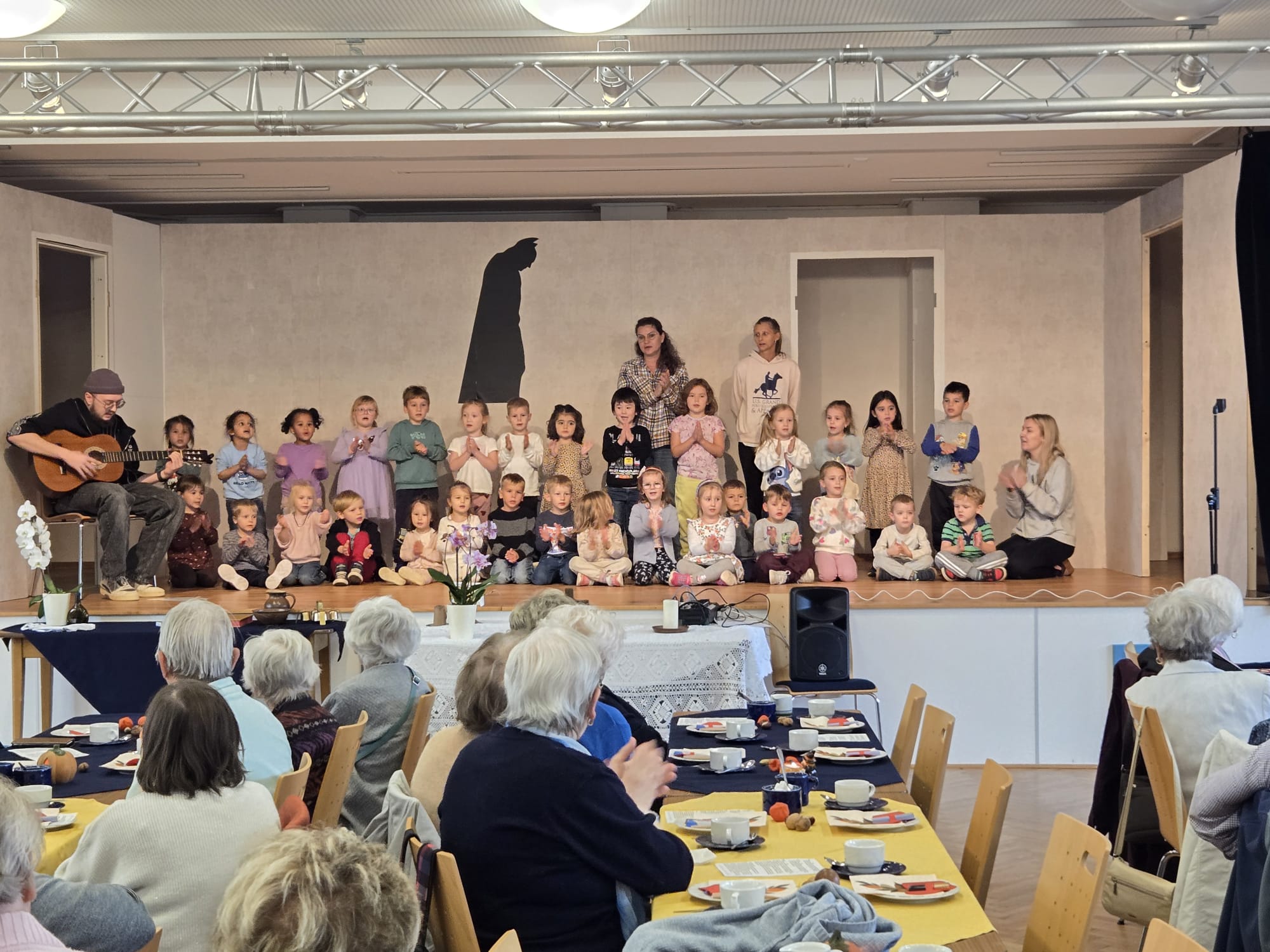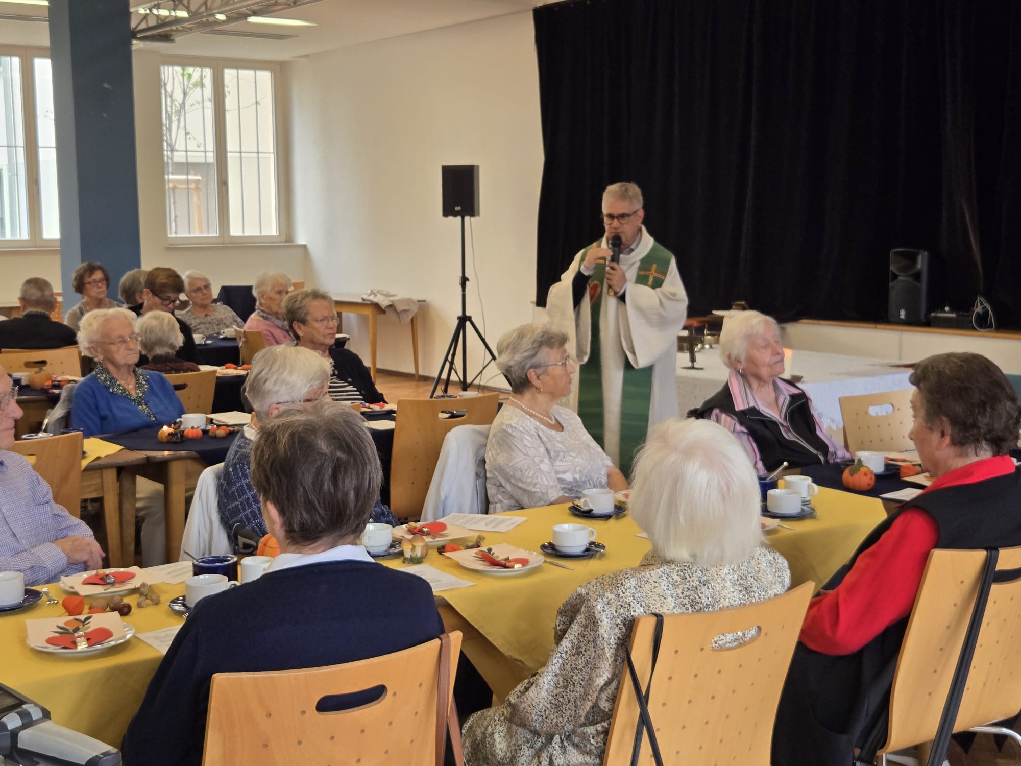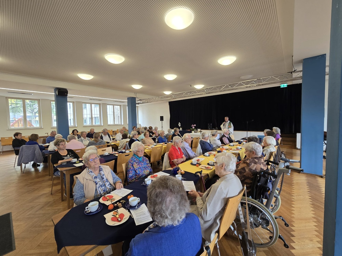 Pfarrer Stephan Eschenbacher zelebrierte den von Herrn Gerber musikalisch begleiteten Gottesdienst. In seiner Predigt unter dem Motto DANK, ging er auf die Situation der Jubilare ein und verglich deren Leben mit einem Haus mit verschiedenen Zimmern für unterschiedliche Aktivitäten und Zeiten. In jedem Lebensabschnitt gibt es Begegnungen, manche bestehen über eine lange Zeit, andere enden, Es tut gut sich an schöne Momente zu erinnern, an die eigene Jugend, die Familie und den Besuch der Kinder oder Enkelkinder. Mädchen und Buben aus dem Kindergarten Maria Hilf sangen Geburtstagslieder und tanzten dazu. Der lautstarke Applaus zeigte die große Freude an den Vorführungen. Mit einem süßen Dankeschön wurden die Kleinen wieder verabschiedet.