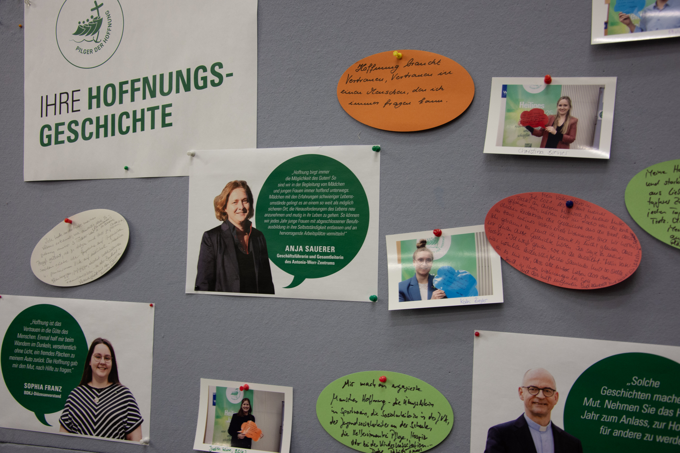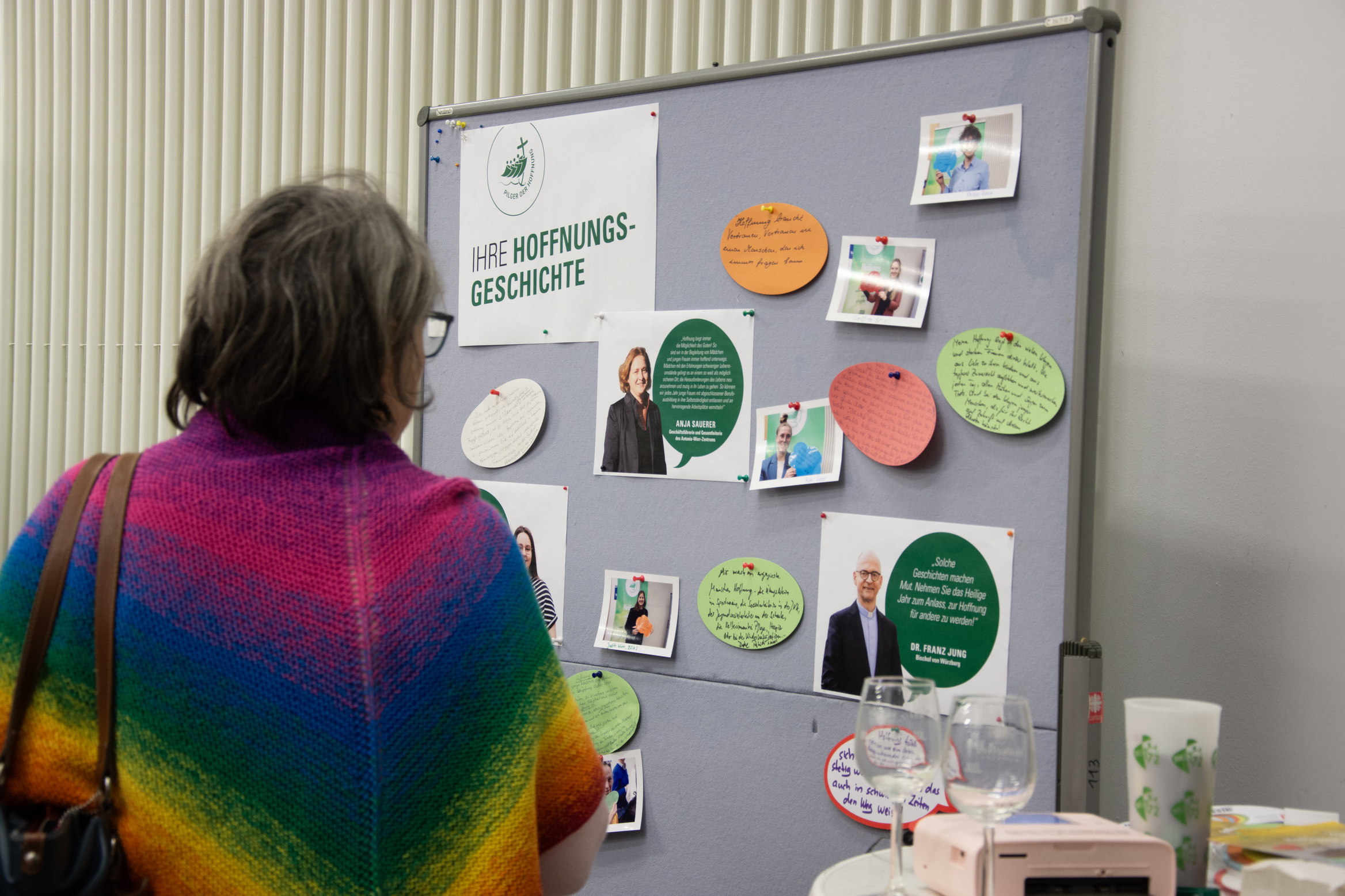 Den diesjährigen Neujahrsempfang der Diözese Würzburg, zu dem Bischof Dr. Franz Jung, die Domschule und der DiCV gestern in das Zentrale Hörsaal- und Seminargebäude der Julius-Maximilians-Universität Würzburg geladen hatten, nutzten Judith Wünn, Christiane Holtmann, Christina Birner und Sabrina Göpfert, Referentin Jugend und Familie im DiCV, für einen ersten persönlichen Aufschlag in Sachen Hoffnungsgeschichten. Mit Kamera, Informationsflyern, bunten Blättern und Stiften ausgestattet, luden sie die rund 1200 geladenen Gäste dazu ein, ihre Geschichten direkt vor Ort zu teilen. Einige nahmen diese Gelegenheit wahr und pinnten ihre niedergeschriebenen Hoffnungserfahrungen an die dafür bereitgestellten Stellwände. „Eine besondere E-Mail hat mir heute Hoffnung gemacht“, war darauf beispielweise zu lesen. Genau solch eine Erfahrung kann einer dieser manchmal so kleinen und vermeintlich unbedeutenden Momente im Alltag eines Menschen sein, der Hoffnung und Zuversicht schenkt und damit in die Welt getragen werden soll, so die einhellige Meinung der Hoffnungsgeschichtensammlerinnen.
