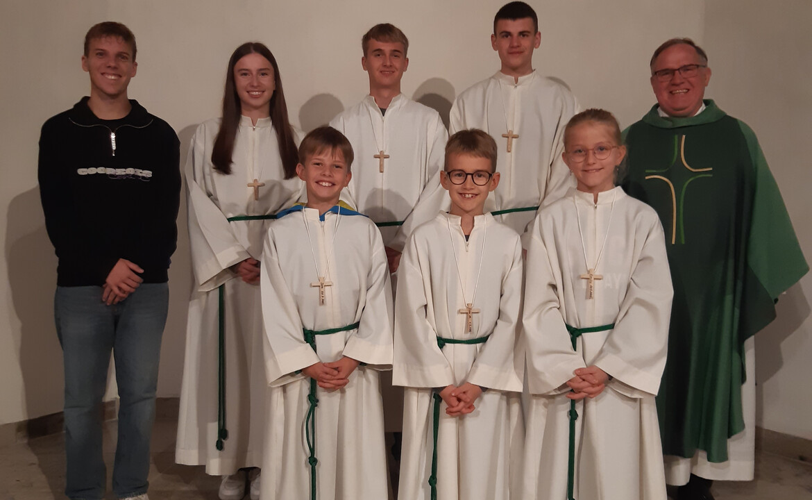Das Gemeindeteam hatte dazu eingeladen. Die wunderschön renovierte Kirche St. Vitus gab dazu den pasenden festlichen Rahmen. In diesem Jahr wurde der Festgottesdienst zudem als „Konzert-Gottesdienst“ gestaltet. Kantor Tyron Kretzschmar aus Lohr begleitete die Gemeindegesänge und gab einige Orgelstücke zum Besten, die er zuvor mit erklärenden Worten einleitete. Pfarrer Stefan Redelberger und Ministranten-Beauftragter Luis Herrmann verabschiedeten vier lang gediente MinistrantInnen: Maria Laudenbacher, Simon Schmelz, Hannes van Gülick und David Schreck (nicht auf dem Bild). Ebenfalls unter lautem Applaus begrüßte die Gemeinde vier neue MinistrantInnen: Emelie März, Toni März, Tom Freund und Mathilda Stürmer (nicht auf dem Bild). Anlässlich der Kirchenrenovierung malte die damalige 3. Klasse der Karbacher Grundschule im Frühjahr die Karbacher Kirche im Stil des Malers Hundertwasser. Diese schönen Bilder sind nun im Oktober in der Kirche ausgestellt und können besichtigt werden.