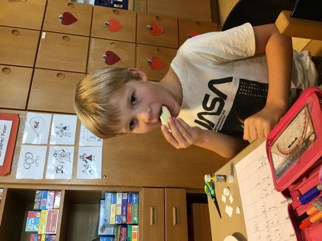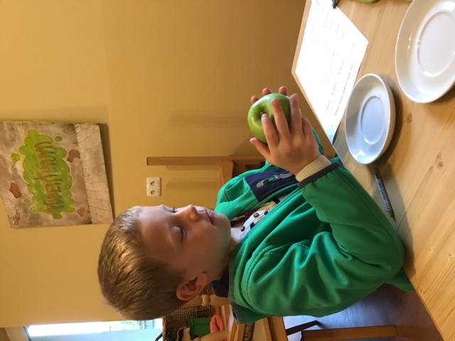 Anhand eines Apfeltasting konnten die Kinder drei verschiedene Apfelsorten probieren. Sie hatten die Möglichkeit den Unterschied vom Elstar, Granny Smith und Gala zu testen. Den meisten Kinder schmeckte der Granny Smith am besten, weil er so säuerlich war. Zum Nachtisch gab es auch im Hort selbstgebackenen Apfelkuchen und eine Woche später Apfelcrumble mit Vanillesoße.