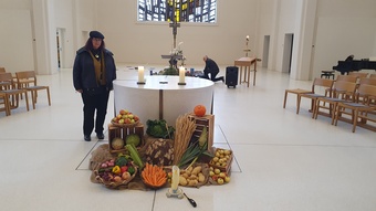 Eva-Maria Oettinger und Gabi Treutlein stellten bei der Katechese für die Kinder den Dank für ganz alltägliche Dinge in den Vordergrund - den Dank für ein schönes und gelingendes Leben. In einer Bastelaktion mit Eva-Maria Oettinger durften die Kinder Serviettenringe mit all den Dingen beschriften, für die sie dankbar sind.