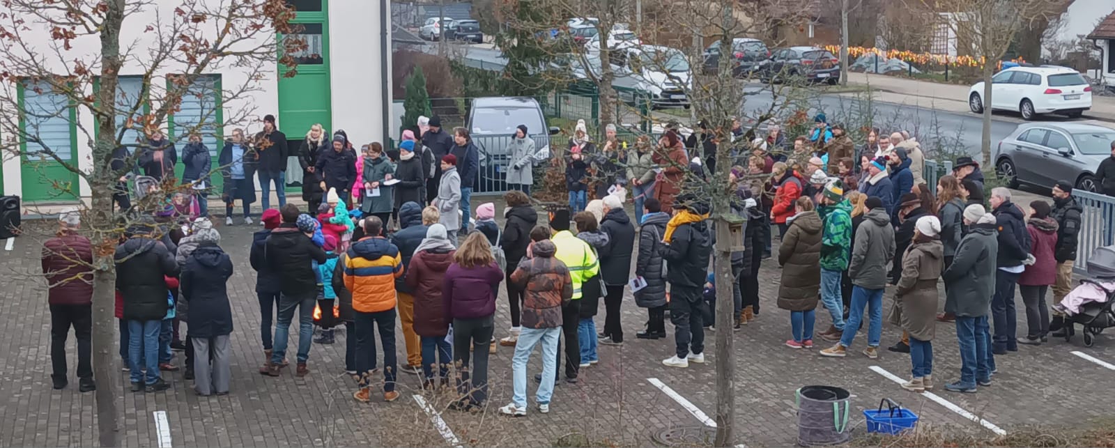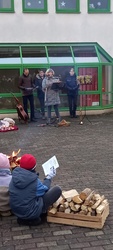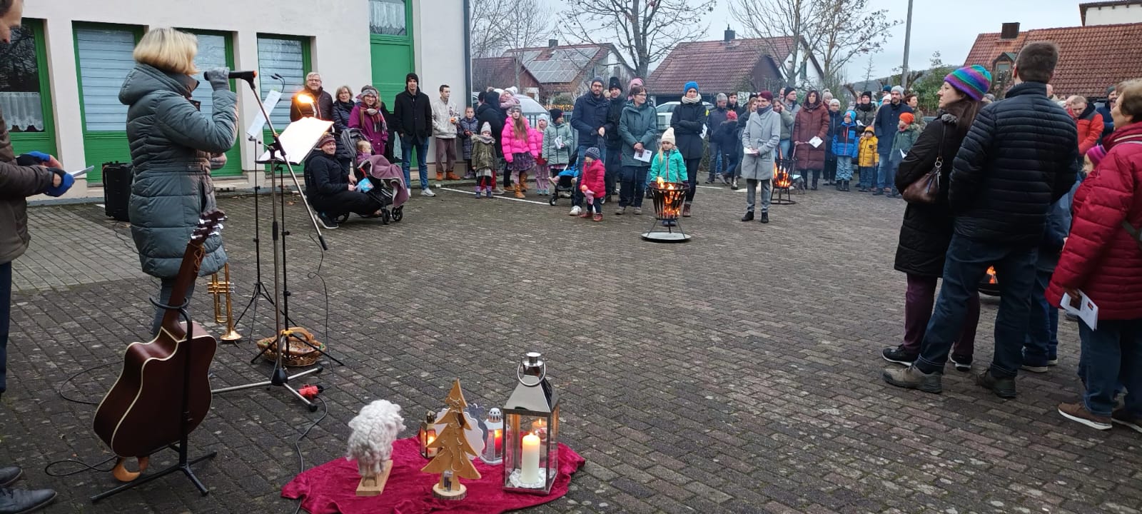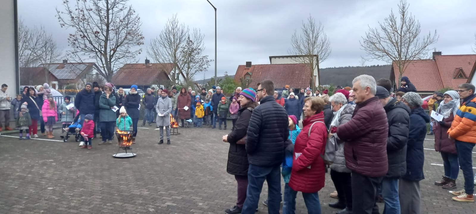 Und genau das ist in diesem Jahr perfekt gelungen.Weit über 100 Besucher versammelten sich um 16.00 Uhr um die Hirtenfeuer vor der KiTa St. Elisabeth (Eselshöhe). Gabi Treutlein, Gerhard Treutlein, Martina und Joachim Werb und Marius Grabsch (Trompete) hatten alles vorbereitet, damit sowohl Stimmung (Feuer, Deko, Liedblätter) wie auch Inhalte (eigens dafür entworfene Geschichte von Martina Werb, Gebete, Meditation) und sogar ein kleines Geschenk für die über 30 Kinder einfach "da" waren. Konzentriert und gespannt lauschten junge und auch ältere Ohren der Geschichte des Holzschnitzers Geppetto, der am Weihnachtsabend mit seiner lebendigen Puppe Pinocchio ein besonderes Erlebnis hatte. Martina Werb trug ihre Geschichte so eindrücklich vor, dass sich kaum einer dem Fazit entziehen konnte: Beim Schenken kommt es weniger auf das Materielle eines Geschenks an, sondern auch die Gefühle und Gedanken des Schenkenden sind von großer Bedeutung. Pinocchio war nach seiner "Wandlung" sogar so von der Erzählung Geppettos ergriffen, dass er spontan folgerte, dass man am Geburtstag Jesu eigentlich dem Geburtstagskind etwas schenken müsste. Geppetto konnte beruhigen: es reicht schon, wenn jeder sich selbst Jesus durch Nachfolge und Zuhören schenkt.