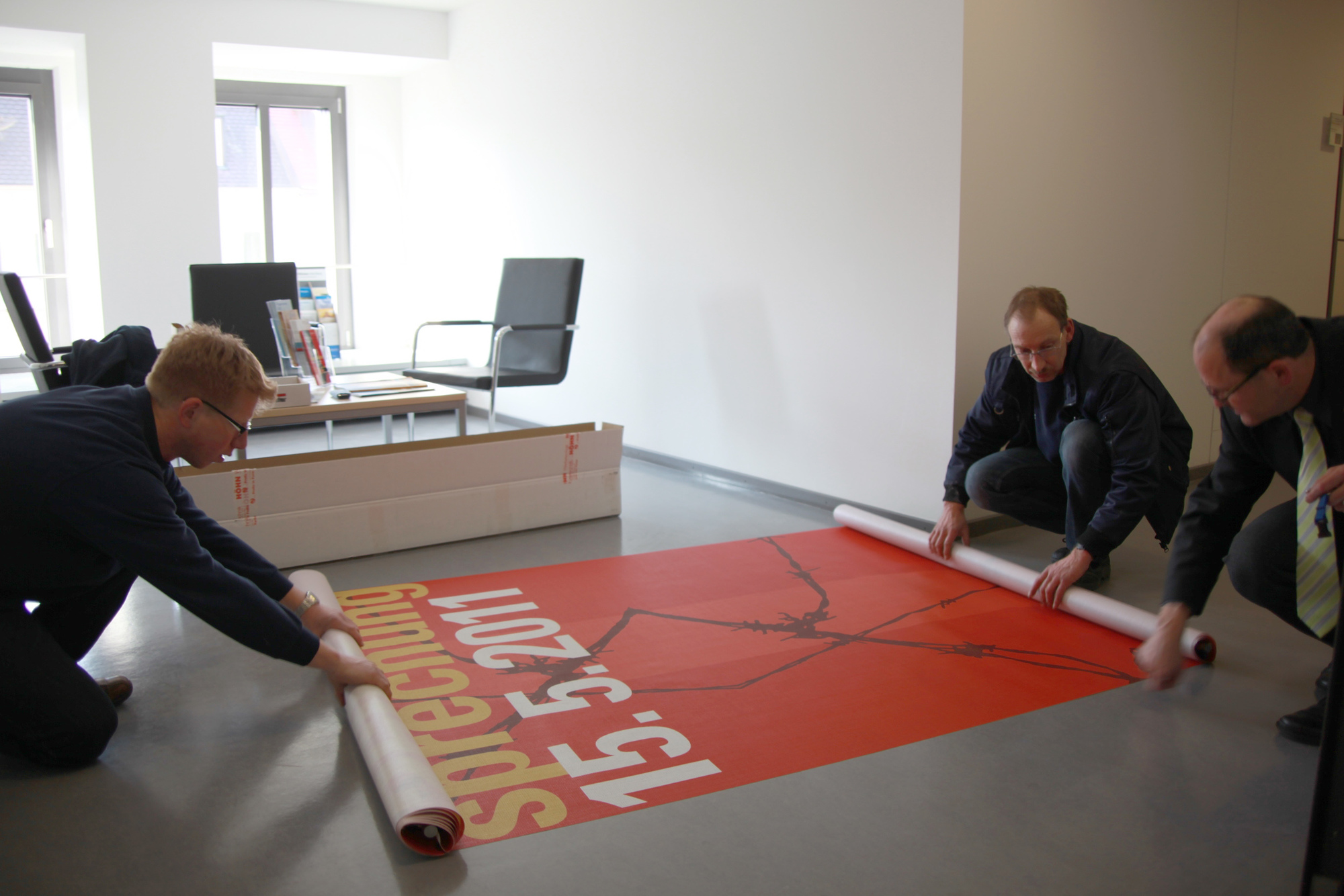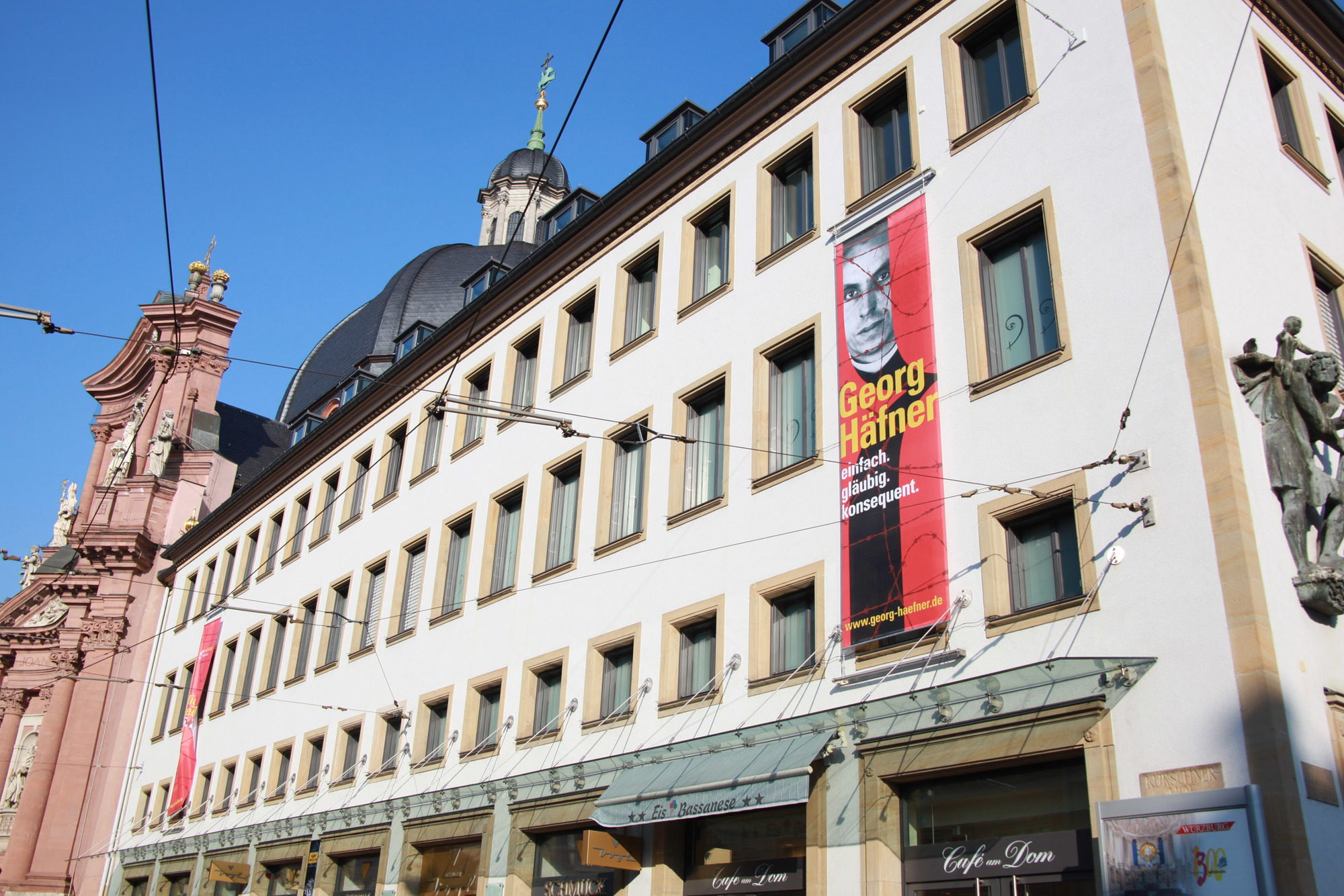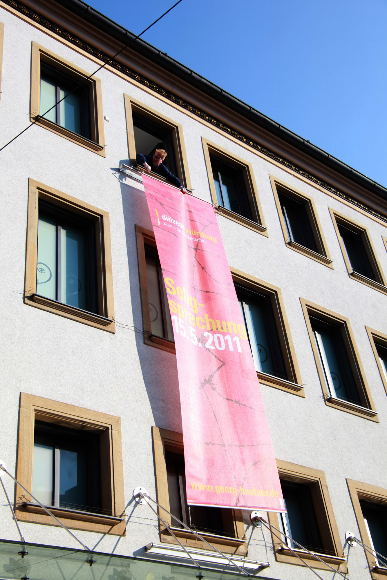 Würzburg (POW) Zwei jeweils mehr als fünf Quadratmeter große Banner an der Fassade des Kilianshauses am Kürschnerhof machen Passanten in der Würzburger Innenstadt auf die Seligsprechung des Märtyrerpriesters Georg Häfner am 15. Mai aufmerksam. Mitarbeiter der Kitzinger Firma Höhn befestigten sie am Dienstag, 22. Februar. Eines zeigt das Gesicht des Märtyrers und den Leitspruch „einfach. gläubig. konsequent.“, das andere verweist auf das Datum der Seligsprechungsfeier und die Internetseite www.georg-haefner.de.