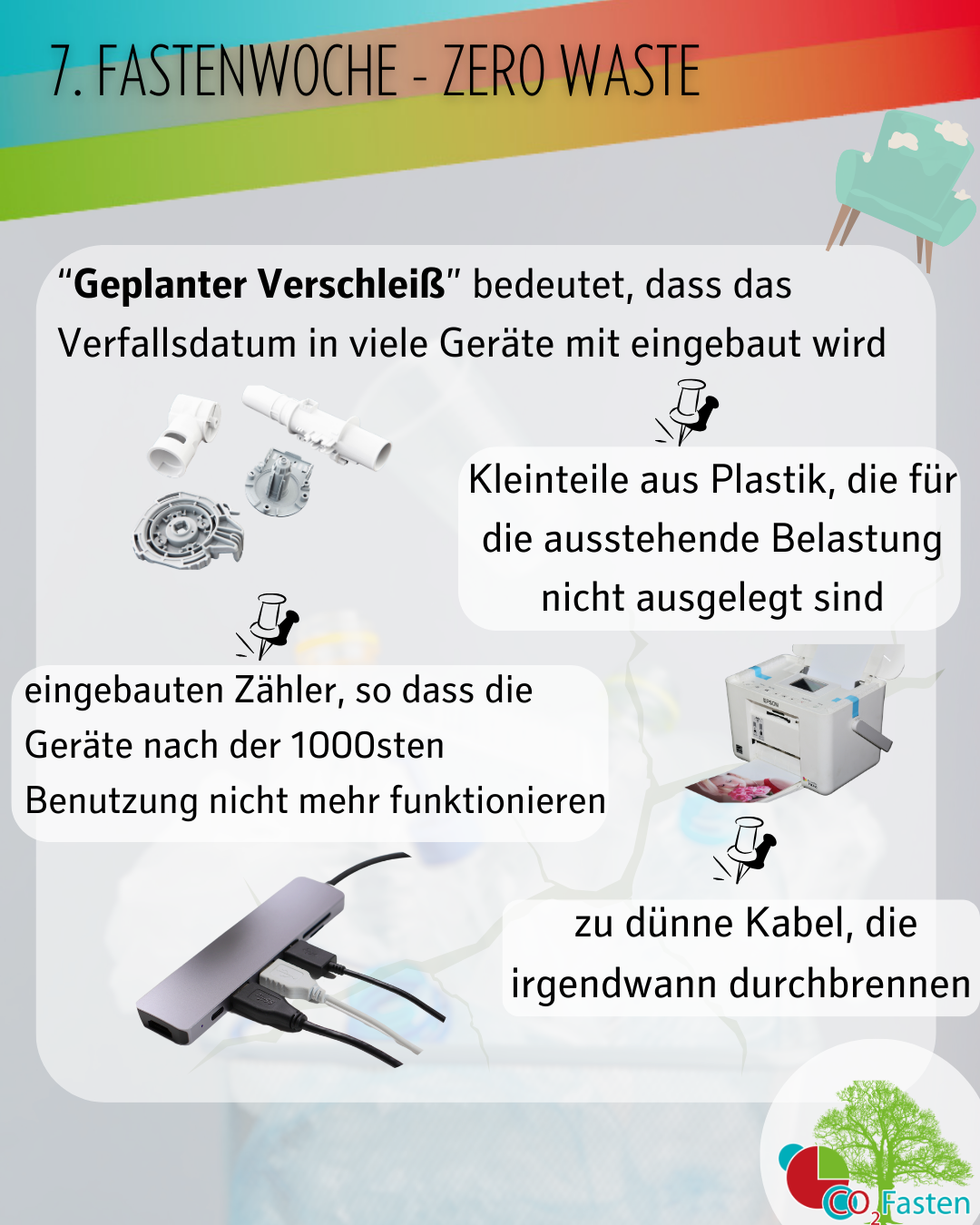 In der letzten Fastenwoche wollen wir auf dieses Problem aufmerksam machen. Fallen dir Teile oder auch Produkte ein, welche sich kürzer halten als früher? Welche Bauteile kennst du, die dazu führen, dass ein Produkt unbrauchbar ist? Einige Gedanken und „Soll-Bruchstellen“ findest du in folgendem Video: https://www.youtube.com/watch?v=I22NX7V7m7s
