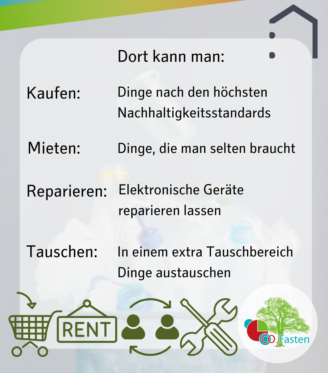 Wie? Einfache Beispiele wären z.B. Stoffbeutel statt Plastiktüten oder auch Obst und Gemüse lose einzukaufen. Weiter muss man ja nicht unbedingt immer neu kaufen, sondern kann mieten oder reparieren lassen. Ein Beispiel für so ein Ort ist das Zukunftshaus in Würzburg.