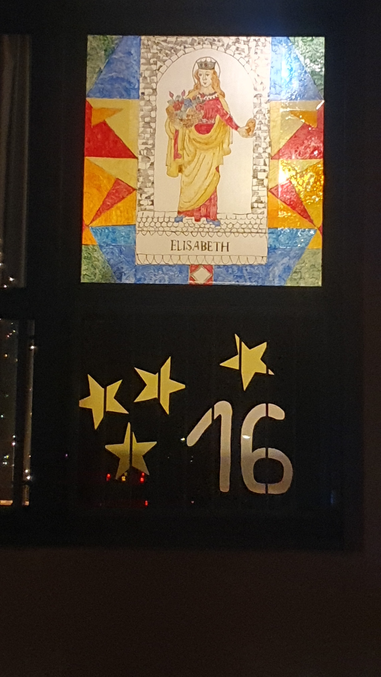 Die KAB war heuer am 16. Dezember an der Reihe und gestaltete ein Fenster am Pfarrheim St. Martin. Es kann bis zum Weihnachtsfest jeden Abend beleuchtet bestaunt werden. In diesem Jahr haben die KAB Frauen bei der Gestaltung des Fensters die Heilige Elisabeth von Thüringen. Zwar ist sie keine klassische Adventsheilige wie z.B. der Heilige Nikolaus oder die Heilige Barbara, da sie ihren Gedenktag am 19. November hat. Sie ist aber eine beliebte Heilige und wird gerne auch als eine der beliebsten deutschen "National- bzw. Volksheilige". Dies nicht zuletzt durch ihr Wirken um die Wartburg bei Eisenach. Auch ihr "aufopferndes" Beispiel, Vermögen mit den Armen zu teilen und Kranke zu pflegen, fasziniert die Menschen, obwohl es doch ein "einfaches und doch existenzielles Beispiel ist,