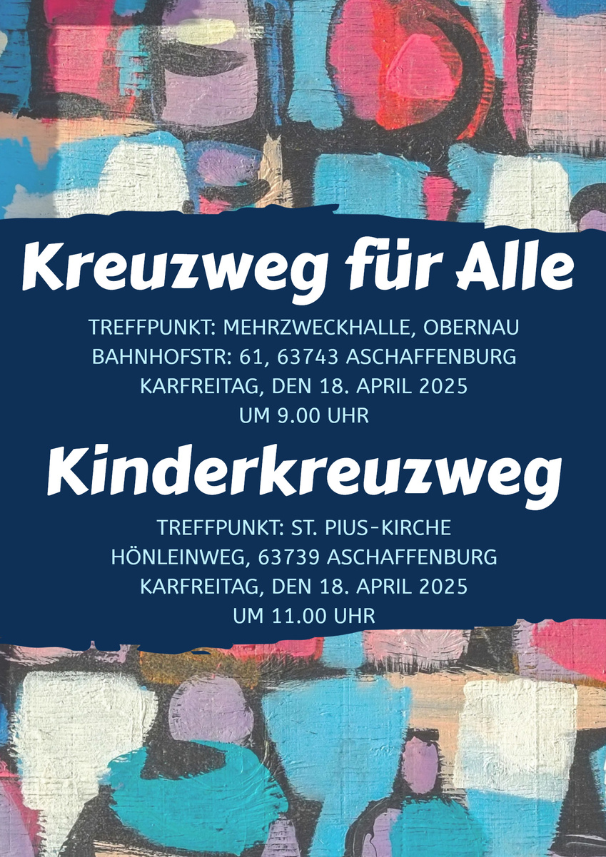 Wir laufen gemeinsam den Kreuzweg hoch zur Obernauer Kapelle „Maria Frieden“. An jeder Station halten wir kurz inne, hören einen Text und beten gemeinsam. Abschluss ist gegen 10 Uhr an der Obernauer Kapelle. Dort gibt es anschließend einen Kaffee/Tee für alle, die das möchten. Bitte eigene Tassen mitbringen. Eine Anmeldung ist nicht nötig. Herzliche Einladung an Kinder, Jugendliche und Erwachsene jeden Alters. Bei Fragen: Tel. 0 60 21/930 688.