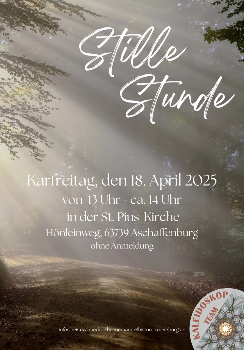 Zur Stillen Stunde am Karfreitag lädt das Kaleidoskop-Team am Karfreitag von 13 bis 14 Uhr in die St. Pius-Kirche ein. Eine Anmeldung ist nicht nötig.