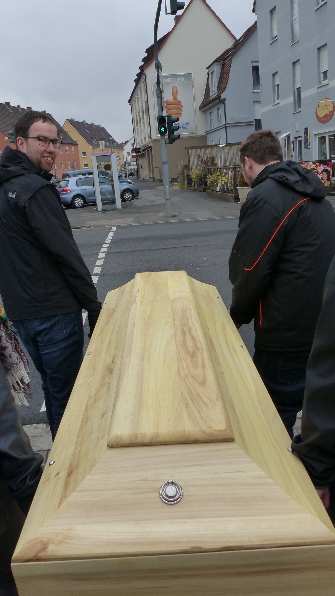 Der Karsamstag ist ein besonderer Tag. Er ist ein Tag des nicht mehr und noch nicht. Viele Menschen leben in solchen Zwischenzeiten und in der Morgenandacht wurde in der Jugendkirche gerade an diese Menschen gedacht. Im Anschluss waren die Jugendlichen eingeladen das Bestattungsunternehmen Kalli Müller zu besichtigen. In einer Einstimmung betrachteten die TeilnehmerInnen Bilder von erloschenen Gesichtern und diskutierten über die Frage, wie wichtig ist so zu leben als könne jeder Tag der letzte Tag im Leben sein. Schon der Weg dorthin war eine eindrucksvolle Erfahrung, denn der für die Liturgie geliehene Sarg wurde wieder zurück getragen. Daniel Kehl nahm sich dann sehr viel Zeit, um die vielen Fragen der jungen Erwachsenen zu beantworten und den Alltag eines Bestatters zu beschreiben.