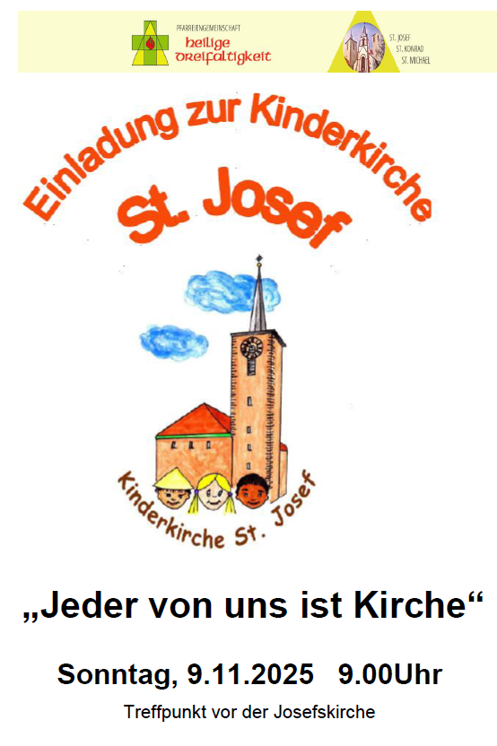 das Kinderkirchenteam St. Josef lädt herzlich zur Kinderkirche ein, am Sonntag, den 09.11.2025. Wir treffen uns um 9.00 Uhr auf dem Kirchvorplatz von St. Josef in der Uhlandstraße und gehen dann nach nebenan in das Haus der Begegnung. Nach einem Wortgottesdienst mit Mitmachgelegenheit für Euch ziehen wir zur Mahlfeier in die Josefskirche ein.