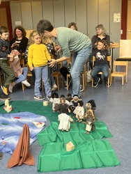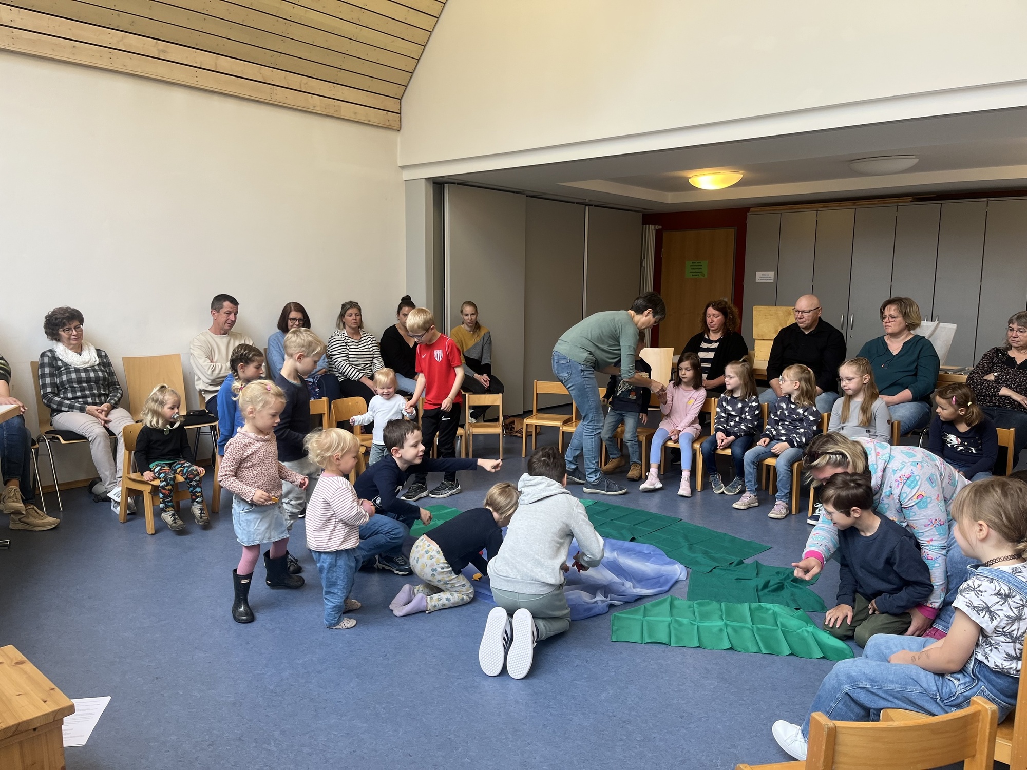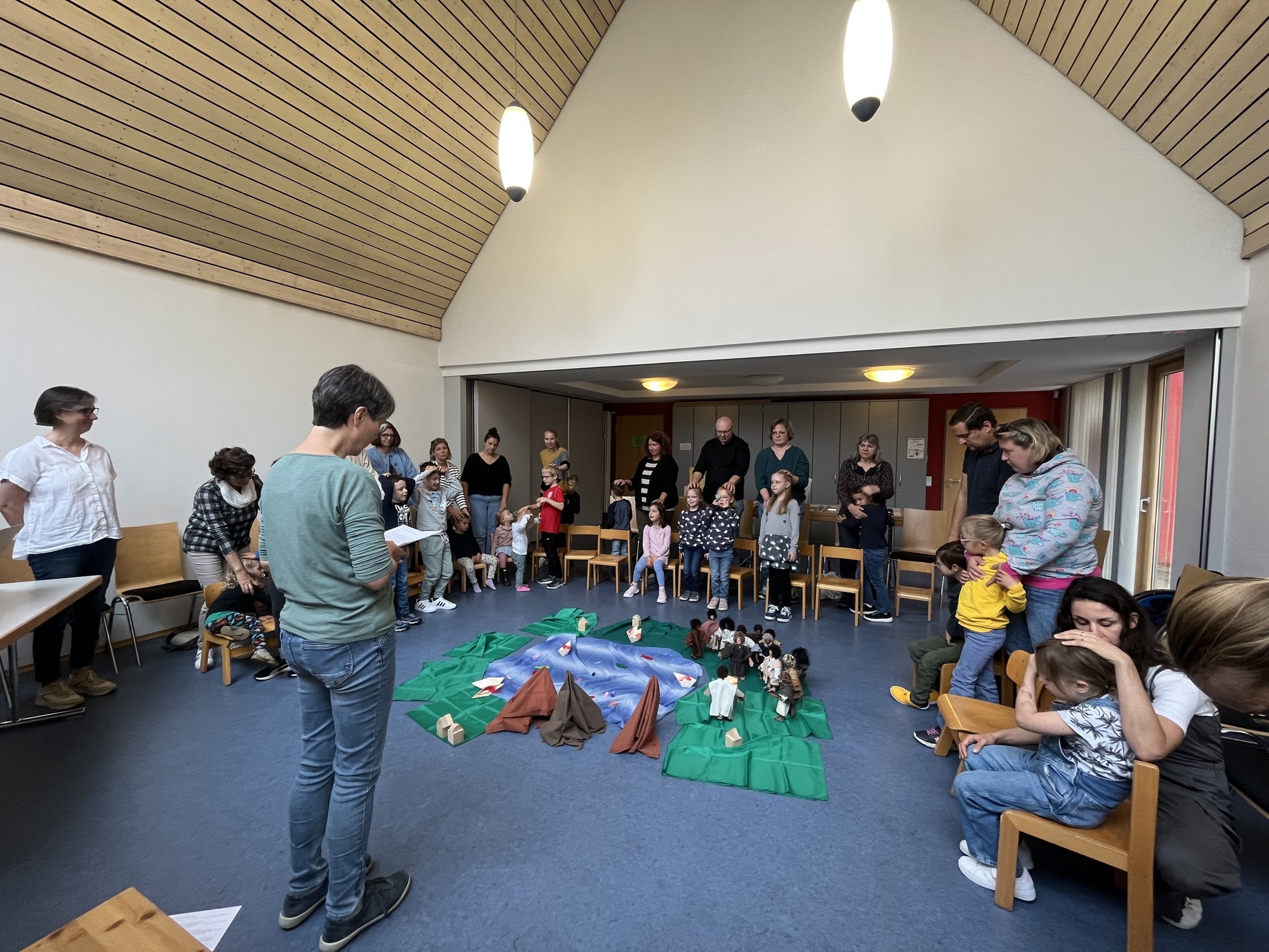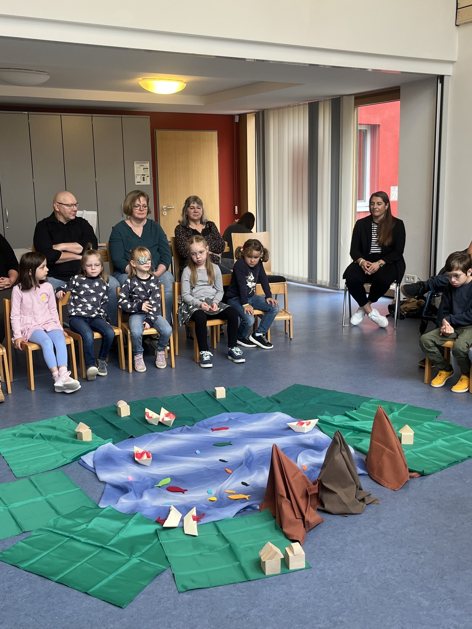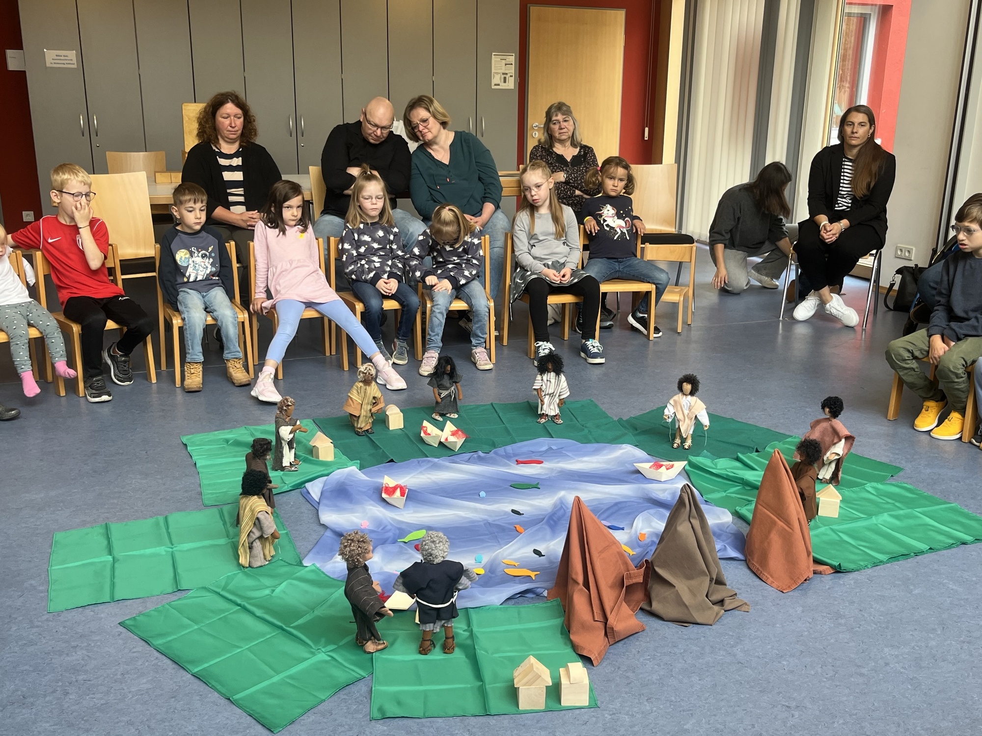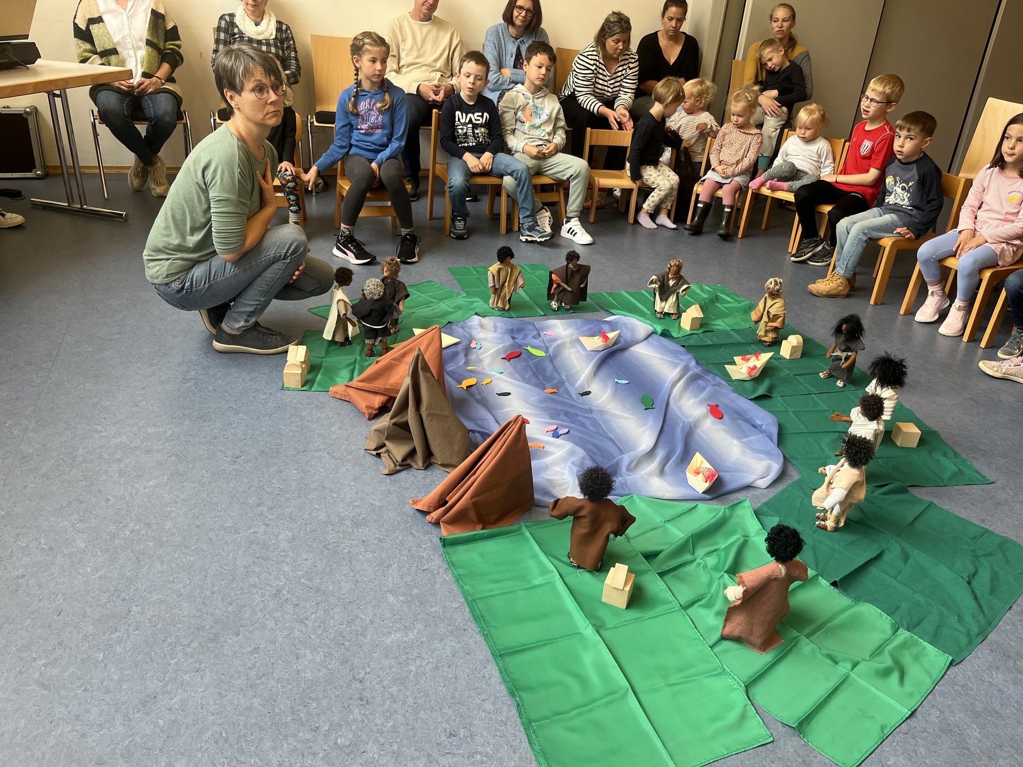 Zu Beginn konnten die Kinder aktiv werden, den See Genezareth, Berge, grünes Land, Dörfer und Fischerboote mit Netzen in der Mitte vorbereiten.