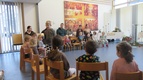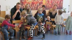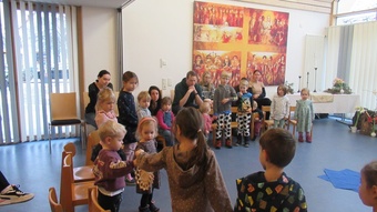 Etwas Verborgenes, eingehüllt in ein blaues Tuch, lag in der Mitte. Ein großer Stern kam zum Vorschein. Der Stern scheint etwas Besonderes zu sein: Leuchtend am Nachthimmel wanderte der Stern. Auch in unserem Kreis zog er seine Bahn. Was verkündet er? Was hat er Großes zu sagen? Was will er uns erzählen?... Wir begleiteten den Stern gemeinsam mit den Sterndeutern einen langen Weg, bis wir fanden, wohin er uns führte. Endlich kamen die Sterndeuter nach langer Zeit in die Stadt Jerusalem zum König Herodes, der um seine Macht fürchtete. Der Stern leuchtete die ganze Zeit und blieb über dem Stall in Betlehem stehen. Sie spürten: Jesus ist etwas Besonderes. In diesem Kind ist Gott uns nahe. Er macht unseren Weg hell und führt uns auf gute Wege. "Der Weihnachtsstern, der weiß den Weg...", ein schönes Lied , das uns durch den Gottesdienst begleitete.