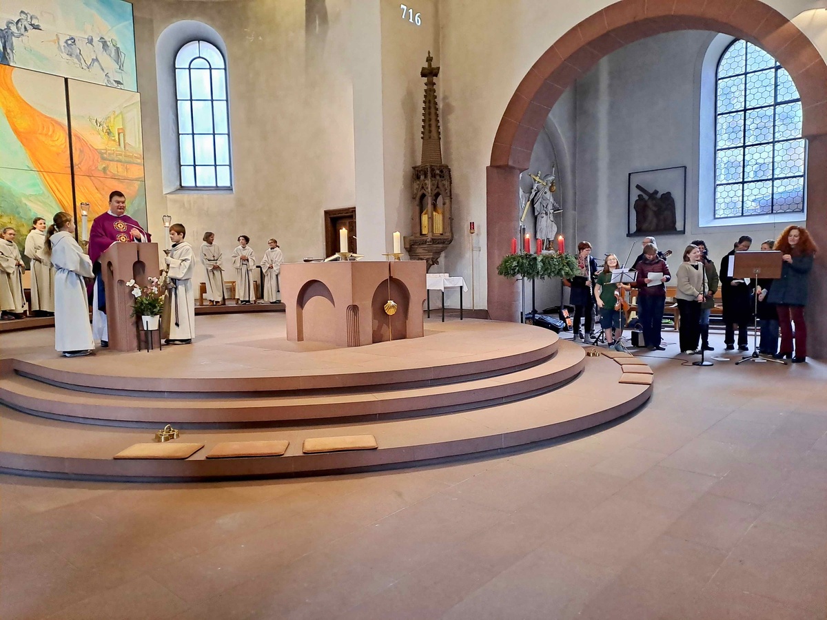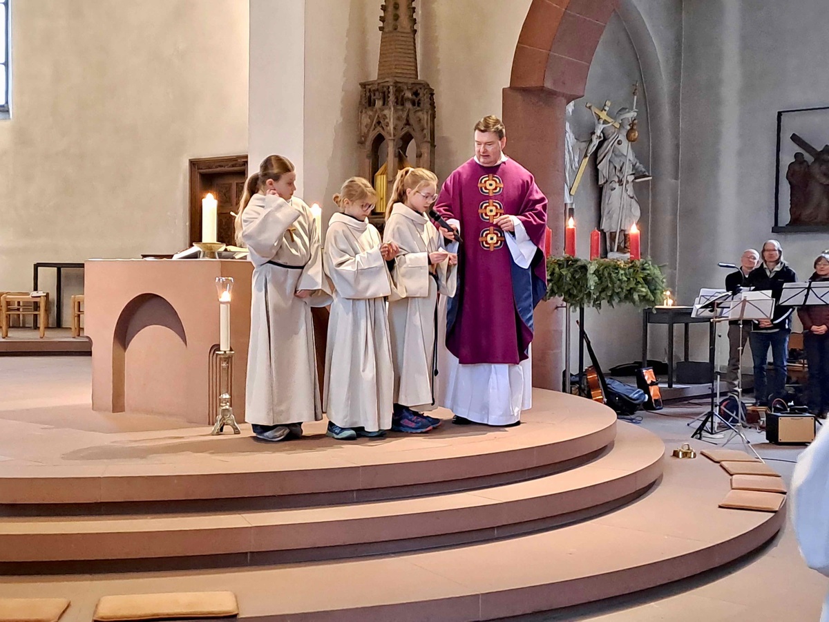 Pfarrer Kölbel wollte wissen, was es bedeute, mit Jesus befreundet zu sein, der vor 2000 Jahren gelebt habe. Wir Christen glaubten, dass Jesus immer bei uns sei und begrüßten ihn nun in unserer Mitte in den Kyrierufen, die die Ministranten übernahmen.