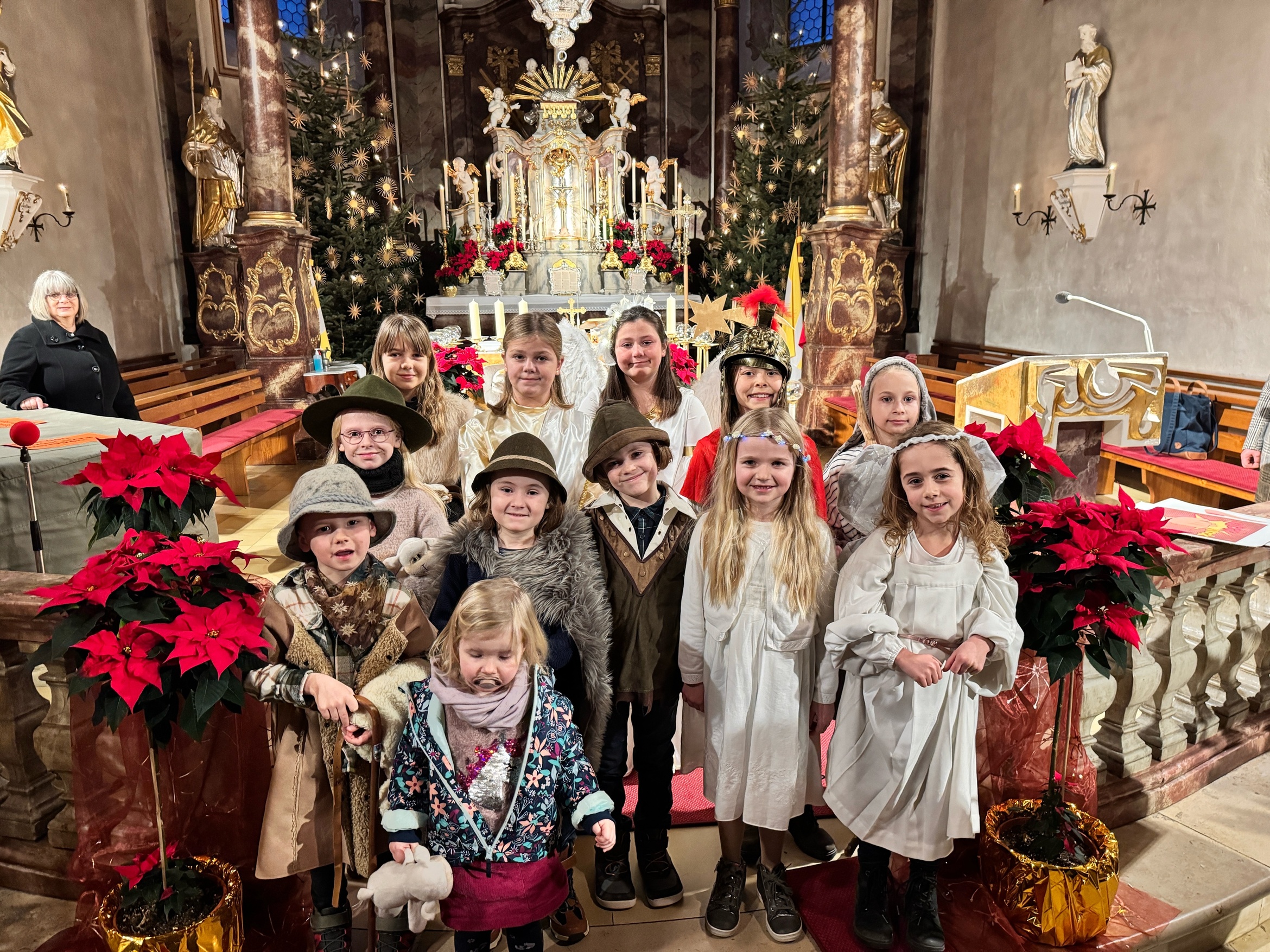 Die Kinderkrippenfeier in St. Justinus bot eine feierliche Einstimmung auf das Weihnachtsfest. Im Mittelpunkt stand das Krippenspiel „Hört, Ihr Menschen Nazareths!“, das die Kinder mit viel Freude und Engagement aufführten.