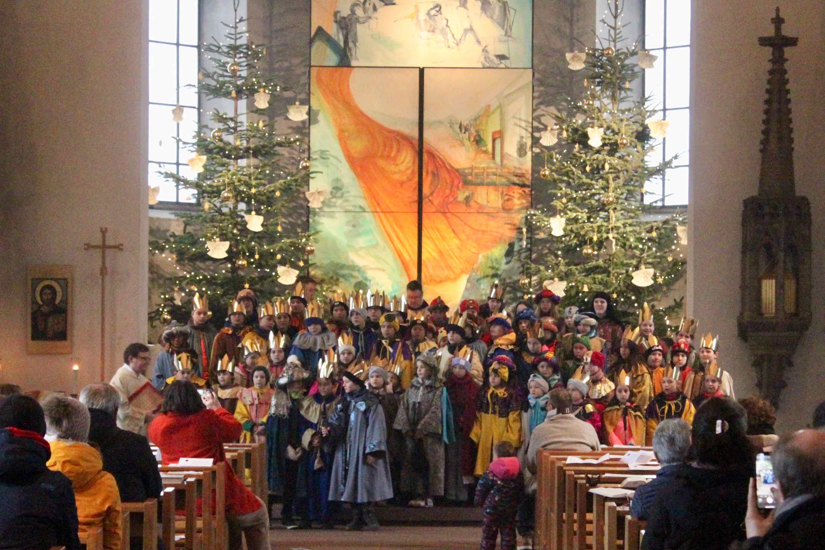 Nach der Kommunion kamen alle Sternsinger in den Altarraum. Pfarrer Kölbel erbat den Segen Gottes für sie, die Kreide und die Segensaufkleber. Er wünschte den Sternsingern viel Freude, eine gute Aufnahme in den Häusern und eine gesunde Heimkehr.