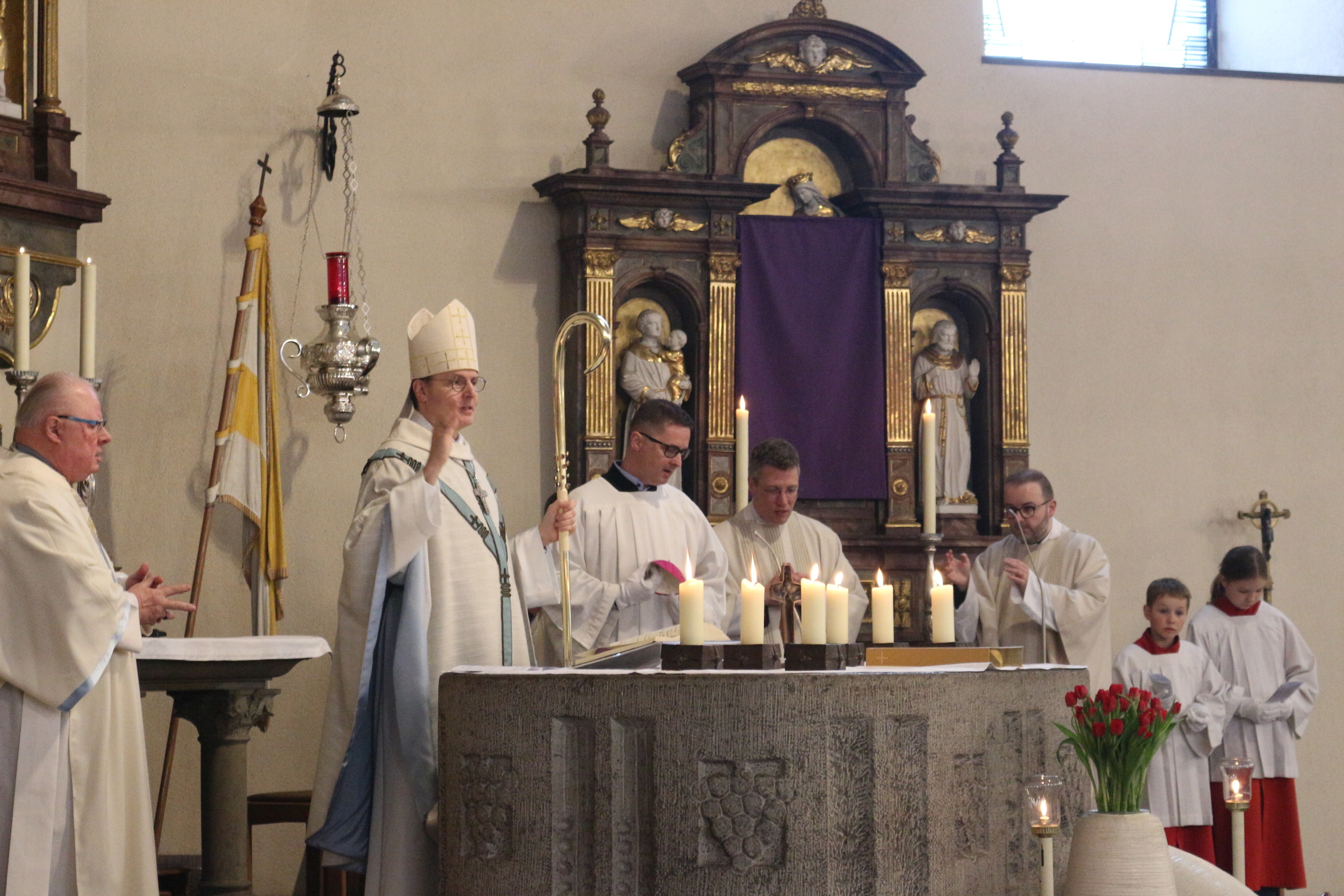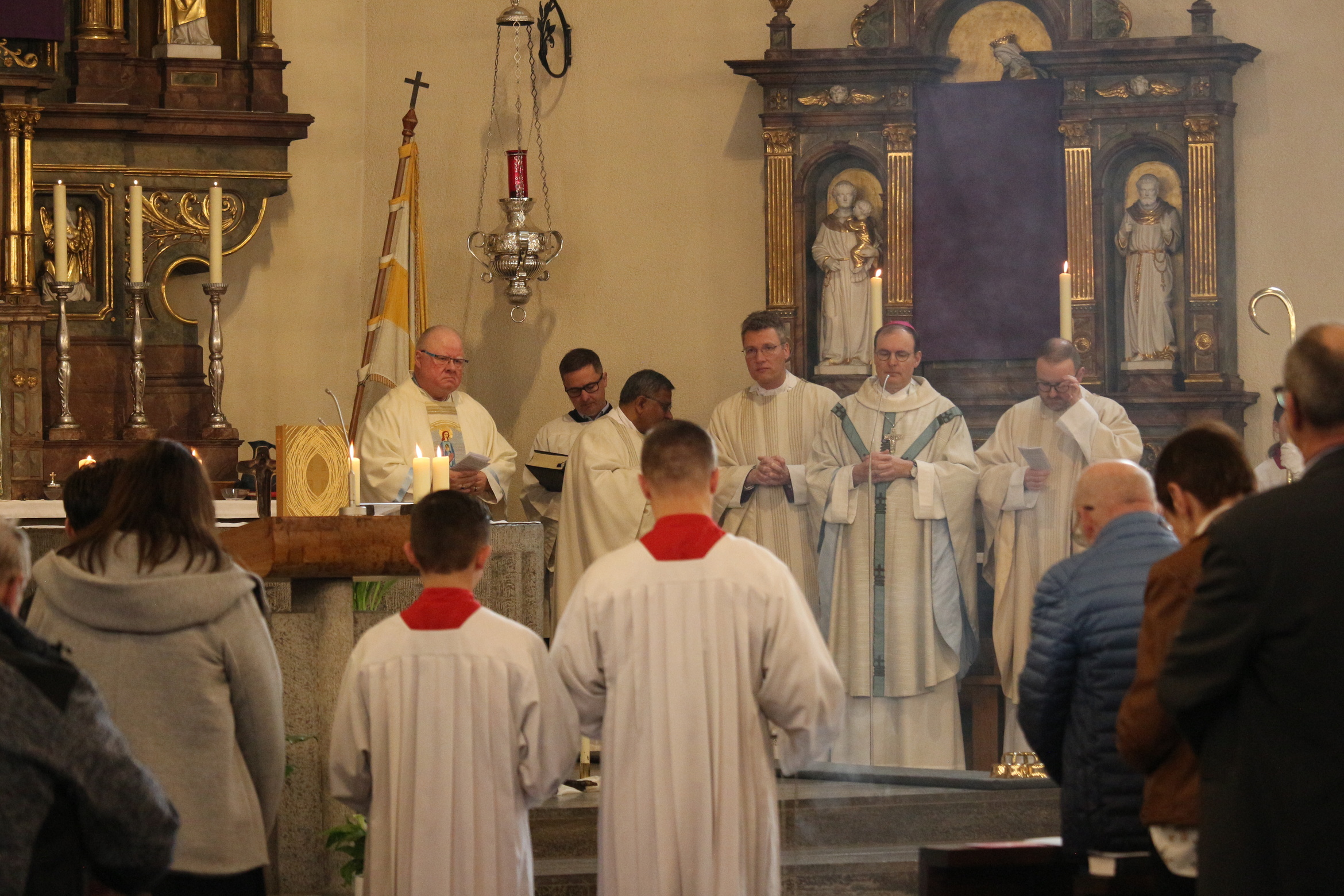 Musikalisch gestaltete als Kantor und Organist Jakob Keller die Heilige Messe in der St. Johanneskirche. Vorbereitet hatten die Firmlinge Diakon Frank Menig, Barbara Gössmann-Schmitt und Pfarrer Dr. Eugen Daigeler. Er stand gemeinsam mit dem Hesselbacher Pfarrer Kai Söder, mit Kaplan Stephen Kulandai und mit Diakon Dr. Michael Wahler am Altar beim Pontifikalamt zur Firmung.