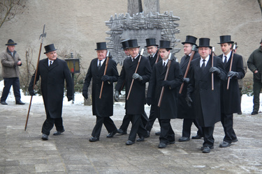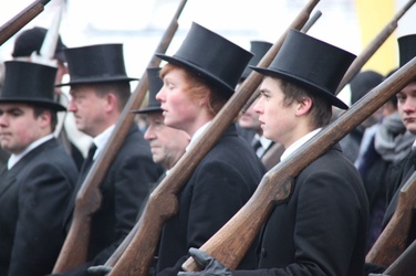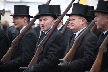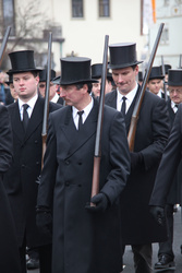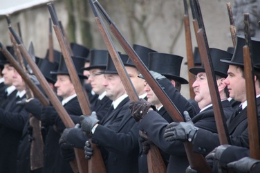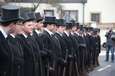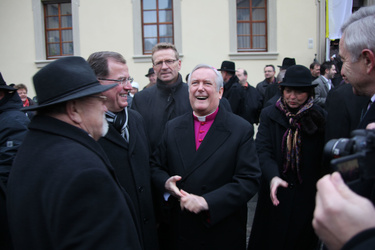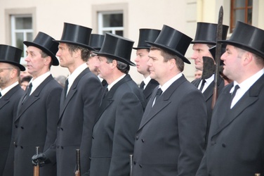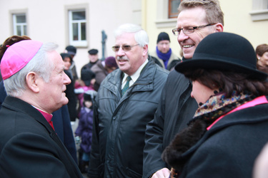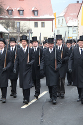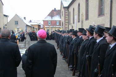 Begrüßung vor dem Festgottesdienst in Oberschwarzach im Landkreis Schweinfurt: Bürgerwehr-Hauptmann Georg Wagner (links) begrüßt Bischof Dr. Friedhelm Hofmann und die Ehrengäste.