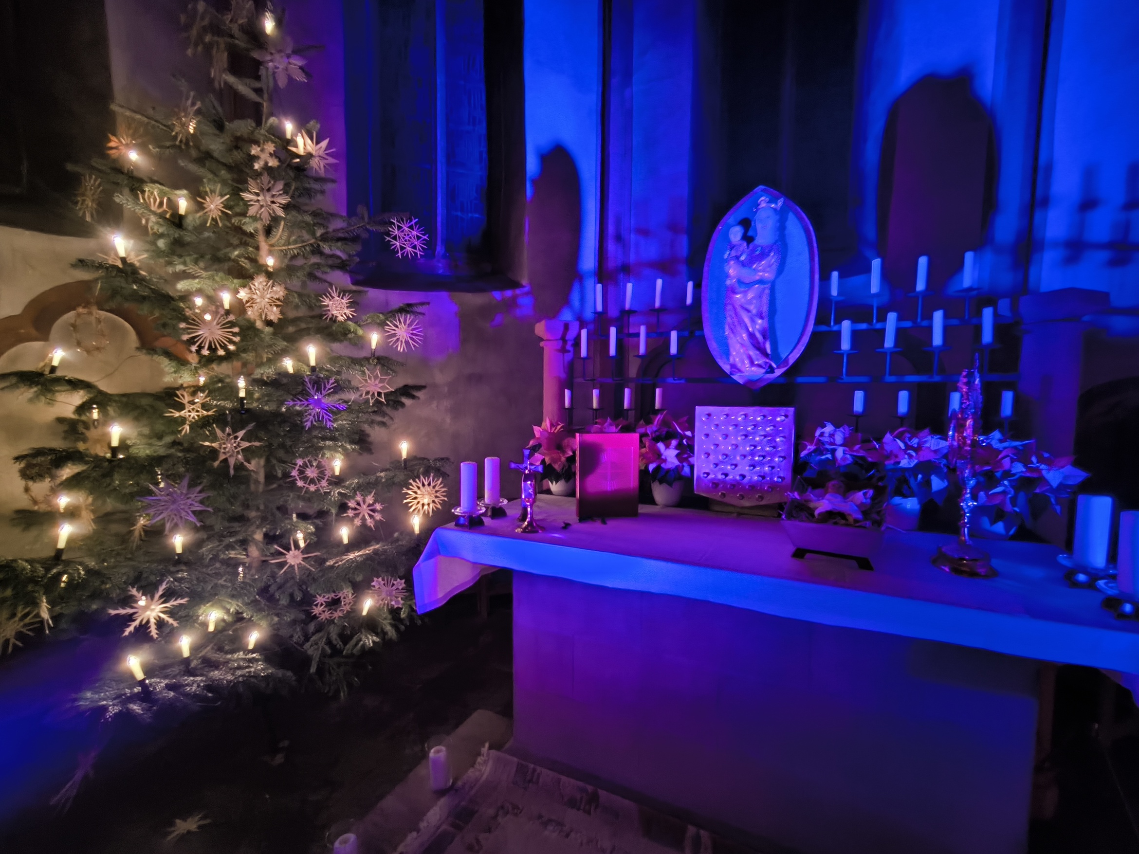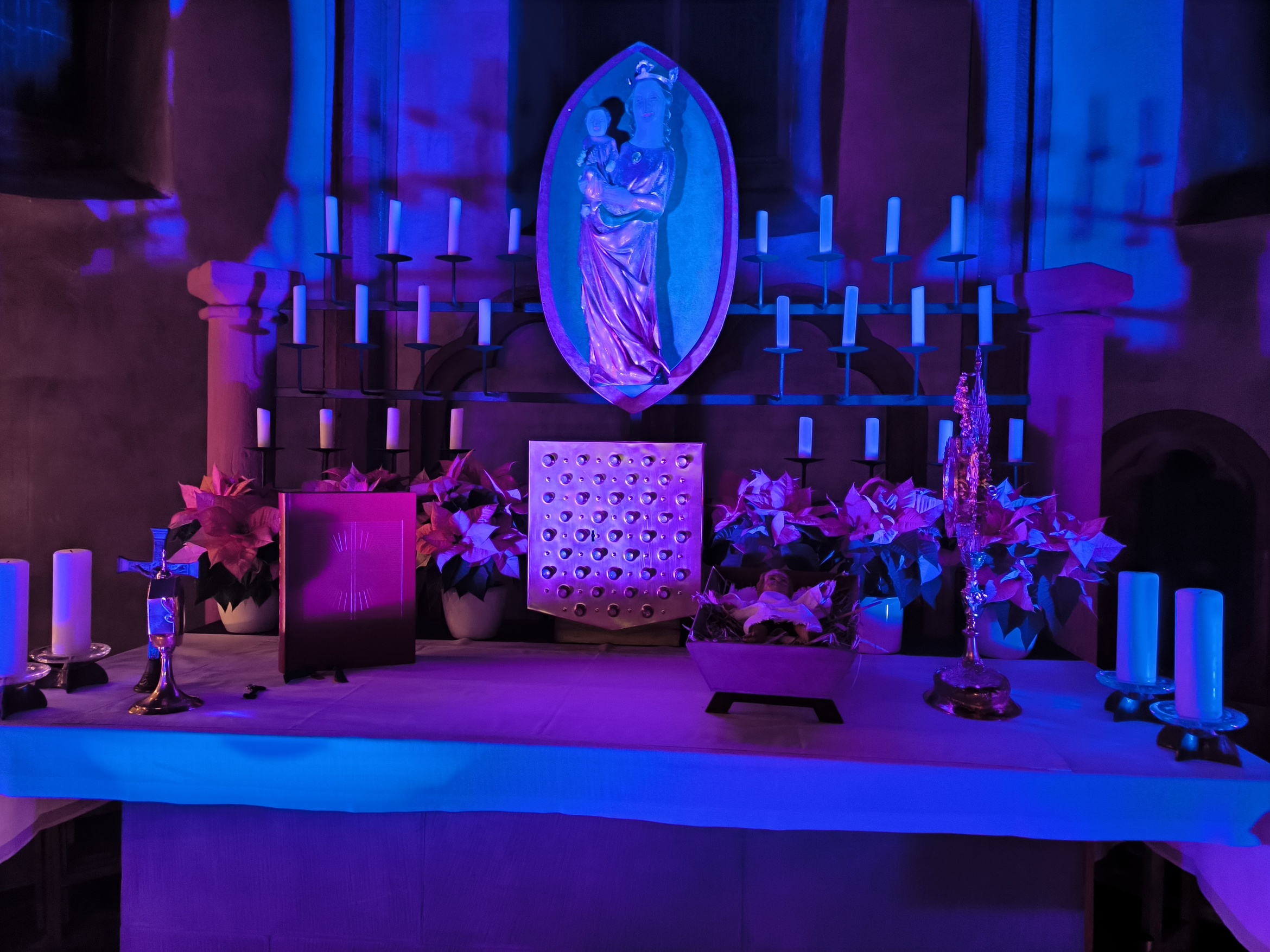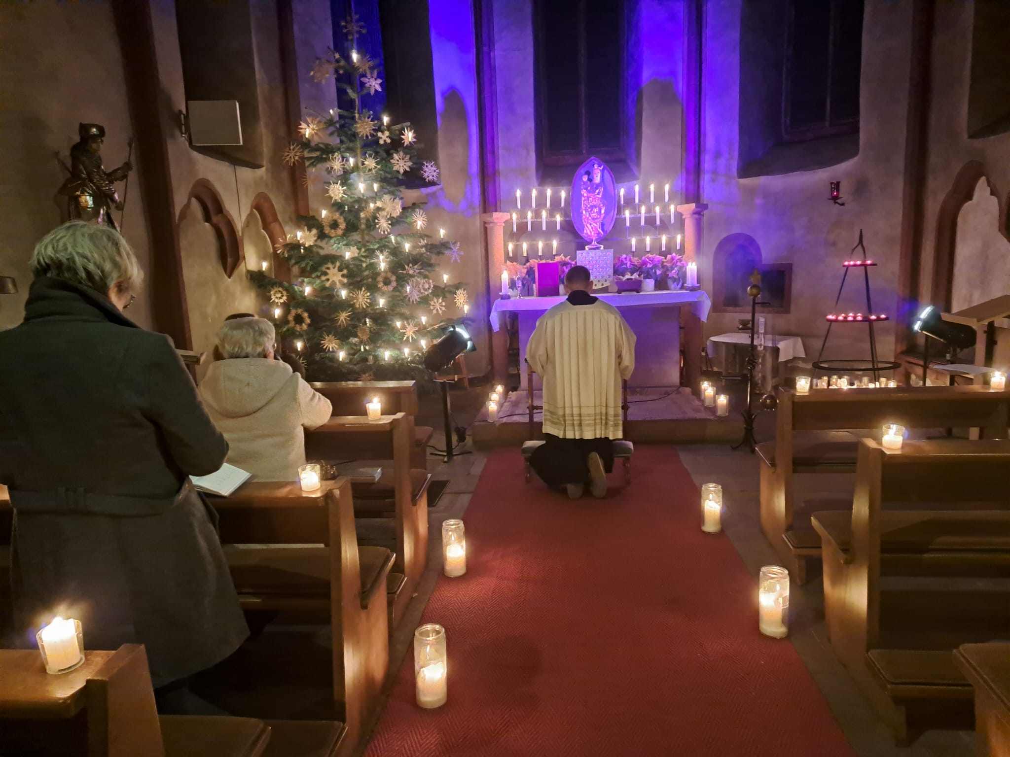Anhand verschiedener weltlicher, christlicher und biblischer Texte wurde das Thema der Begleitung Gottes beleuchtet. Der erste Text war ein Text, welcher als eine Art "geistliches Testament" von Steve Jobs verbreitet wurde. Dass dieser Text von ihm selbst stammt, ist unwahrscheinlich. Doch der Inhalt geht zu Herzen. Ausgehend von dem Eingeständnis, dass der Reichtum nicht glücklich macht und im Angesicht des Todes völlig irrelevant ist, ruft einer der reichsten und erfolgreichsten Geschäftsleute der Welt dazu auf, über das Leben und die Nächstenliebe nachzudenken und als erste Priorität zu setzen. Im zweiten Text wurde eine Neujahrsgeschichte über das "zaghafte neue Jahr" gelesen. Die Geschichte ist von Gernot Geyer aus dem Jahre 2000. Sie handelt davon, dass 365 Tage vor dem neuen Jahr stehen. Mutig soll man vorangehen, aber auch die Realität, dass im "Neujahr" auch nicht alle Themen gelöst werden können. Als Drittes wurde aus dem biblischen Buch Numeri der aaronitische Segen gelesen. Es folgte aus dem Buch Genesis der Bundesschluss Gottes mit den Menschen aus der Geschichte mit Noah. Nie wieder will Gott etwas Schlechtes für die Menschen und setzte den Regenbogen als Zeichen der Freundschaft der Menschen mit Gott. Als Evangelium wurde nach dem feierlichen Halleluja die letzten Worte Jesu aus dem Matthäusevangelium gelesen. Da heißt es: "Seid gewiss, ich bin bei euch alle Tage bis zum Ende dieser Welt". In seiner anschließenden Predigt geht der Religionspädagoge auf die Begleitung Gottes im Leben ein, besonders auch auf Krisen und Lebensabschnitte, in denen man Gott nicht spüre. Er benutzte den Vergleich, wenn ein Kind zu Boden fällt. Ein "Zaubertrick", um die Kinder zu beruhigen, ist es, auf den Schmerz oder die Wunde zu pusten. Das Pusten nimmt weder den körperlichen Schmerz noch macht das Pusten die Wunde unsichtbar. Doch wirkt das Pusten Wunder. "Wenn es uns mal schlecht geht und wir Gott nicht spüren im neuen Jahr", dann melden wir uns bei Gott doch einfach mal mit "Gott, bitte puste mal". Nach der Predigt mündete der Abend in die Anbetung. Alle Mitfeiernden stellten vor dem Lektionar, dem Kind in der Krippe und dem Allerheiligsten eine Kerze nieder. Als Segen wurde der aaronitische Segen gesprochen. Zwischendurch gab es immer wieder Gesänge und Instrumentalstücke von der Orgel.