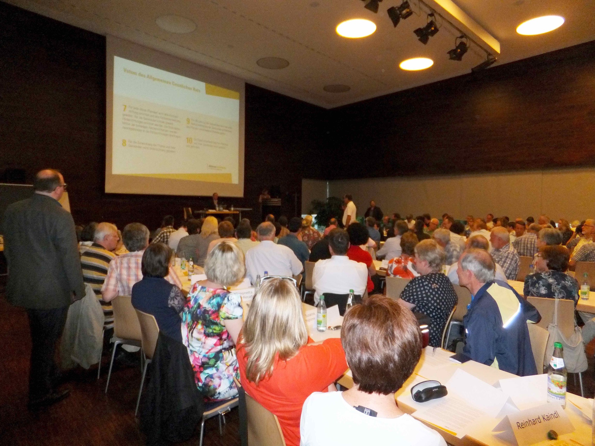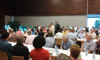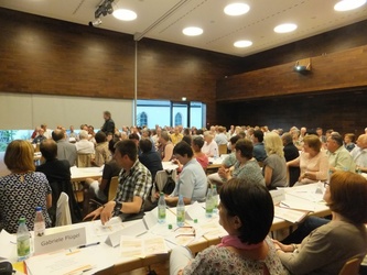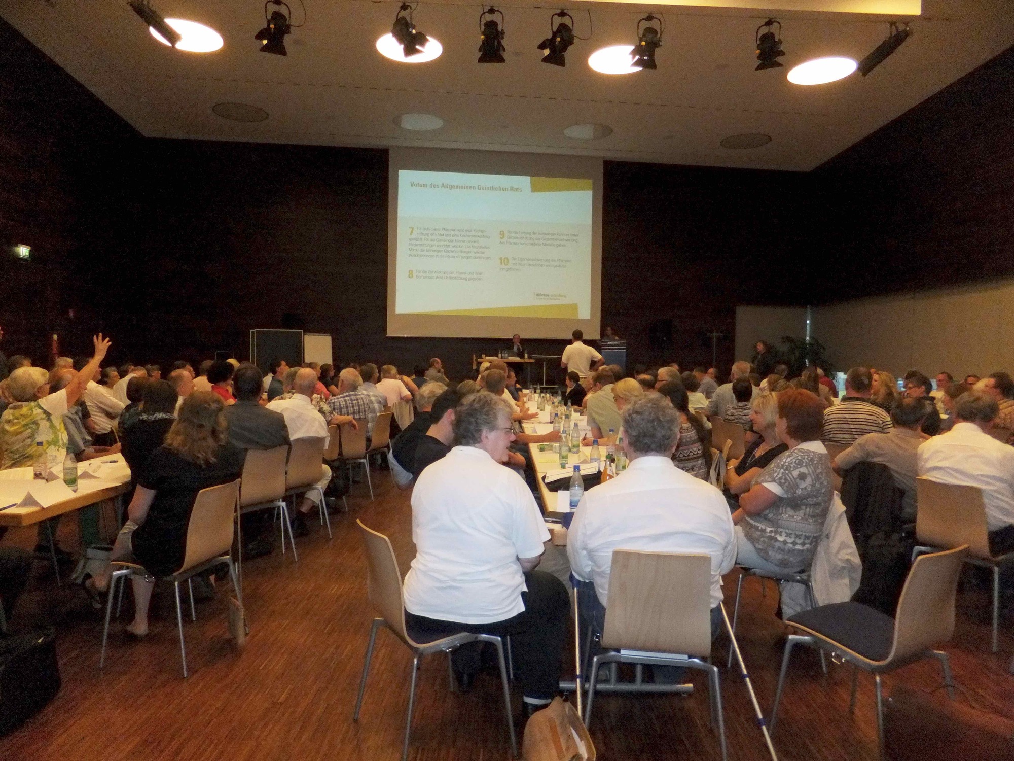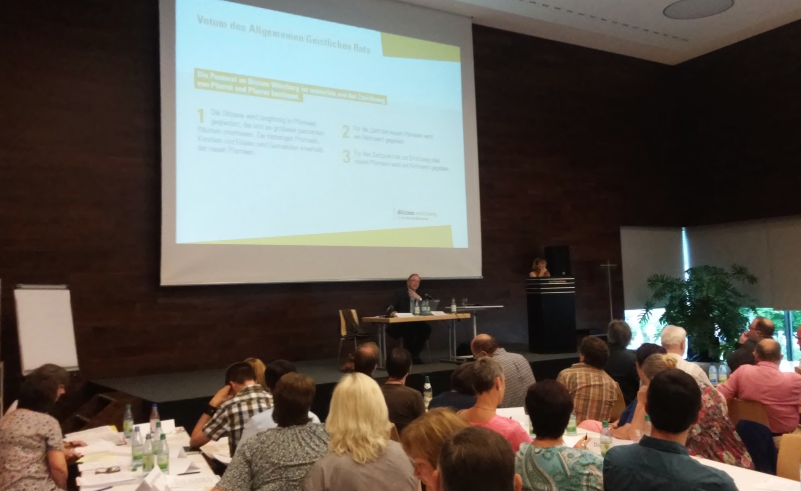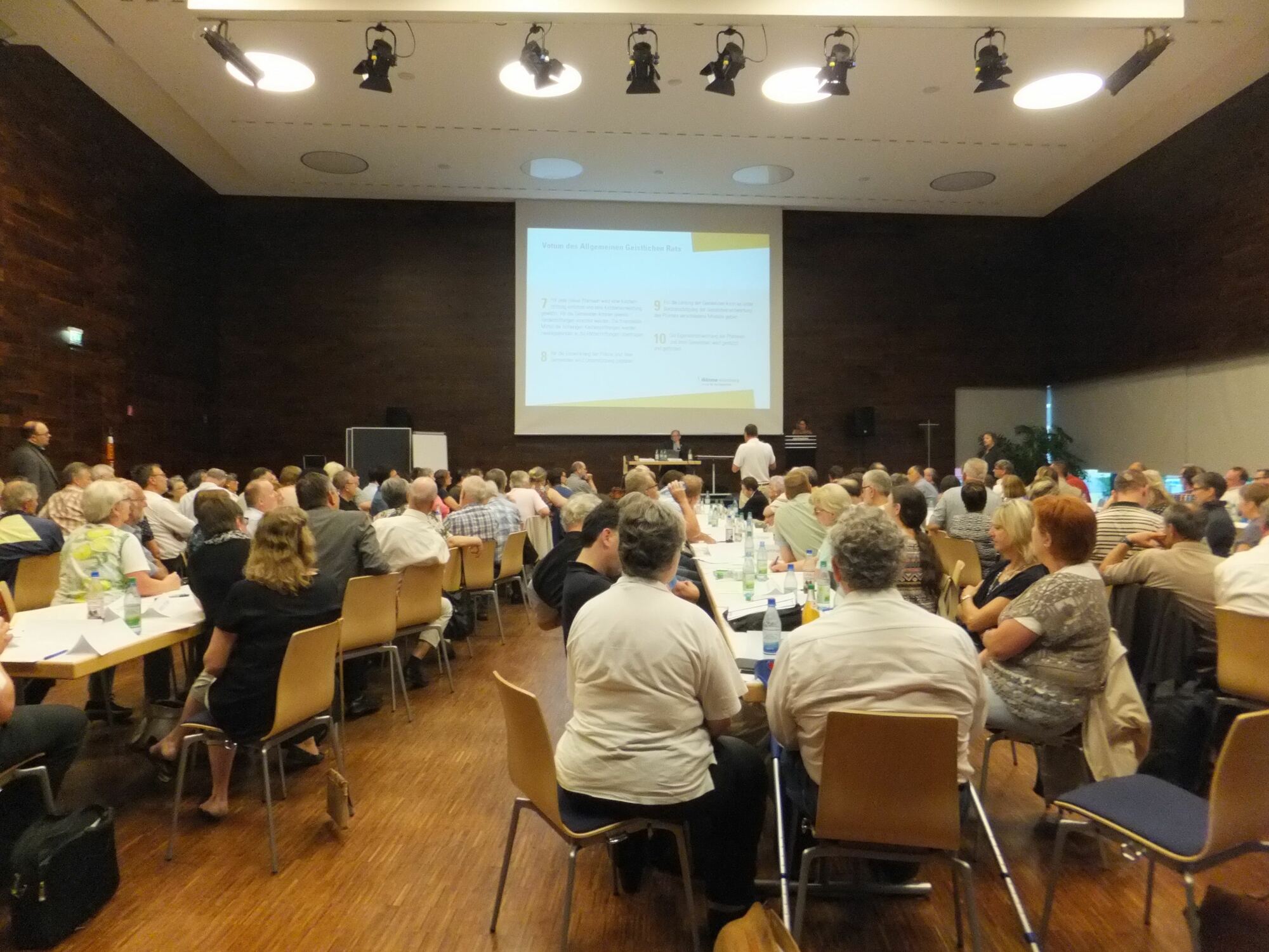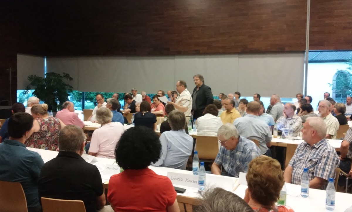 Zunächst stellte er ein sog. „Theologische Leitwort" vor, das von Mitgliedern der Bistumsleitung verfasst wurde, danach das „Votum des Allgemeinen Geistlichen Rates" vom Februar 2016, zu dem vorwiegend die Hauptabteilungsleiter der Diözese gehören. Beide Schreiben waren den Anwesenden schon vorab zugesandt worden, so dass die Diskussion rasch Fahrt aufnahm. Alles drehte sich um die Frage, wie die Zusammenfassung zu noch größeren pastoralen Räumen oder Großpfarreien organisiert werden soll, ohne dass sich die Gemeinden vor Ort überfahren fühlen. Die Verlustängste sind bereits heute groß, das ging aus den Redebeiträgen hervor.