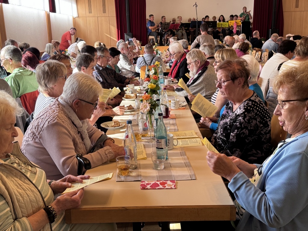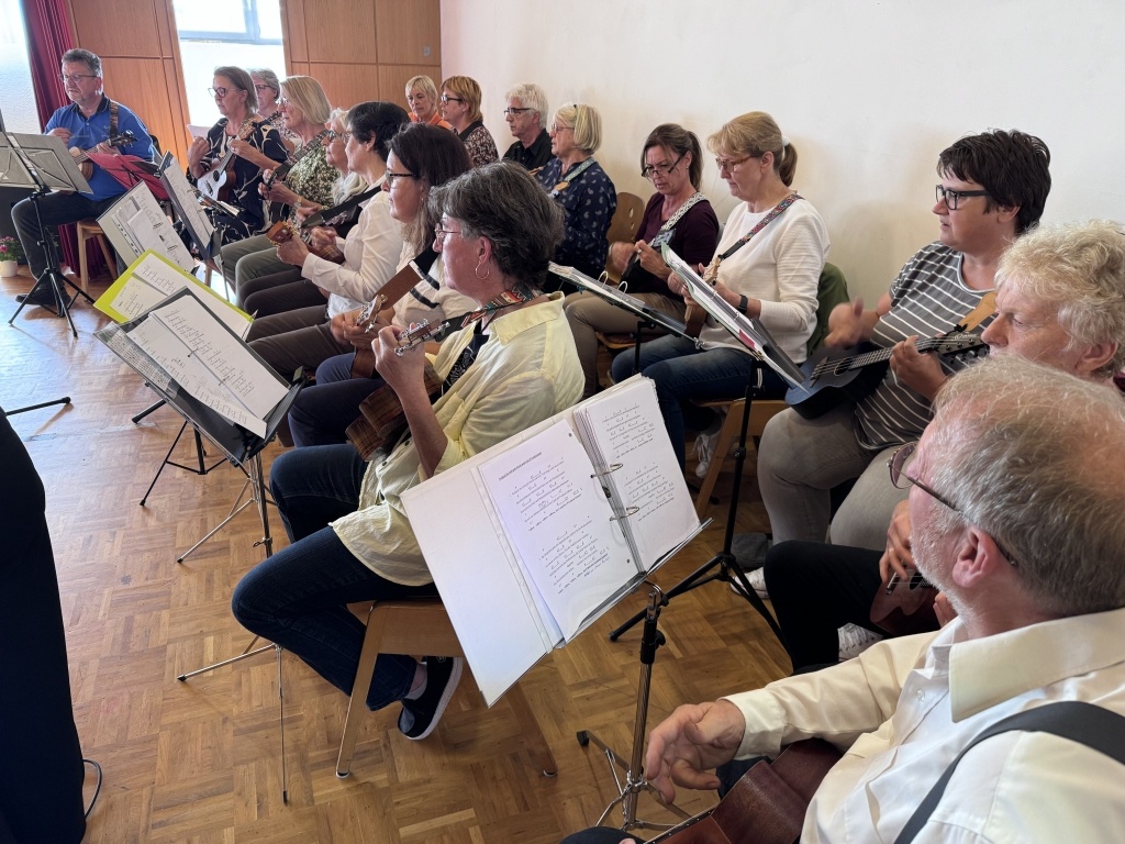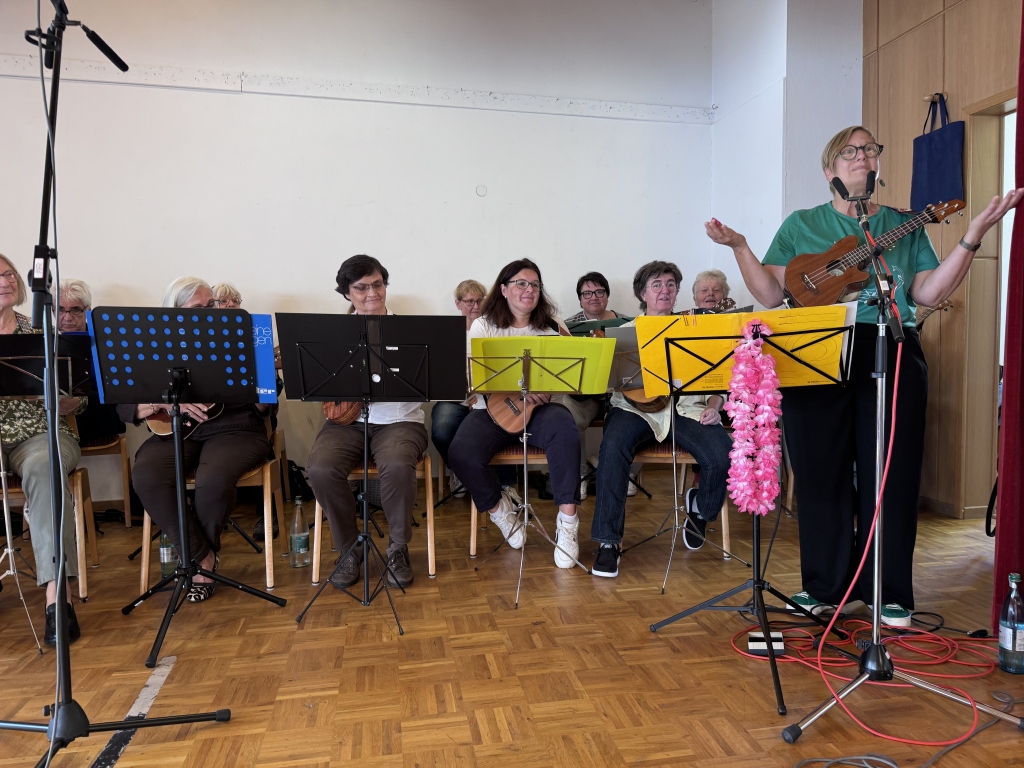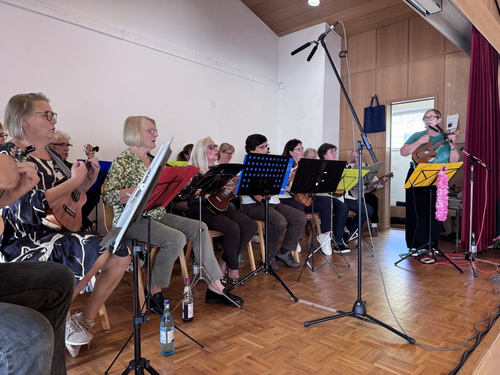 Ein besonderes Highlight am Nachmittag war das Rudelsingen mit der Ukulele-Gruppe des Wandervereins um Sabine Geis. Der Pfarrsaal war proppenvoll und dank ausgelegter Liederheftchen konnten alle aus Leibeskräften mitsingen.