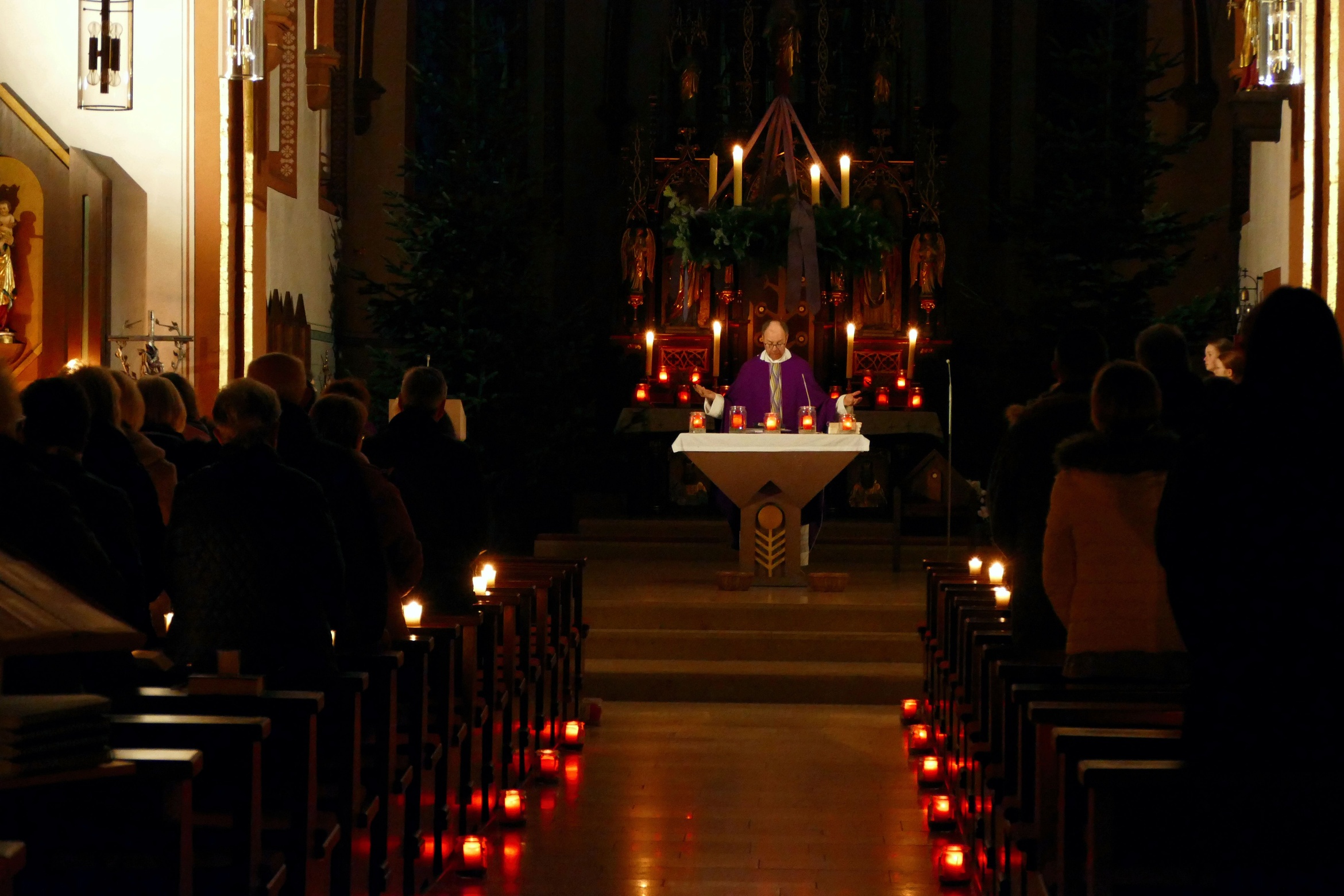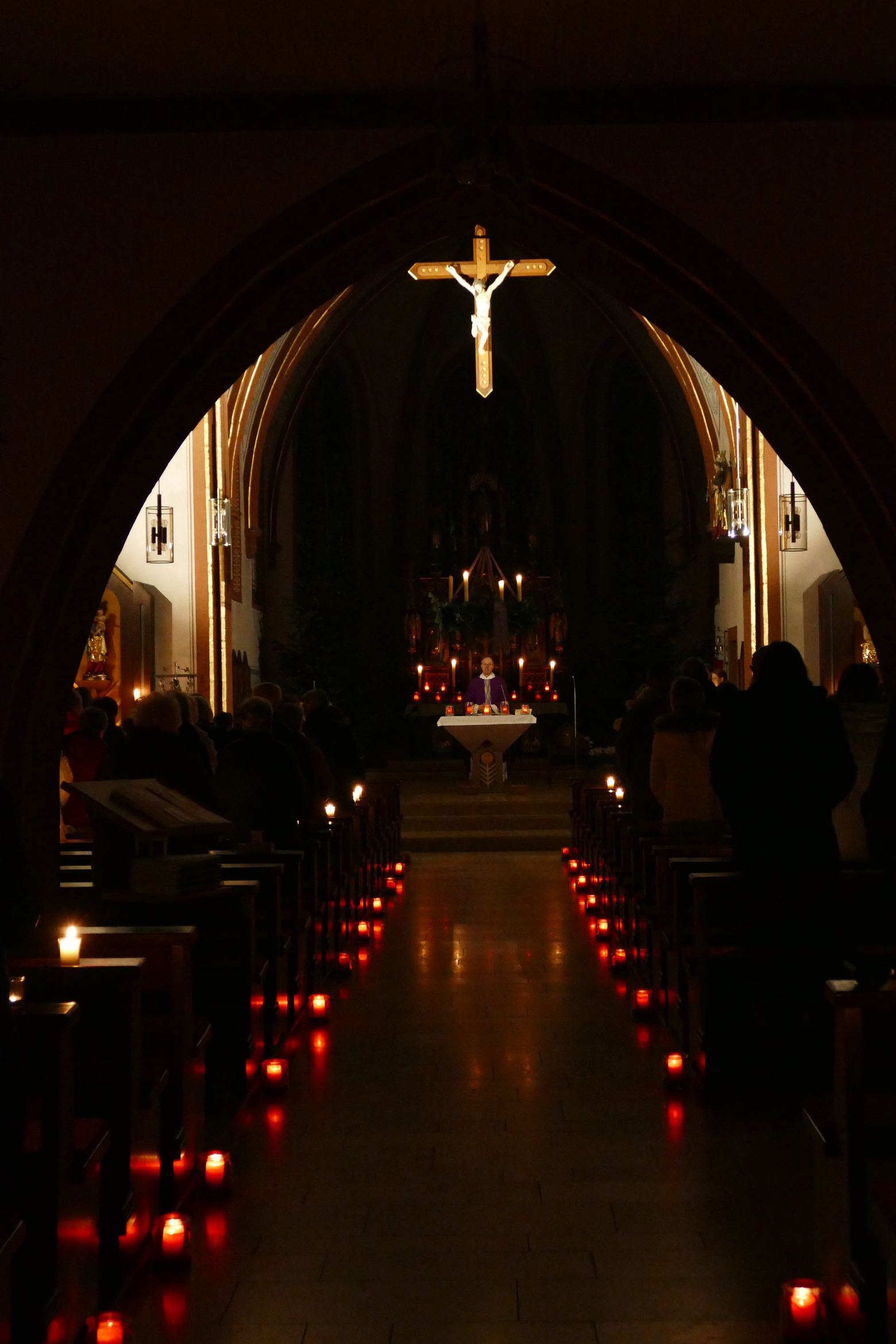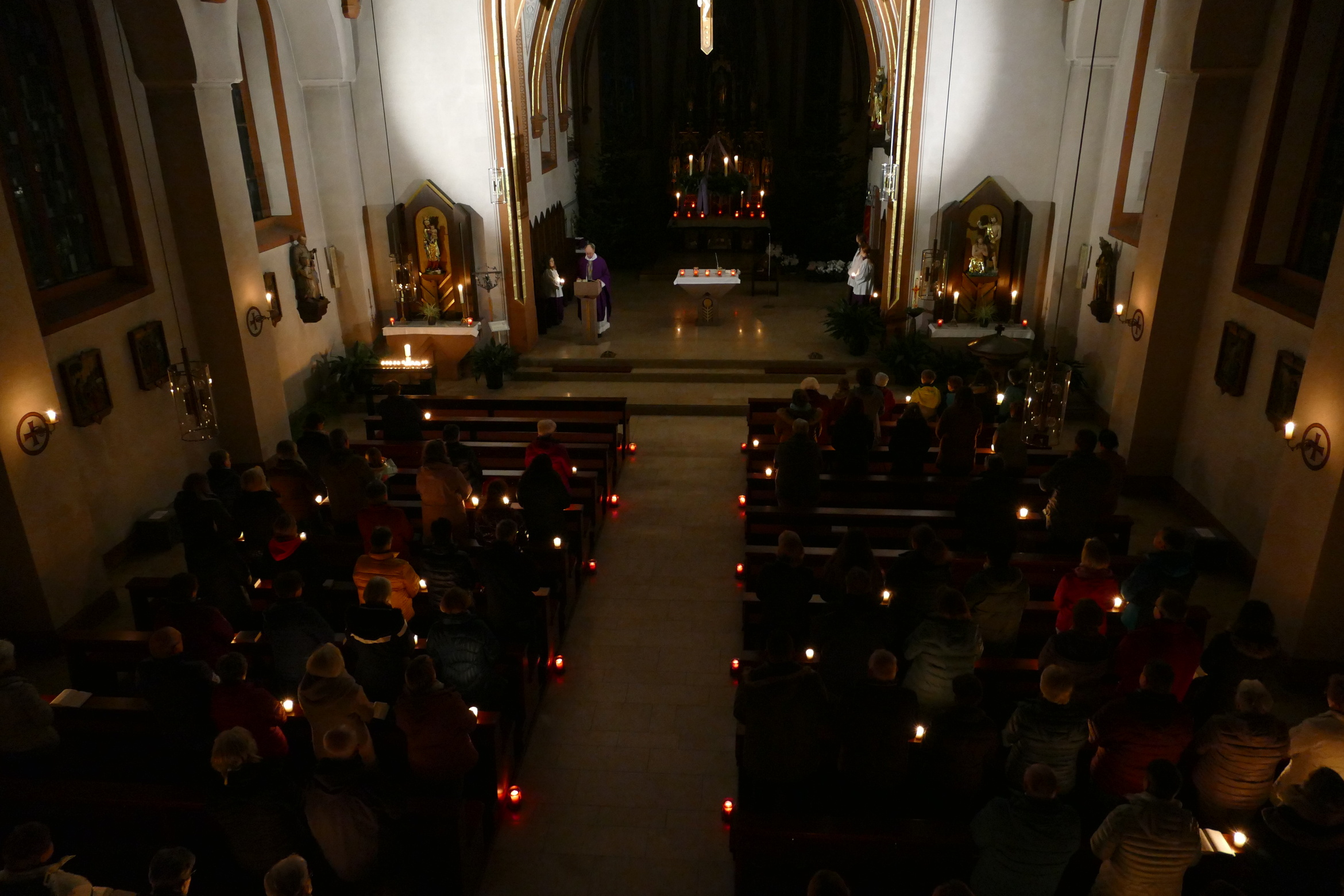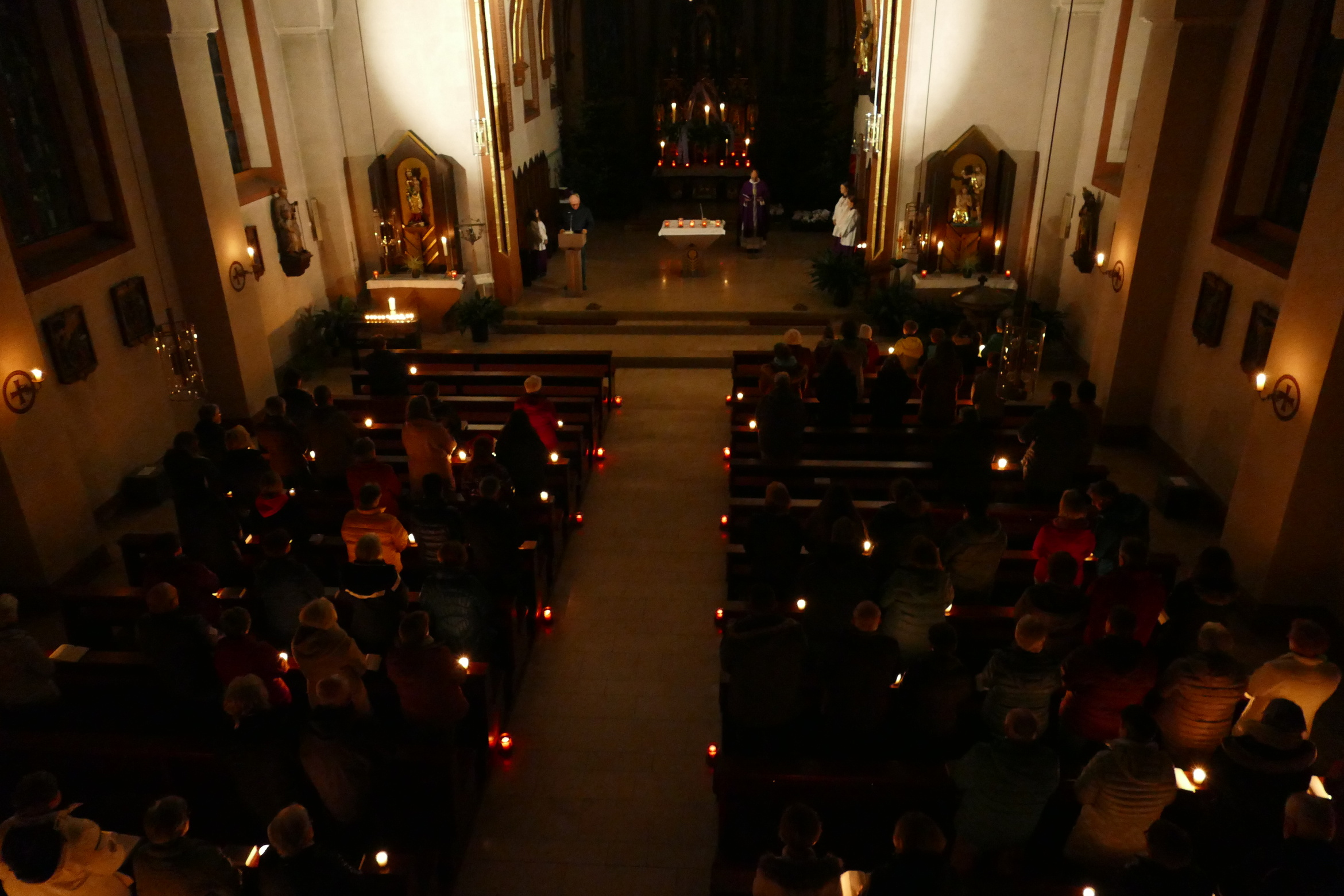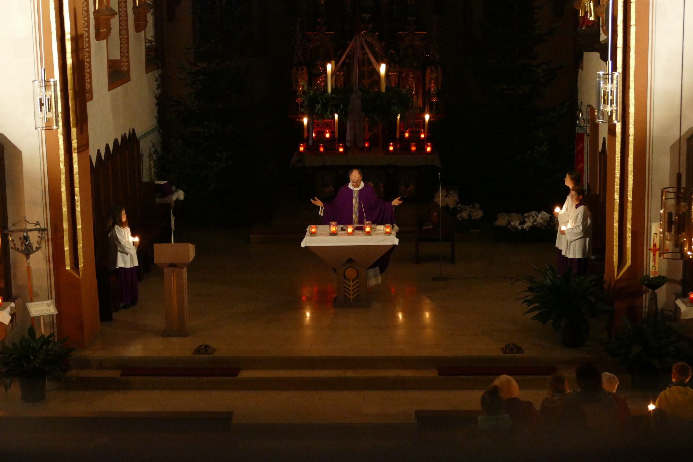 Feierlich umrahmt und mitgestaltet vom Weilbacher Kirchenblech wurde der dritte Rorate Gottesdienst in der Pfarrkirche Kirchzell. Im warmen Licht vieler Kerzen konnte Pfarrer Michael Prokschi zahlreiche Gottesdienstbesucher begrüßen, darunter auch viele Kommunionkinder mit den Familien, ebenso Mitfeierende aus dem ganzen pastoralen Raum Amorbach. Maria und Elisabeth, die Begegnung der beiden Frauen stand im Mittelpunkt der Gedanken als Impuls in den Tag.
