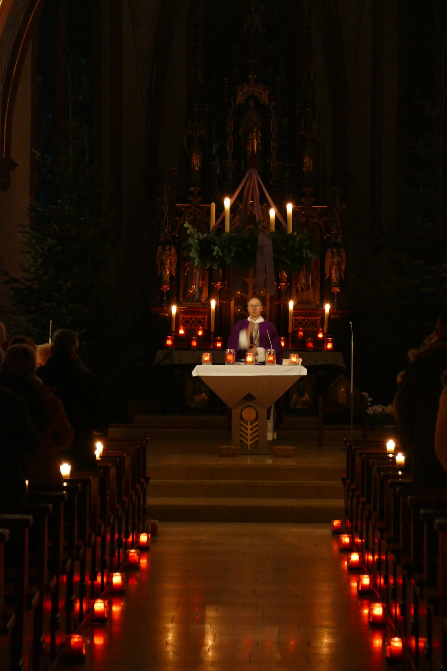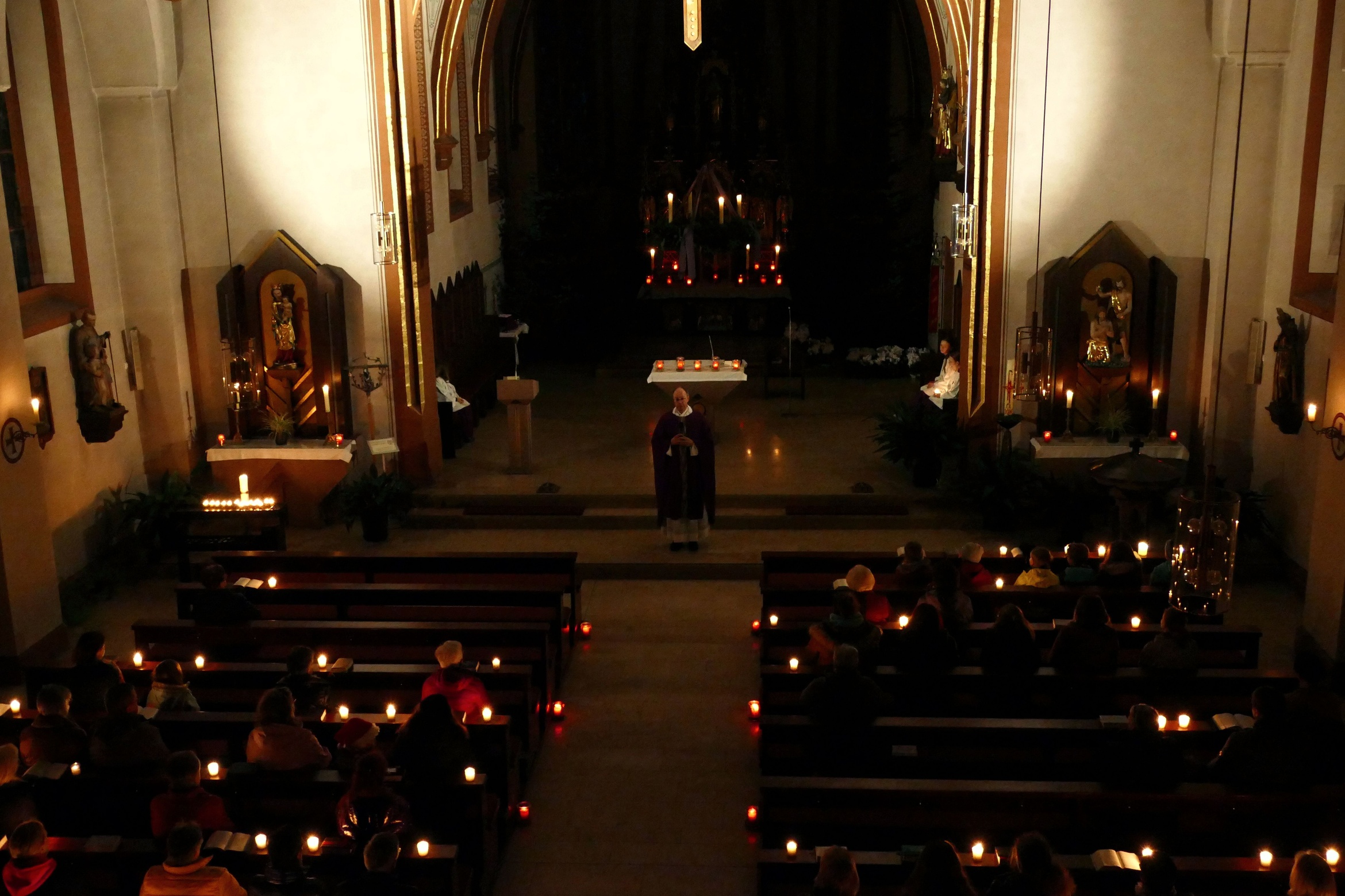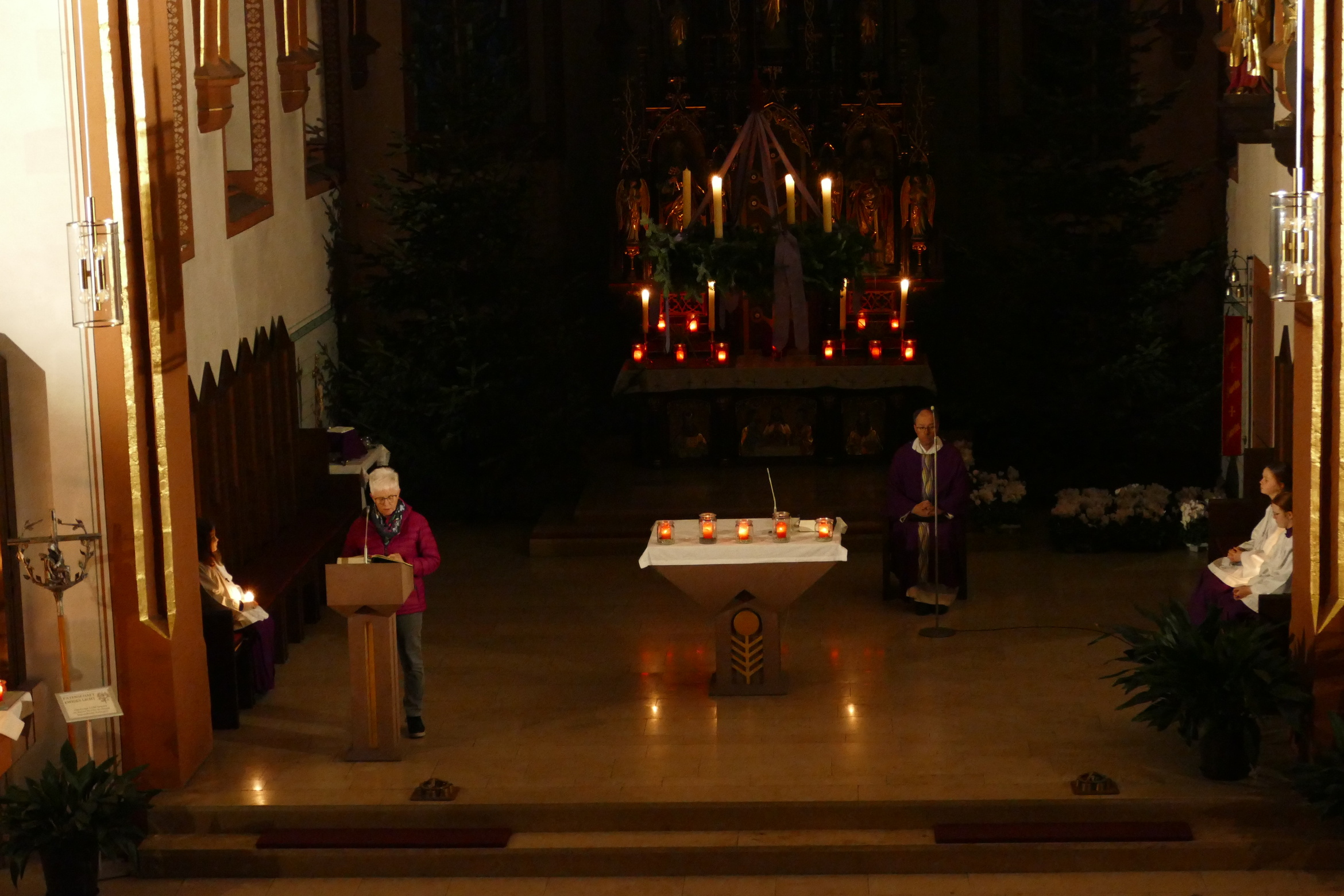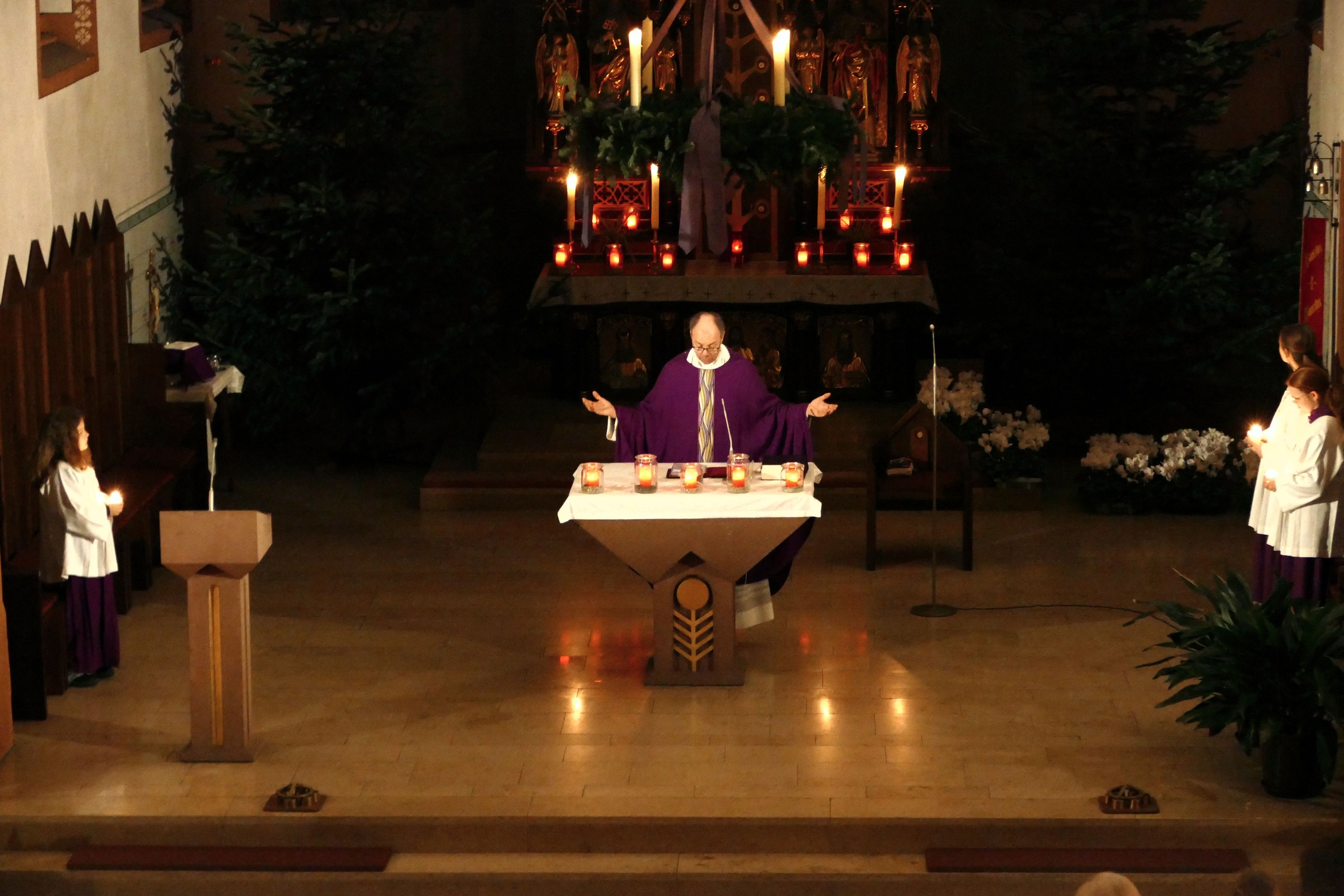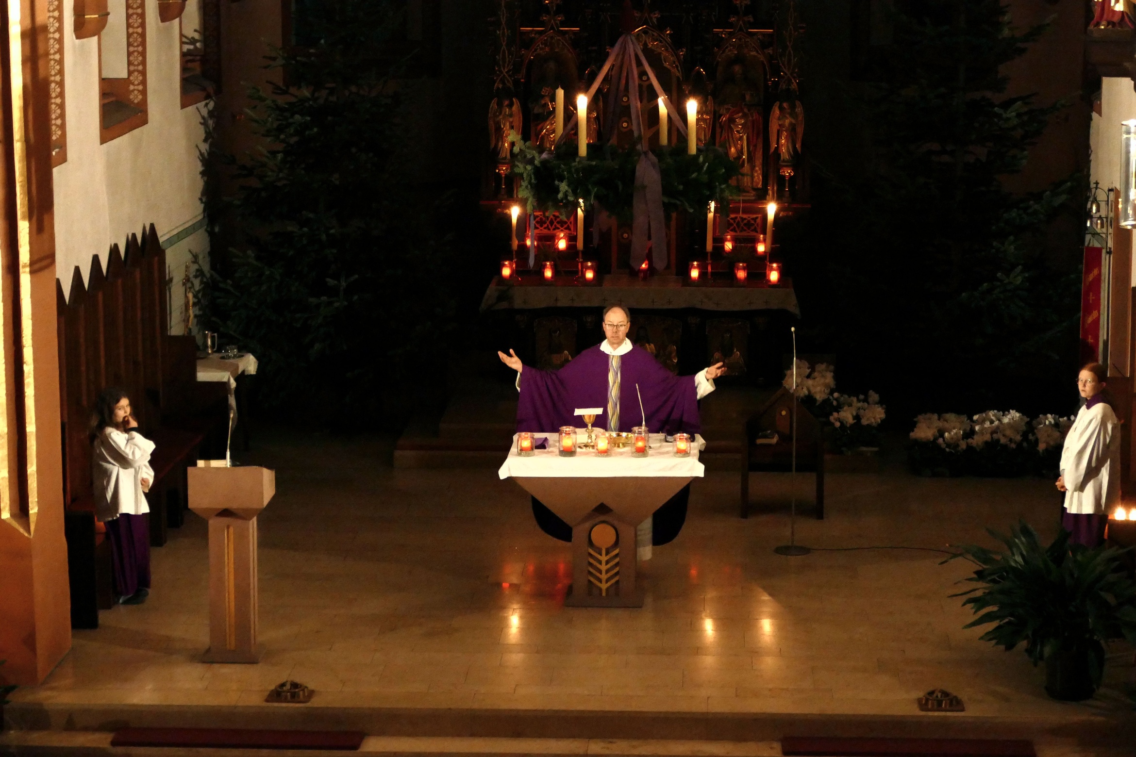 Feierlich umrahmt und mitgestaltet vom Weilbacher Kirchenblech wurde der dritte Rorate Gottesdienst in der Pfarrkirche Kirchzell. Im warmen Licht vieler Kerzen konnte Pfarrer Michael Prokschi zahlreiche Gottesdienstbesucher begrüßen, darunter auch viele Kommunionkinder mit den Familien, ebenso Mitfeierende aus dem ganzen pastoralen Raum Amorbach. Maria und Elisabeth, die Begegnung der beiden Frauen stand im Mittelpunkt der Gedanken als Impuls in den Tag.