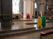 Die Fürbitten tragen Schülerinnen der Volkacher Mädchenrealschule vor. Währenddessen bringen Mitschülerinnen ihre ganz eigenen Bitten mit Körben voller Briefe zum Altar. Die Mädchen sind in bunte, glänzende Stoffe gehüllt, die sich mit ihrer satten Farbigkeit einreihen in die Komposition des Altarraumes. Nach den Fürbitten formieren sich die Schülerinnen. Ihre Gewänder beginnen im Takt zu schwingen. Leichtigkeit und Harmonie erfüllen den Raum. Mit ihrem liturgischen Tanz verleihen die Mädchen ihren Fürbitten einen noch tieferen Ausdruck. Obwohl über 1300 Menschen im Dom versammelt sind, ist es ganz still. Nur die Klänge der Instrumente und das Rauschen der Stoffe sind zu vernehmen. „Segne uns, dass wir ein Segen sind“, stimmt der Chor des Egbert-Gymnasiums an, und die Gemeinde singt aus voller Kehle mit. Was da mit modernen Rhythmen und mit deutschen, aber auch mit vielen lateinischen Texten erklingt, ist etwas ganz Besonderes: Es ist eine Welturaufführung.