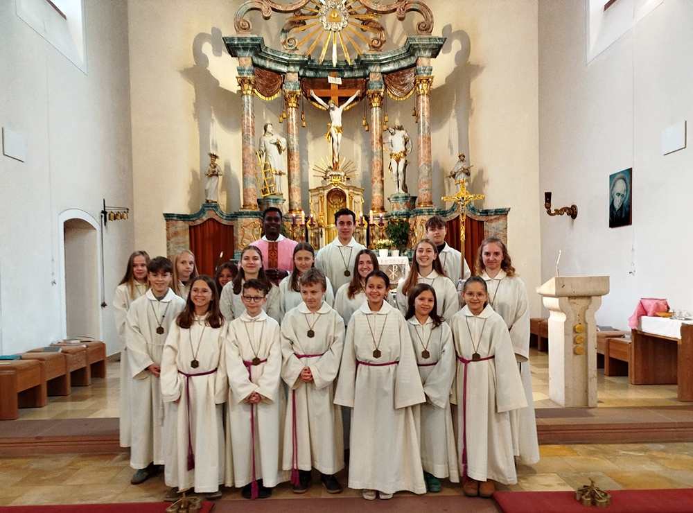 Anschließend überreichte die Leiterrunde die gesegneten Plaketten an die Neulinge als Symbol für die Zugehörigkeit zur Ministrantengemeinschaft. Alle Ministranten freuten sich gemeinsam mit Kaplan Napoleon Savariraj über die junge Unterstützung im Kirchendienst.