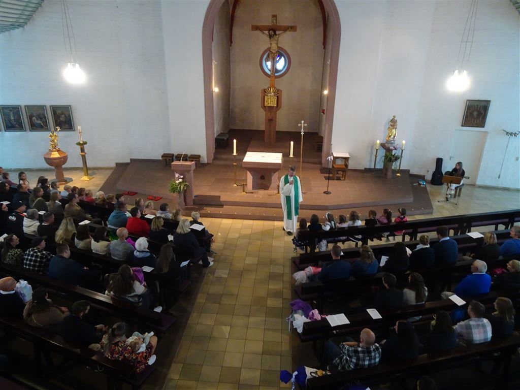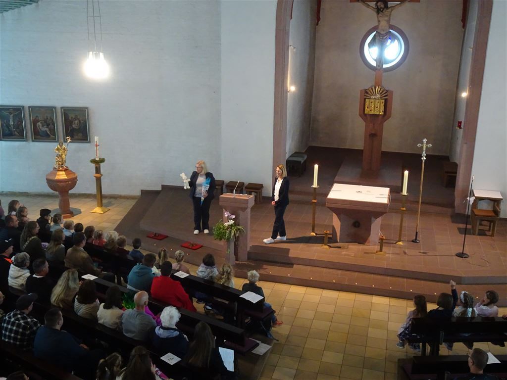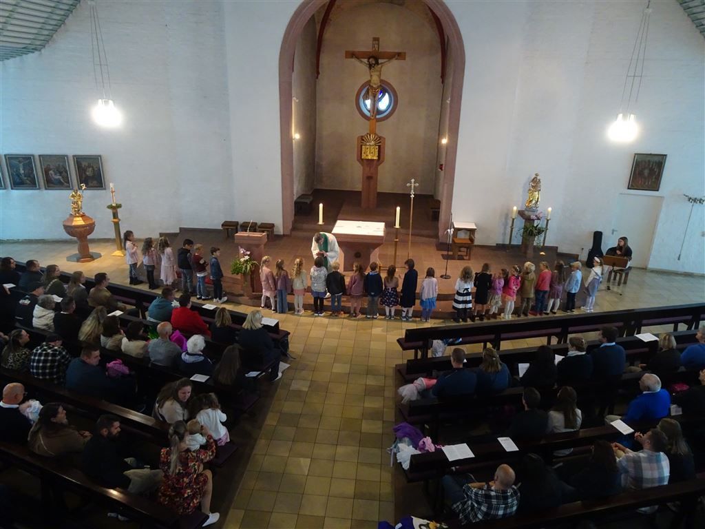 Schwer bepackt mit Schultasche und Schultüte marschierte die aufgeregte Kinderschar, zusammen mit ihren Familien, in den Kirchenraum. Dort wurden sie schon von den Lehrkräften und Pfr. Thoma erwartet und begrüßt. Nanu, die Lehrerinnen haben auch eine Schultüte mitgebracht, was da wohl alles drin ist? Gemeinsam durften die neuen Schulkinder schon mal reinspitzen und auspacken. Buntstifte kamen hervor, denn unsere Welt ist bunt und farbig. Ein Kuscheltier, als guter Freund, darf auch nicht fehlen und hoffentlich werdet ihr viele gute Freundschaften knüpfen. Süßigkeiten als Trost und Belohnung sind auch nicht schlecht. Ein Radiergummi wurde herausgezogen, der eure Fehler schnell verschwinden lässt. Für was ist denn ein Ball gut? Natürlich, für die Bewegung, Spiel und Spaß in unserer Schule. Muscheln, vom letzten Urlaub, kamen zum Vorschein, denn auch in der Schulzeit sollt ihr viele schöne Erinnerungen sammeln. Nun ist nichts mehr drin in der Schultüte, doch stopp, ein Marienkäfer kam noch herausgeflogen, schließlich braucht es auch Glück beim Lernen.