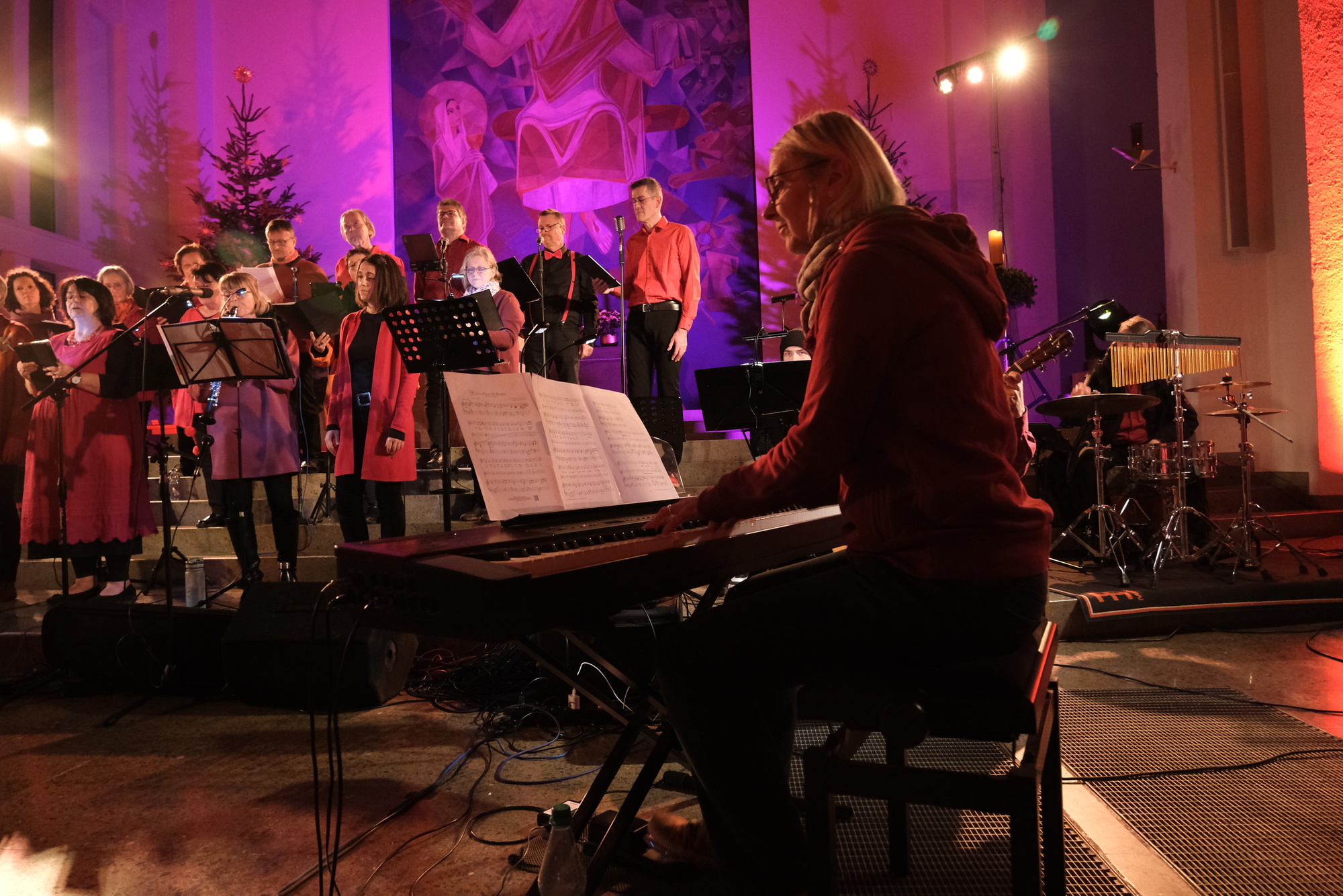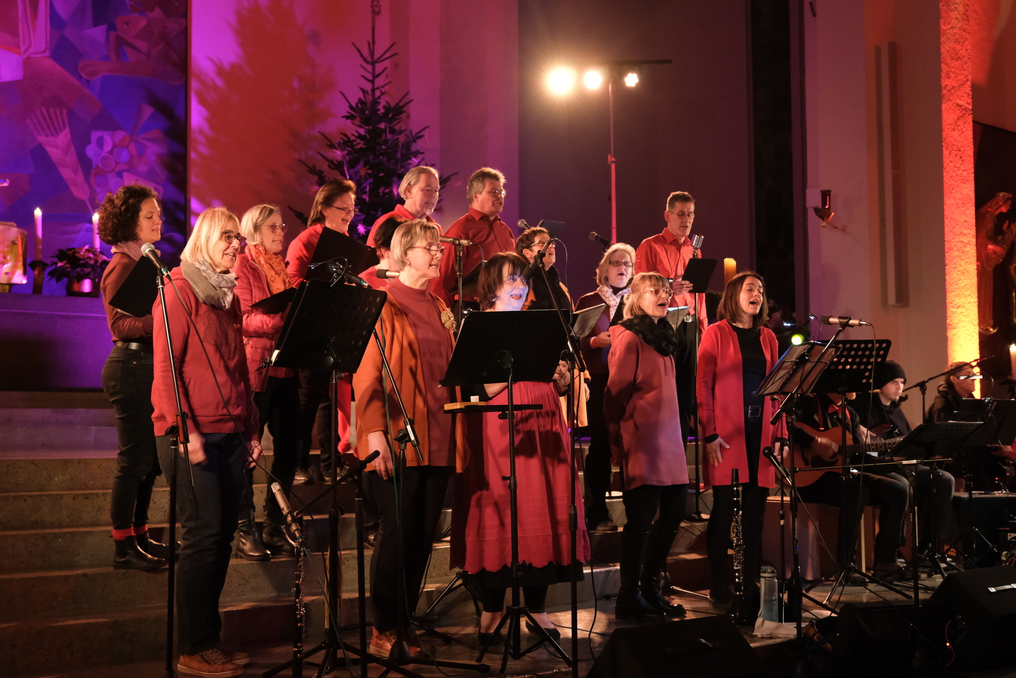 In diesem Jahr war das Repertoire der Lieder breit gestreut. Der Anfang bildete der Ruf „Macht die Tür zum Herzen weit“, wobei die Sängerinnen und Sänger wie zu einem Flashmob zusammen strömten, um dann gemeinsam einzustimmen. In den Liedern“ Notre âme attend“, „Menschen auf dem Weg durch die dunkle Nacht“, sowie das Lied „Die Nacht ist bald vorüber“, wurden die unterschiedlichen Instrumente klangreich eingesetzt. Das Herz steht für die Liebe. Und dies wurde durch die Lieder „Alles ist möglich, dem der liebt“, Love knows no borders und das Sololied „Für die Liebe“, das von Susanne Kunisch und Alexandra Beer-Kampfmann im harmonischen Duett gesungen wurde, wirklich zu einer Botschaft. Beeindruckend war der Text des großen Theologen Karl Rahner, dass „Gott sein letztes, tiefstes und schönstes Wort im Fleisch gewordenen Wort in die Welt hinein gesagt hat, ein Wort, das nicht mehr rückgängig gemacht werden kann, weil es Gottes endgültige Tat, weil es Gott selbst in der Welt ist. Und dieses Wort heißt: Ich liebe dich, du Welt und du Mensch.“ Und so war sicherlich eines der Höhepunkte des Konzertes das Arrangement des Liedes "Pride – in the name of Love", der irischen Popgruppe U 2.