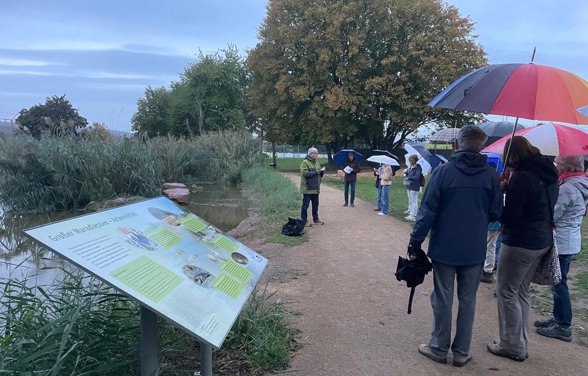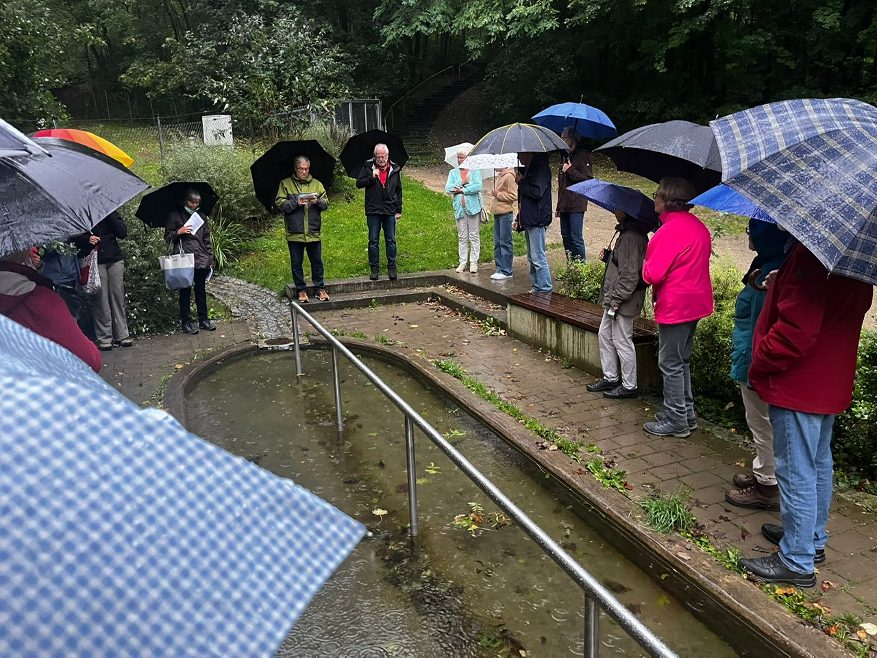 Trotz Regen waren zwanzig Personen zum spirituellen Abendspaziergang unter dem Motto „Zur Quelle gehen – Wasser ist Leben“ gekommen. Der katholische Pastorale Raum Marktheidenfeld hatte im Rahmen des Marktheidenfelder Klimabündnisses dazu eingeladen. Bernhard Elsesser, Rita und Ulrich Geißler übernahmen die inhaltliche Gestaltung, Christiane Römisch die musikalische Begleitung.