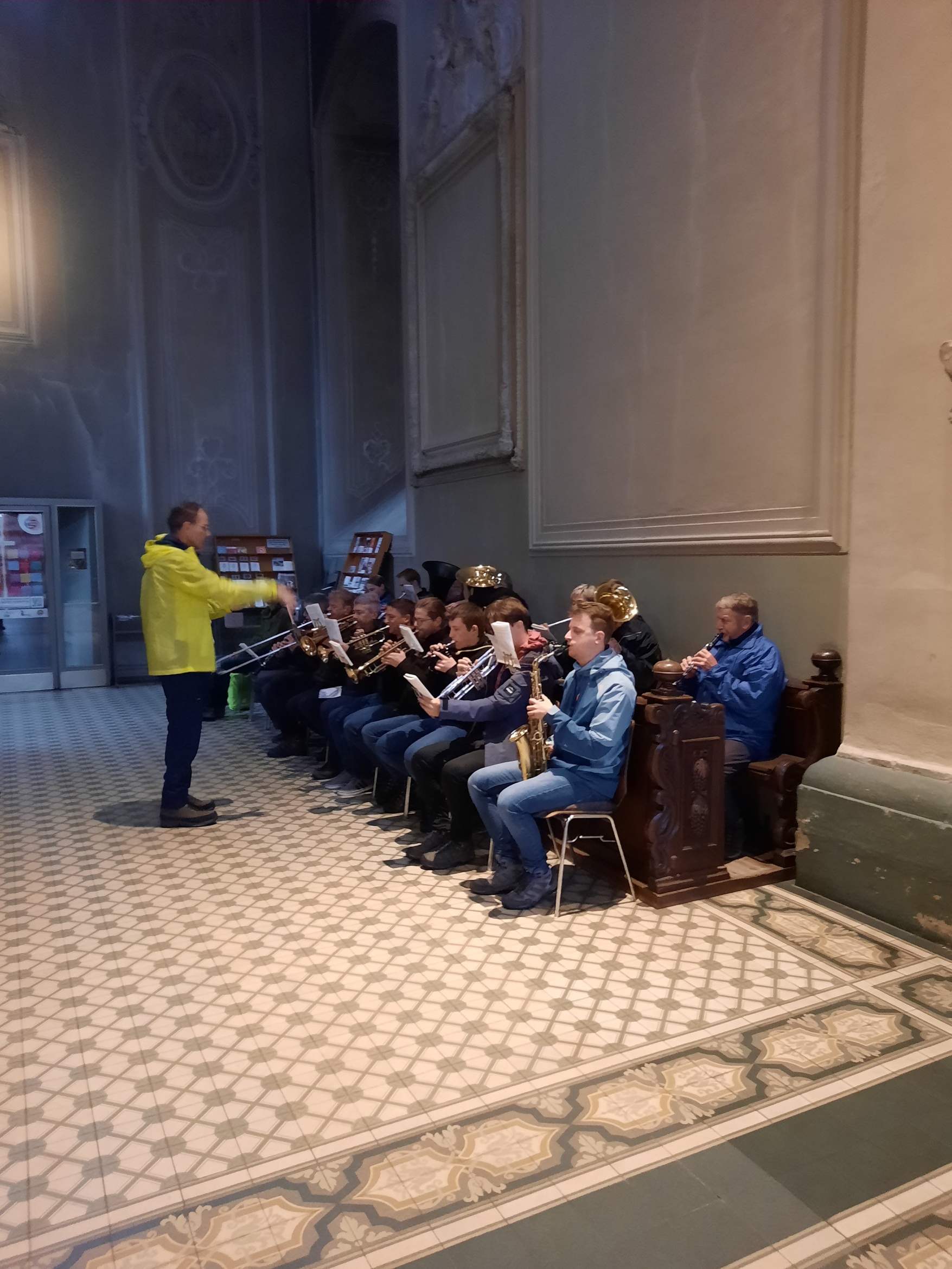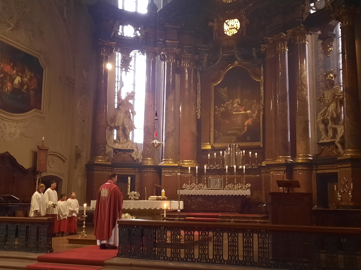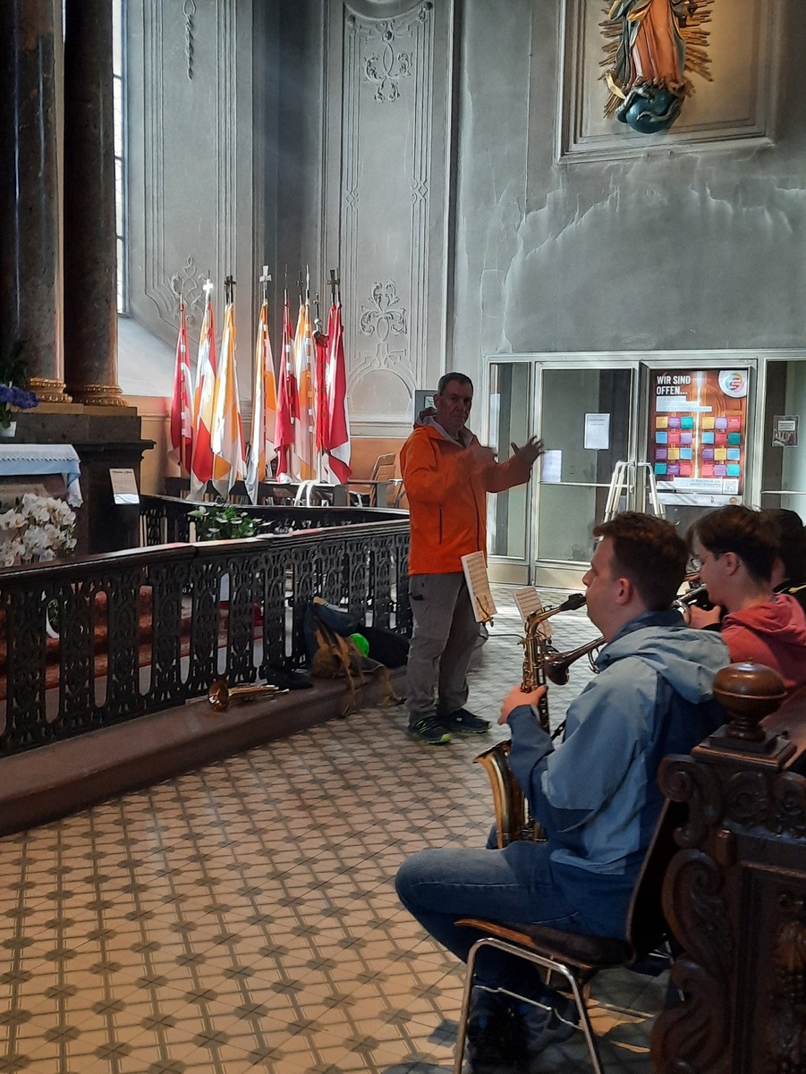 Dort begleiteten sie auch den Gottesdienst, den Pfarrer Jan Kölbel zelebrierte. Pfarrer Kölbel bedankte sich für Ihre musikalische Gestaltung, die zusammen mit den zahlreichen Ministranten den Gottesdienst wieder zu einem festlichen Ereignis machte. In seiner Predigt ging er auf den Leitgedanken ein, den die Walldürner Wallfahrtsleitung für dieses Jahr gewählt hatte: „Als Glaubende gehen wir unseren Weg, nicht als Schauende" (1Kor 5,7). Wallfahrten ist demnach mehr als nur sportliche Herausforderung, es setzt Glauben voraus und ist damit ein Glaubenszeugnis; wir zeigen als Christen, dass wir noch da sind und zu unserem Glauben stehen. Wallfahrten will unseren Glauben stärken, von einer Wallfahrt sollte man ein bisschen besser zurückkommen. Wir sind „nicht Schauende": Wie man bei der Wallfahrt das Ziel erst kurz vor Schluss sieht, das Ziel aber dennoch Kraft gibt, so müssen wir vieles im Glauben aushalten: persönliche Krisen und Schicksalsschläge, die Konflikte in der Welt, die Krise in der Kirche. Unser irdischer Pilgerweg hat auch ein Ziel: das himmlische Jerusalem, die Herrlichkeit von Gottes Reich, darauf gehen wir im Glauben zu. Pfarrer Kölbel erinnerte daran, dass eine Wallfahrt nicht nur anstrengend ist, sie hat auch viele schöne Momente: Naturerlebnis, Zusammenhalt, Pausen und Geselligkeit. Entsprechend gibt es auch „auf der Pilgerfahrt des Lebens“ immer wieder einen Vorgeschmack auf den Himmel, wir sollten diese Momente dankbar annehmen und aus ihnen Kraft für unseren Glaubensweg schöpfen.