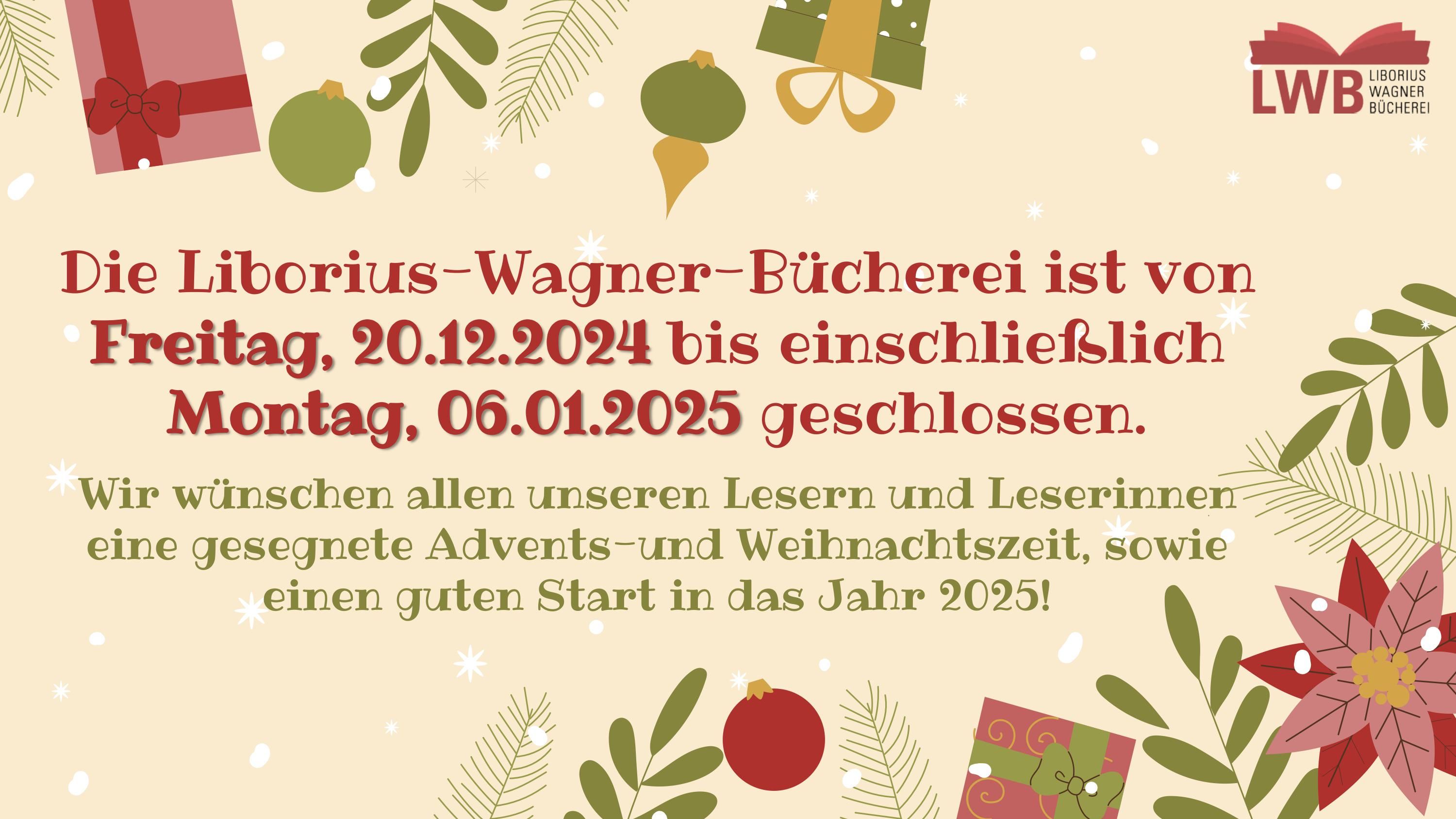 Die Liborius-Wagner-Bücherei ist vom 20.12.2024 bis einschließlich 06.01.2025 geschlossen.