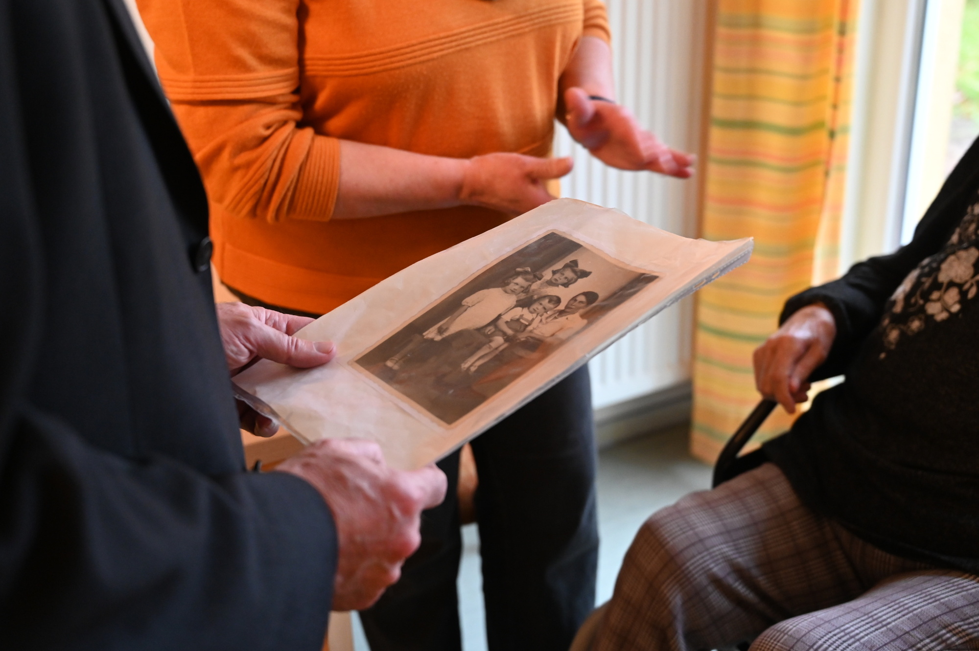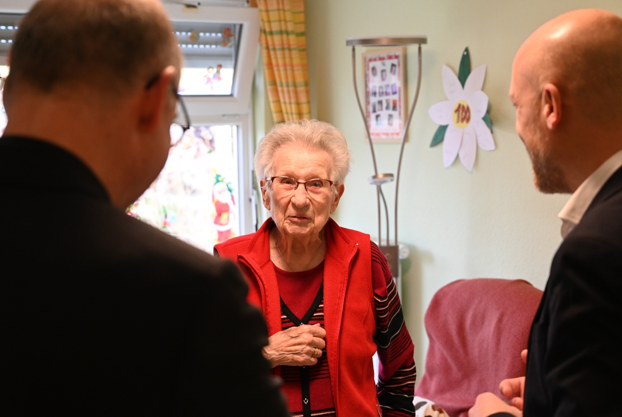 Im Anschluss besichtigte er das Haus, sprach das Tischgebet auf den drei Wohnbereichen und besuchte einige Bewohnende auf ihren Zimmern. Mit Gertrud Göpfert (88) sah er sich alte Familienfotos an. An den Betten zweier besonders auf Pflege Angewiesener betete er. Und mit Klara Müller lachte der Bischof herzhaft: Auf ihr langes Leben angesprochen erwiderte die 100-Jährige trocken, es habe sich „teils teils“ gelohnt. „Gute Zeiten, schlechte Zeiten“, meinte Jung – und beide lachten. Zum Abschied sagte die alte Dame: „Es ist sehr schön, dass Sie mich besucht haben.“ Und damit sprach sie sicher auch für das ganze Haus.