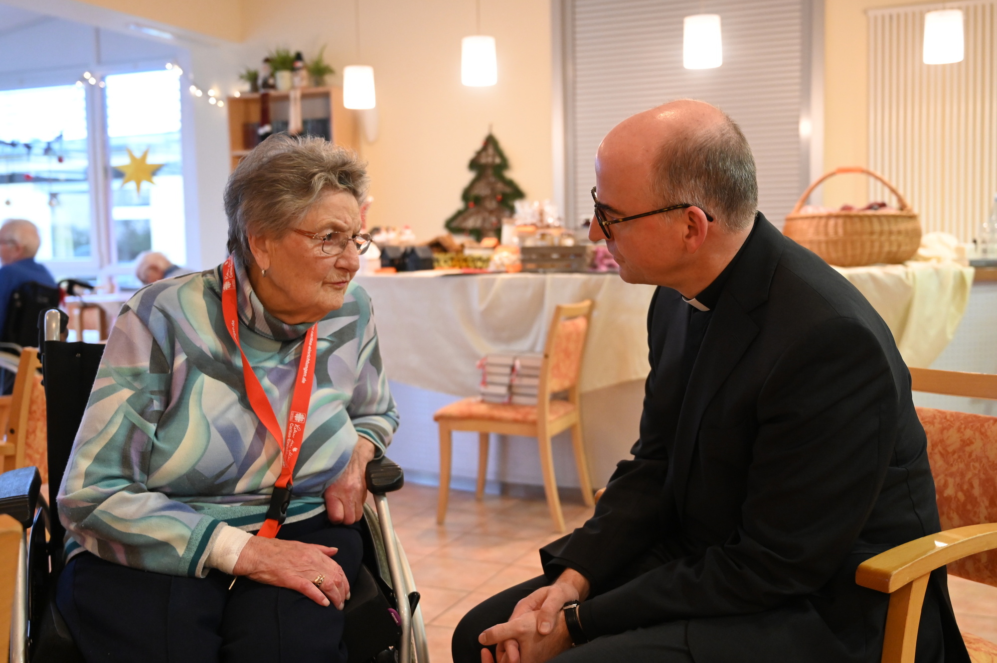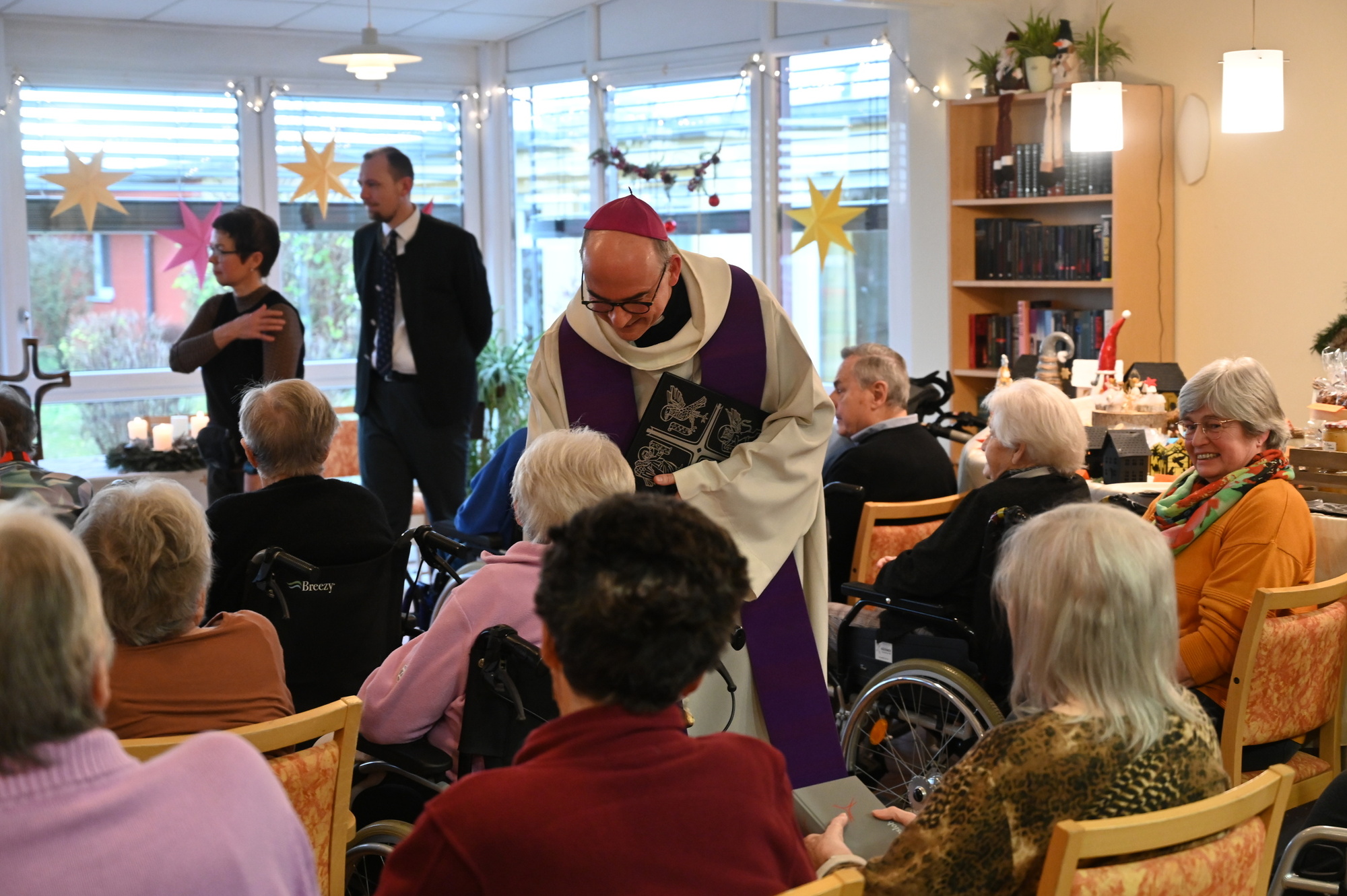 Jeder Mensch kenne dunkle Stunden, sagte der Bischof in der Andacht mit Diakon Klaus Solik. Die Grenzen des Lebens könnten einem bisweilen zu schaffen machen, etwa wenn die Kräfte im Alter nachließen. Doch: „Gott wird in der dunkelsten Nacht geboren“, erklärte Jung. Mit seinem Licht kehre Hoffnung in die Herzen zurück. Später erteilte der Bischof den Segen und wünschte allen 57 Bewohnerinnen und Bewohnern sowie Einrichtungsleiterin Nina Bauer und ihrem Team ein „frohes Fest“.