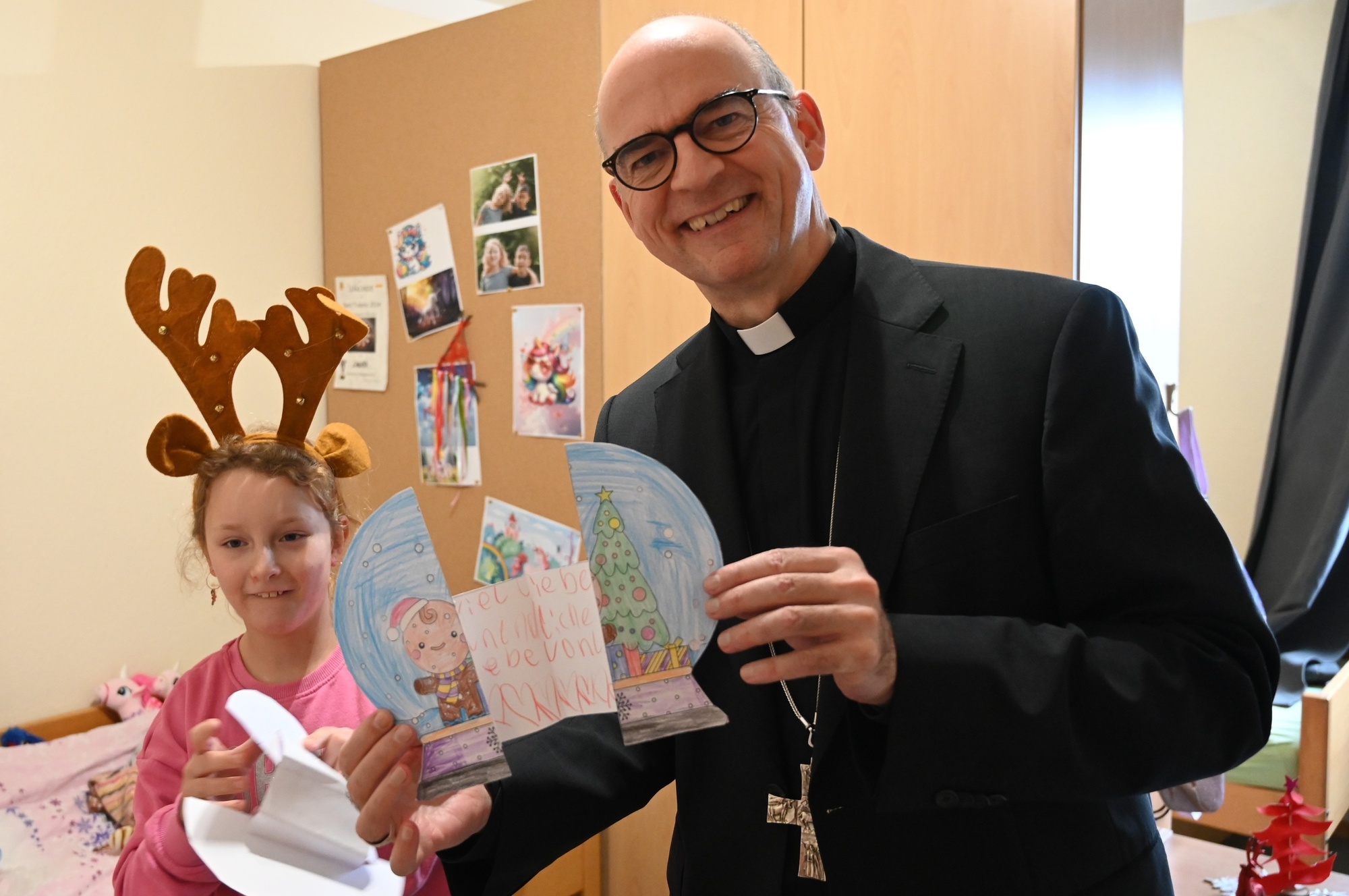 Die neunjährige Laura, die den Besuch des Bischofs „cool“ fand, zeigte ihm neben dem Wohnzimmer später noch ihr Zimmer – natürlich inklusive der selbstgebastelten Weihnachtskarten auf ihrem Schreibtisch. Anschließend gab es einen kurzen Rundgang durch das Zentrum, an dem auch Vorsitzender Kilian Hartmann und Geschäftsführer Frank Kupfer-Mauder vom OKCV Schweinfurt teilnahmen.