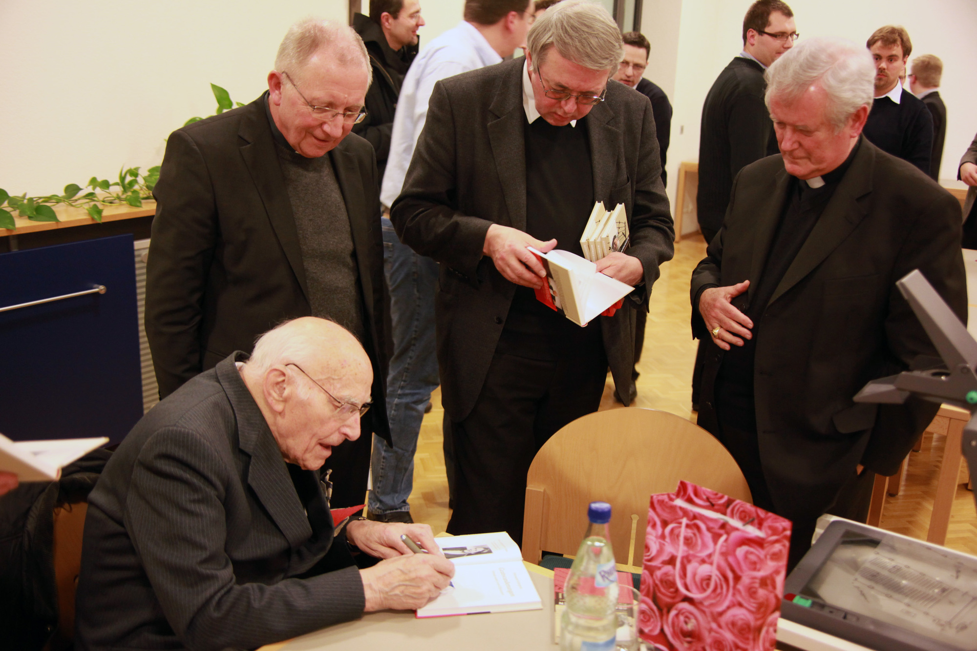 Würzburg/Münsterschwarzach (POW) Wer Prälat Hermann Scheipers zuhört, muss genau hinhören. Er redet leise, aber überzeugt von seiner schwersten Zeit im Leben. Für ihn ist es ein Wunder, überlebt zu haben. Der 97-Jährige war von 1941 bis 1945 im Konzentrationslager Dachau gefangen und lebte in derselben Stube wie Pfarrer Georg Häfner, der am 15. Mai im Würzburger Kiliansdom seliggesprochen wird. Am Mittwoch, 12. Januar, war Scheipers zu Besuch im Egbert-Gymnasium in Münsterschwarzach. Vor den Schülern, die derzeit die Aufführung eines Oratoriums zu Häfners Leben vorbereiten, berichtete er von seinen schrecklichen Erlebnissen.
